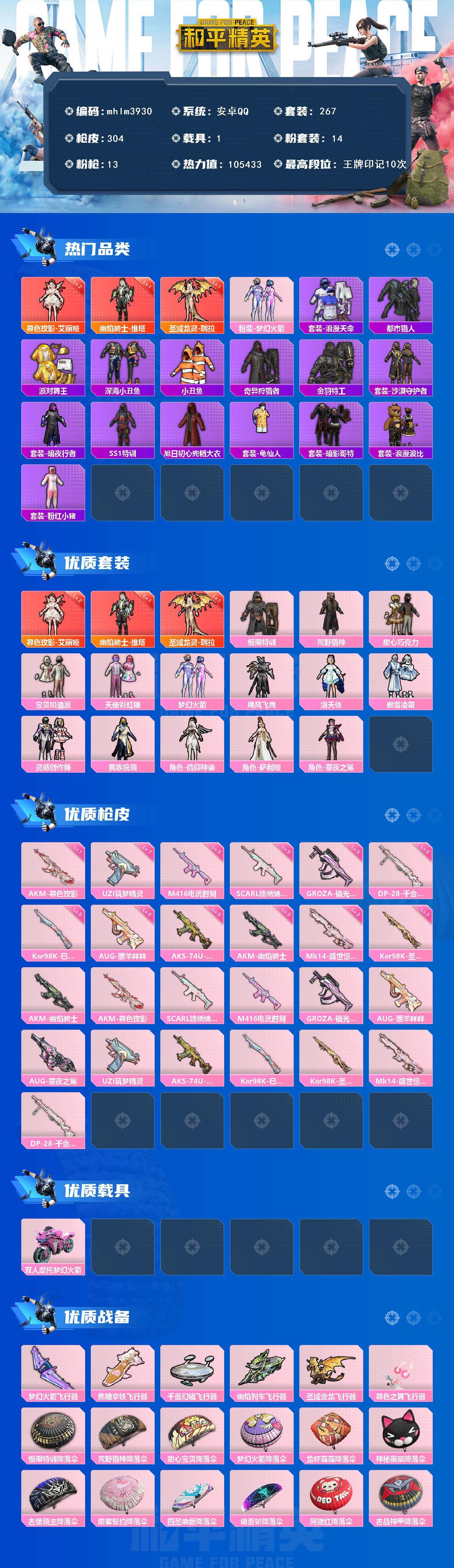 【mhlm3930】安卓 手Q-3神装-14粉装-13特效枪-1载具-6粉色飞行器-105433热力值-10王牌印记-267套装-304枪皮