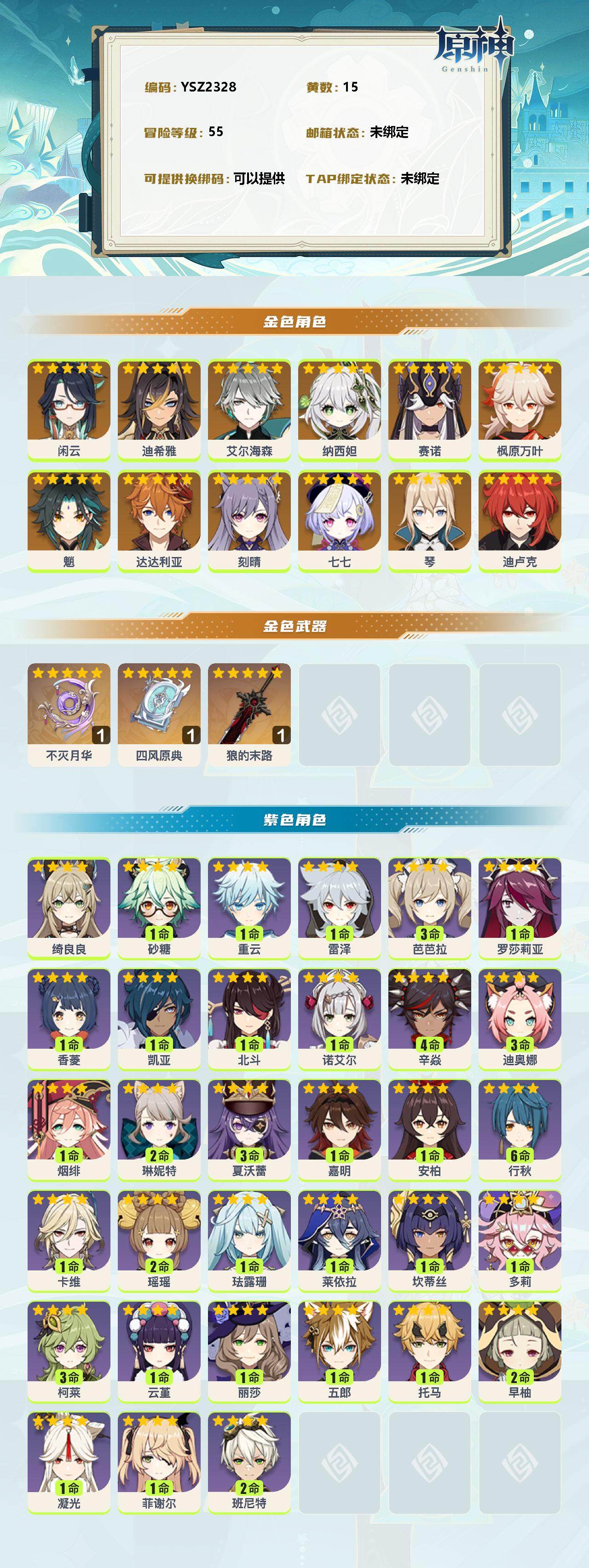 【YSZ2328】55级/15黄/男主/12个五星角色/3个五星武器/闲云/迪希雅/艾尔海森/纳西妲/赛诺/枫原万叶/魈/达达利亚/刻晴/七七/琴/迪卢克/不灭月华/四风原典/狼的末路/绮良良/砂糖/1命重云/雷泽/3命芭芭拉/1命罗莎莉亚/1命香菱/1命凯亚/1命北斗/1命诺艾尔/4命辛焱/3命迪奥娜/1命烟绯/2命琳妮特/3命夏沃蕾/嘉明/1命安柏/满命行秋/卡维/2命瑶瑶/1命珐露珊/莱依拉/坎蒂丝/多莉/3命柯莱/云堇/0命丽莎/0命五郎/0命托马/2命早柚/1命凝光/0命菲谢尔/2命班