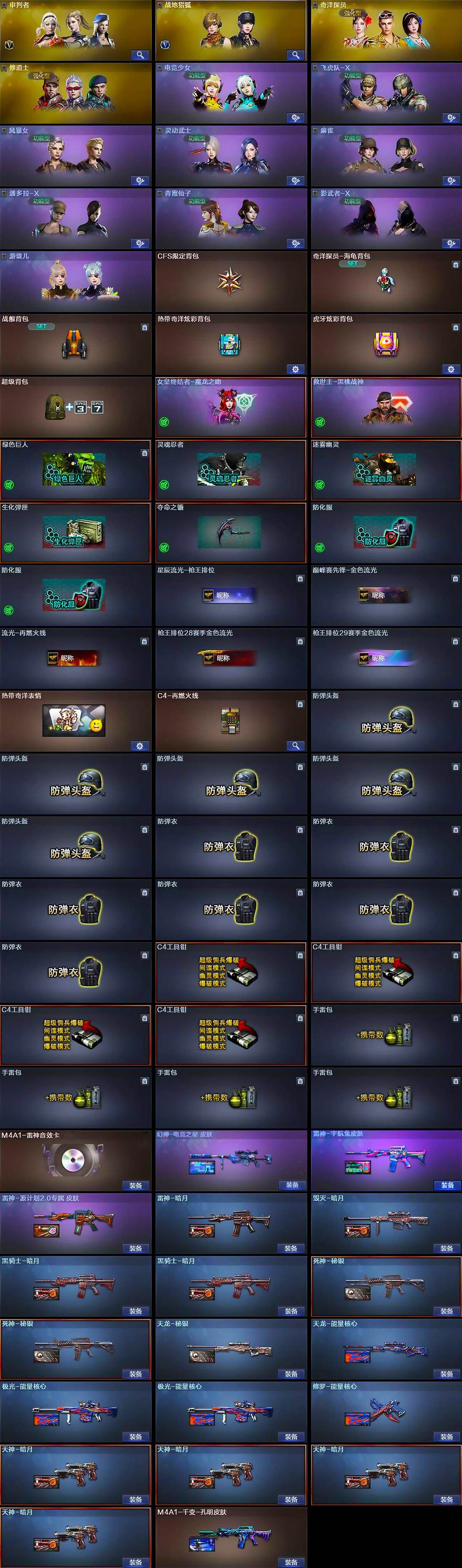 【皮肤】:幻神-电竞之星 皮肤,雷神-暗月,雷神-宇航兔皮肤,雷神-源计划2.0专属 皮肤,毁灭-暗月,毁灭-英雄计划 皮肤,M4A1-千变-孔明皮肤,黑骑士-暗月*2,死神-秘银*2,天龙-秘银,天龙-能量核心,极光-能量核心*2,修罗-能量核心,天神-暗月*4