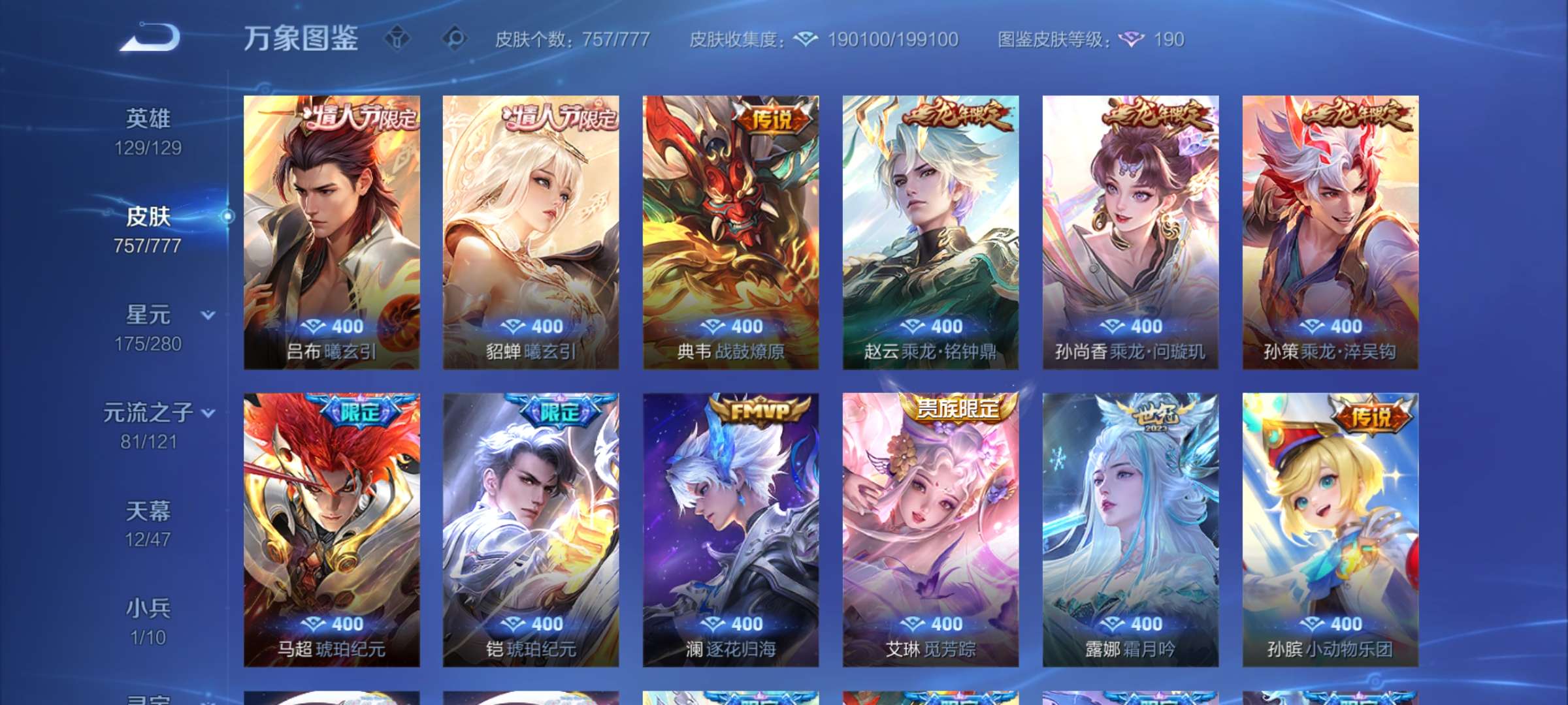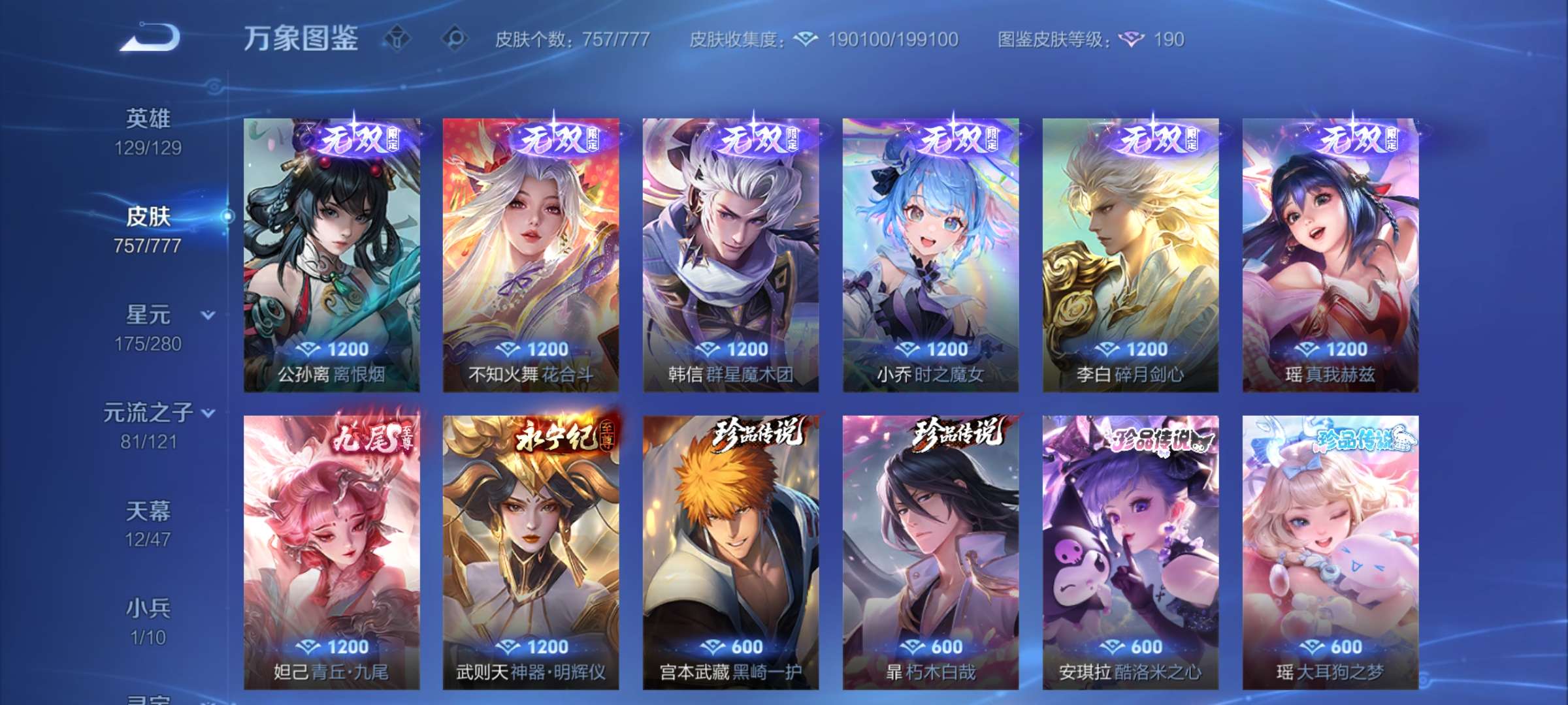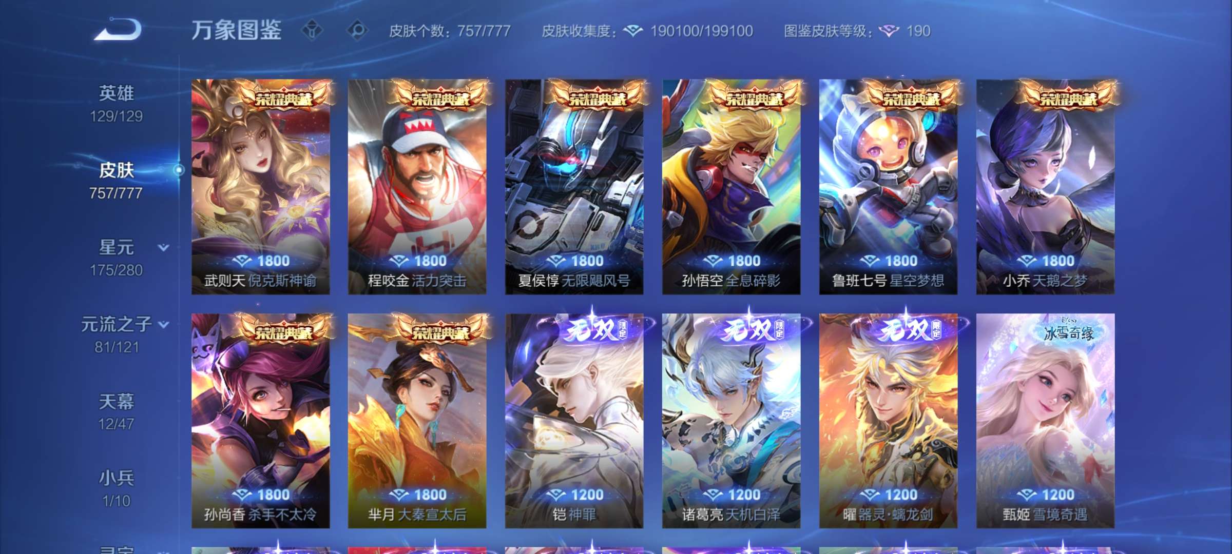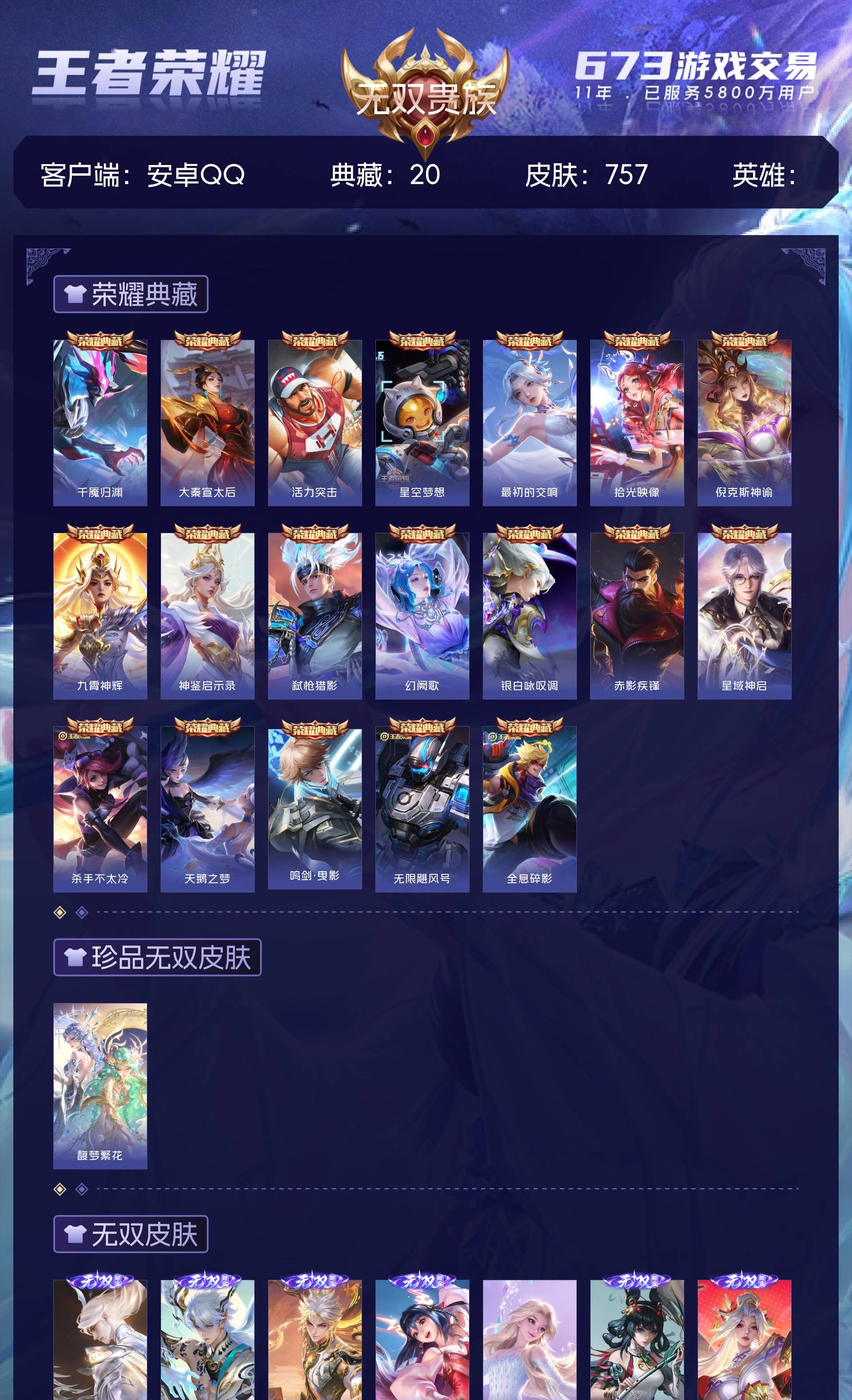 无双贵族 皮肤757 至尊星耀 荣耀典藏20 珍品无双1 无双皮肤12 珍品传说9 星传说22 传说