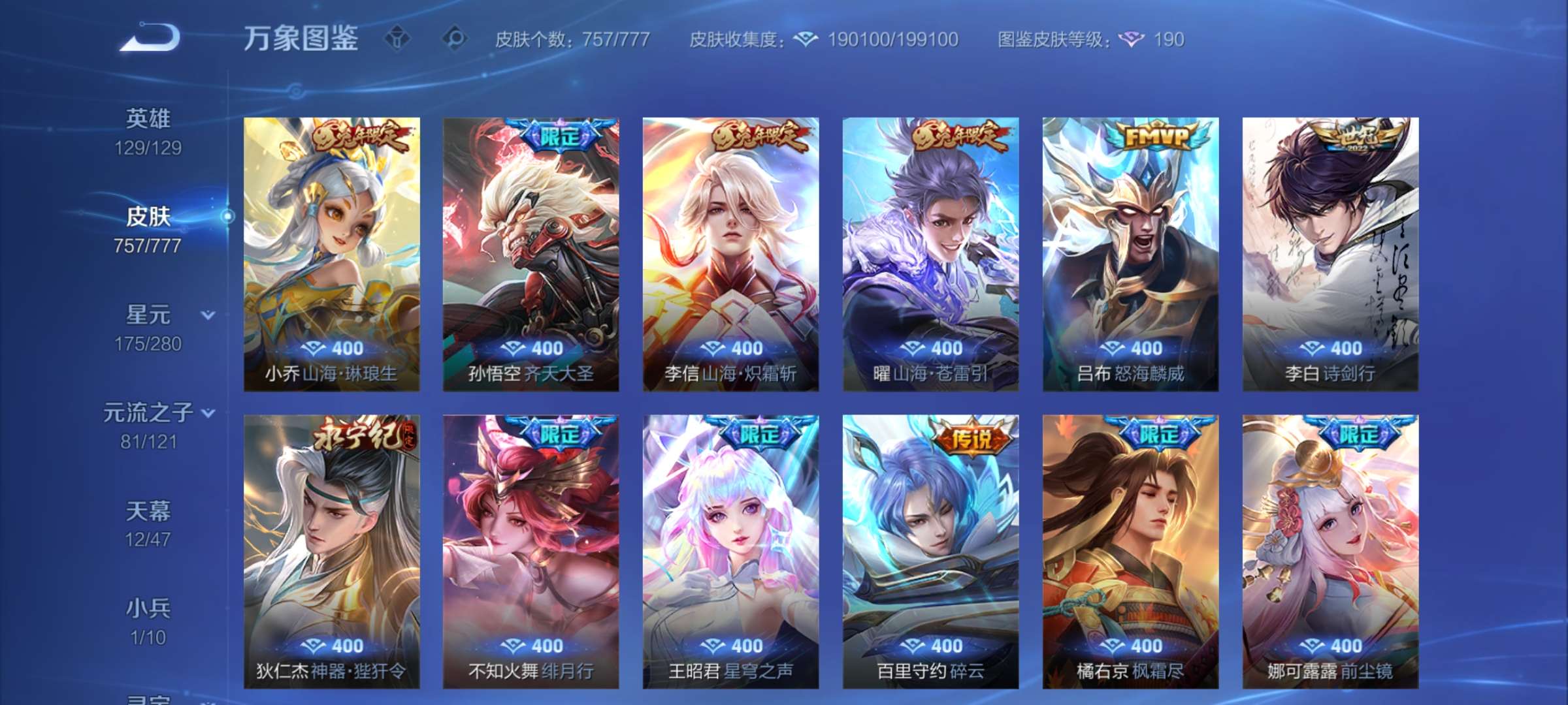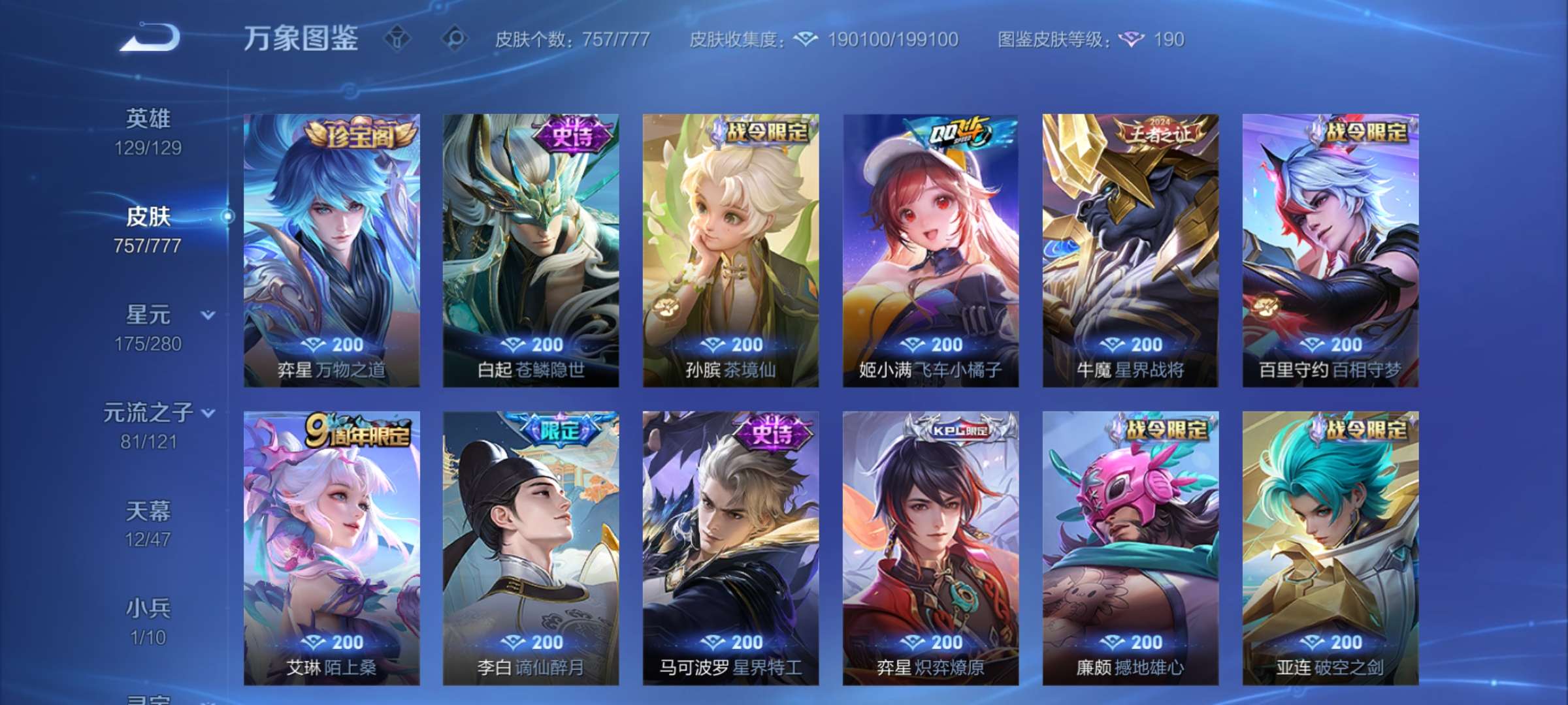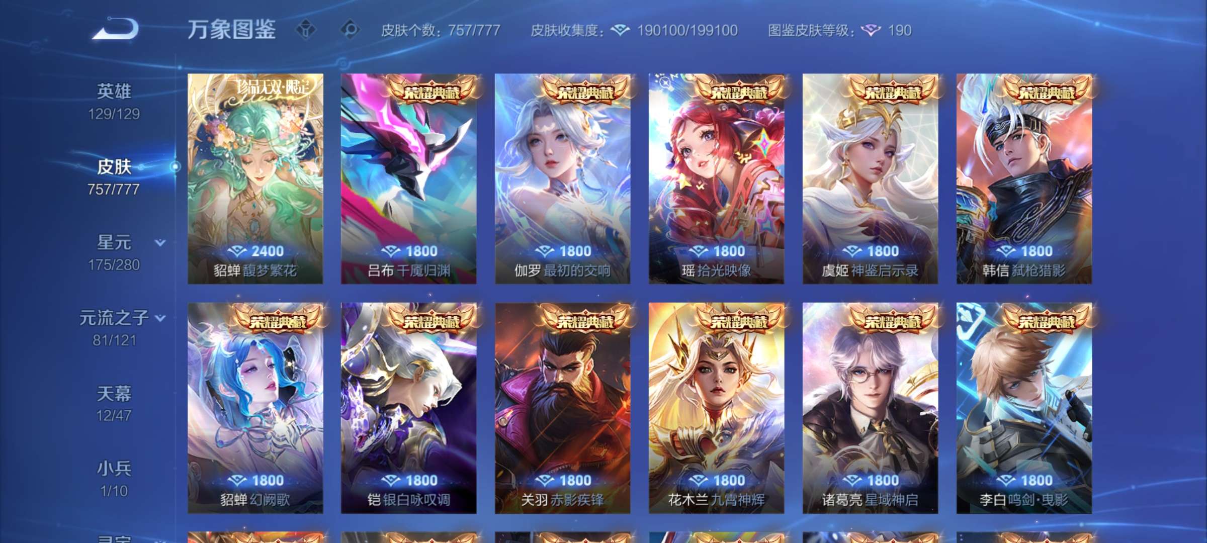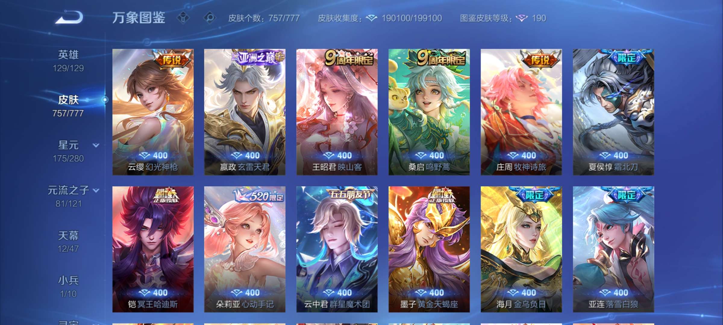 无双贵族 皮肤757 至尊星耀 荣耀典藏20 珍品无双1 无双皮肤12 珍品传说9 星传说22 传说