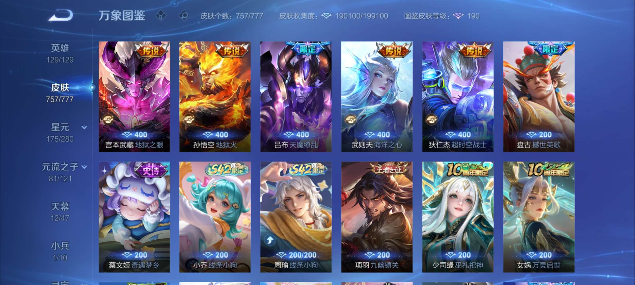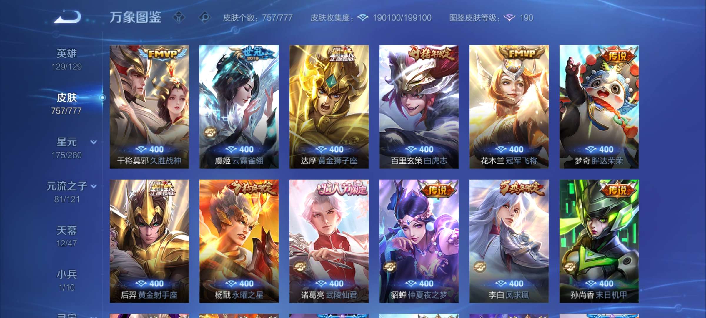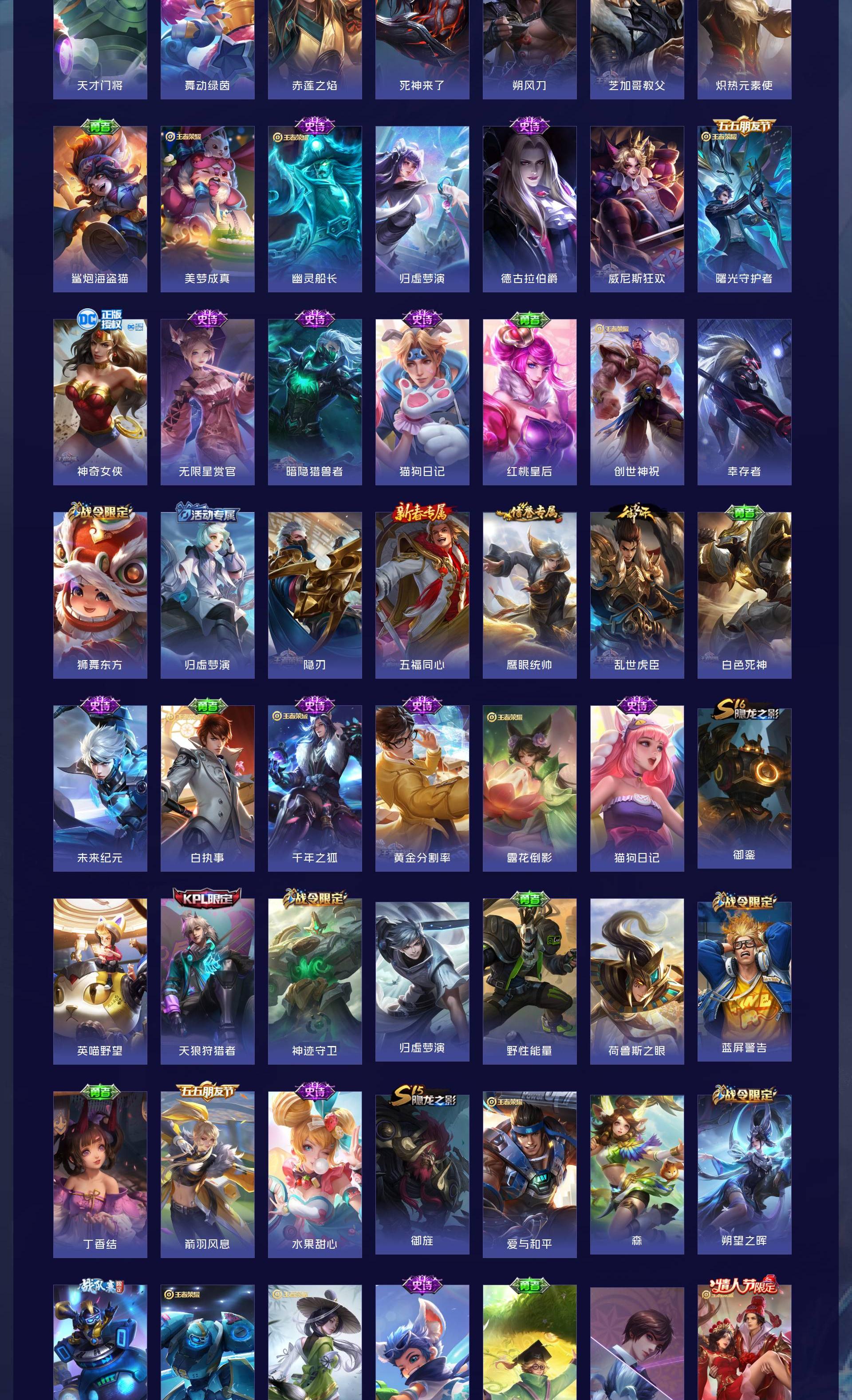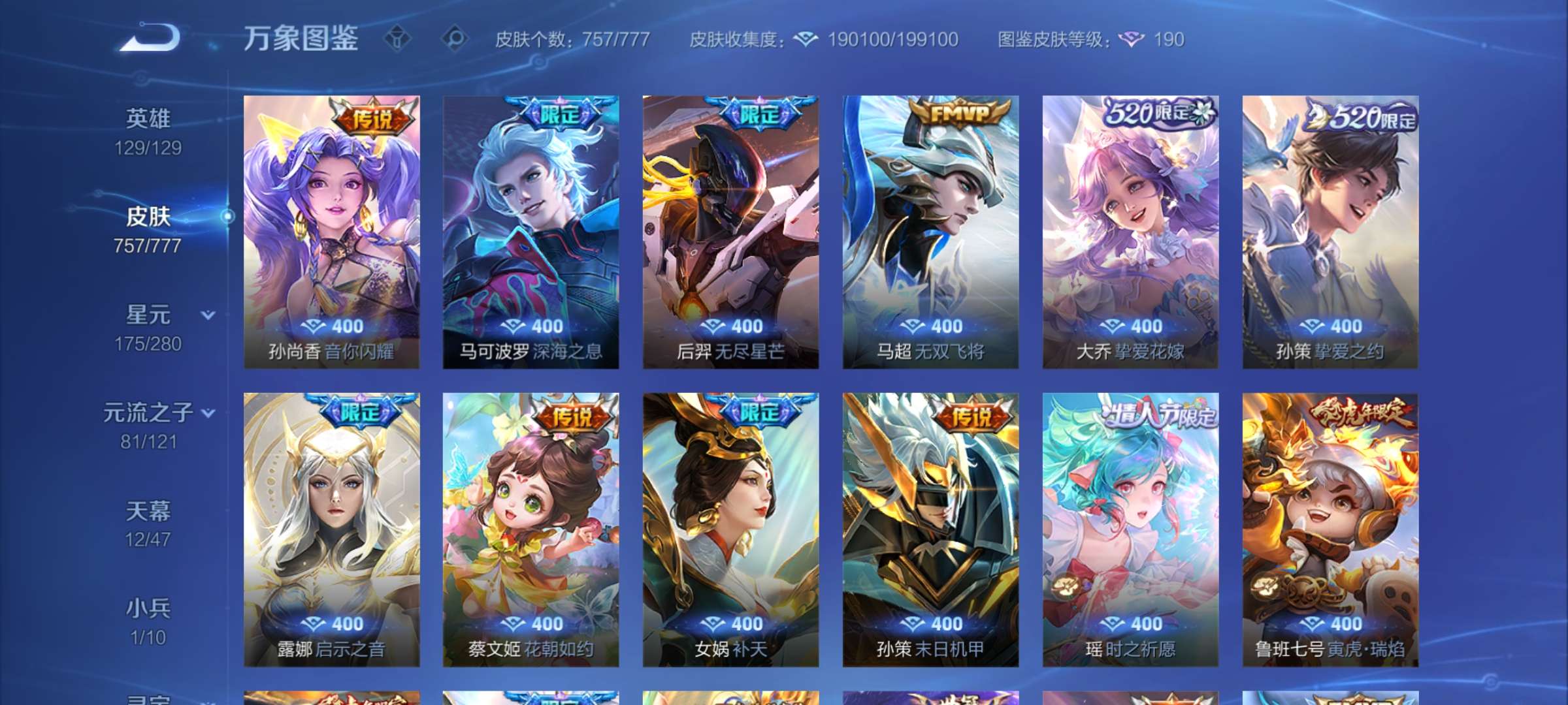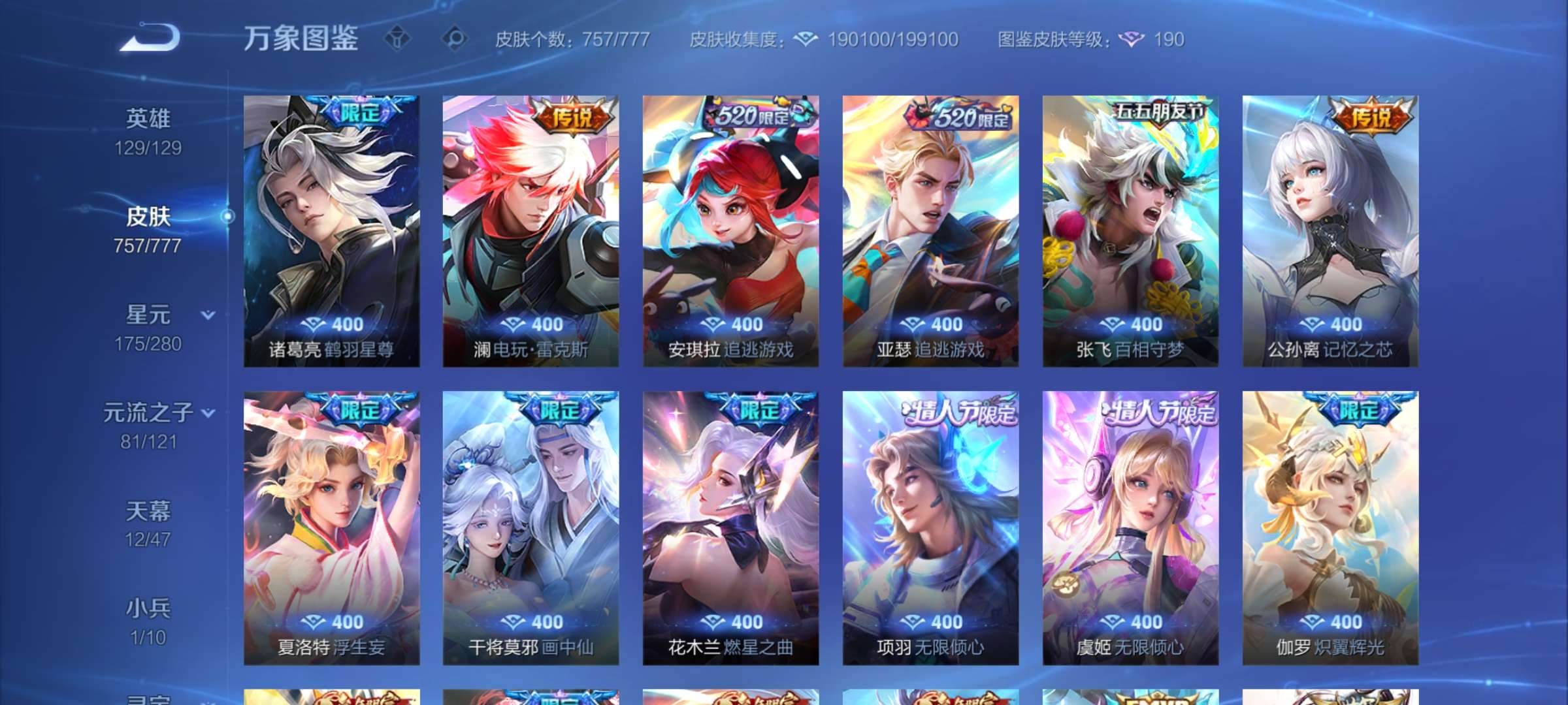 无双贵族 皮肤757 至尊星耀 荣耀典藏20 珍品无双1 无双皮肤12 珍品传说9 星传说22 传说