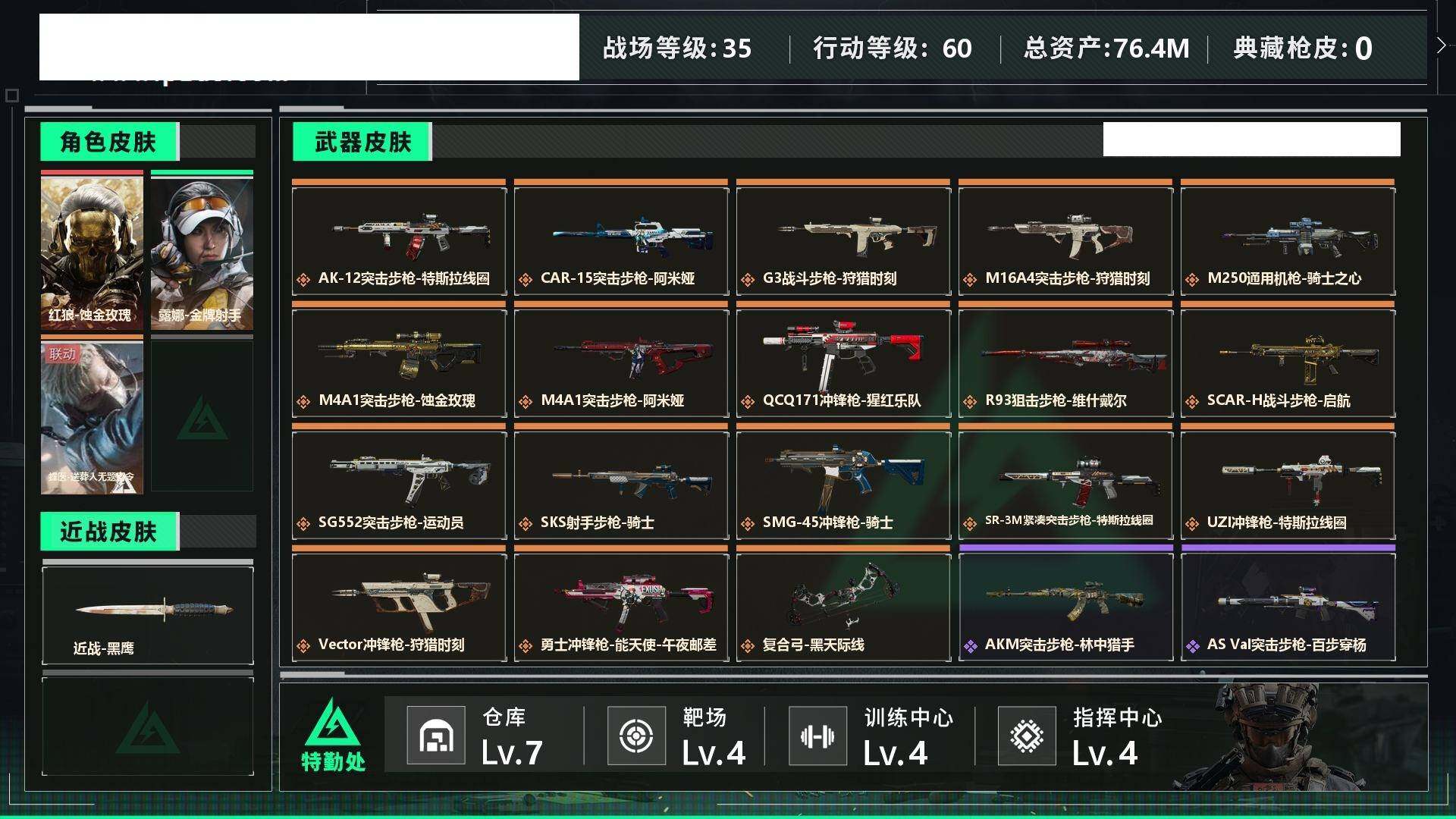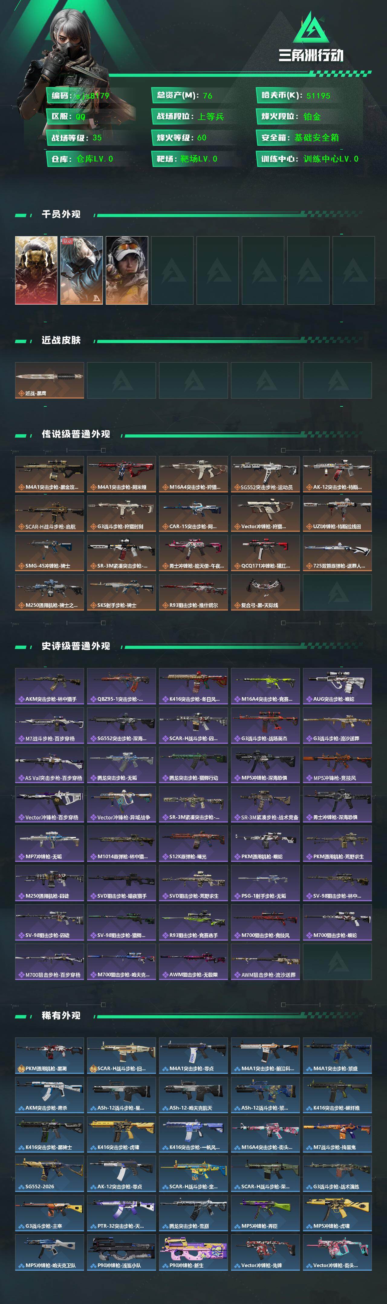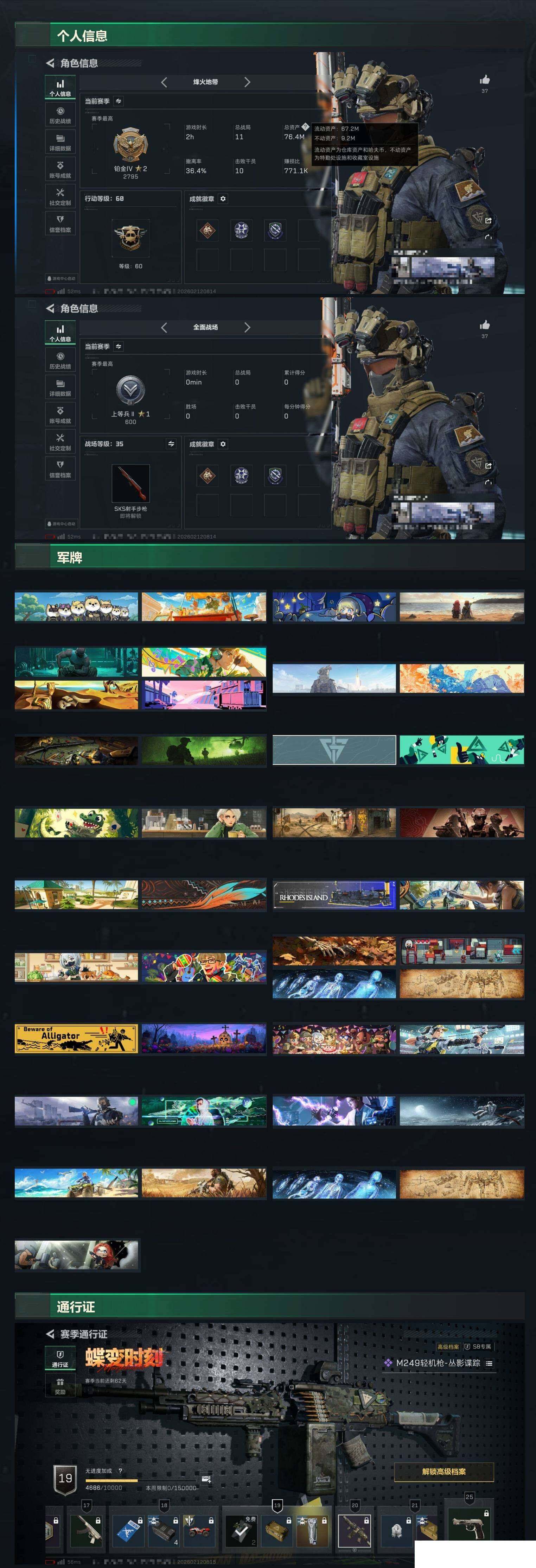 总资产 76m 红狼 烽火地带段位: 铂金 全面战场段位: 上等兵 总资产: 76000000 哈夫币: 51195000