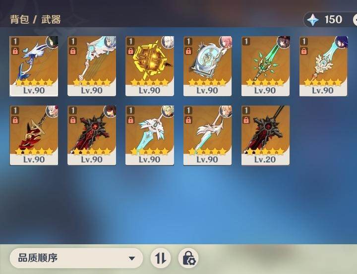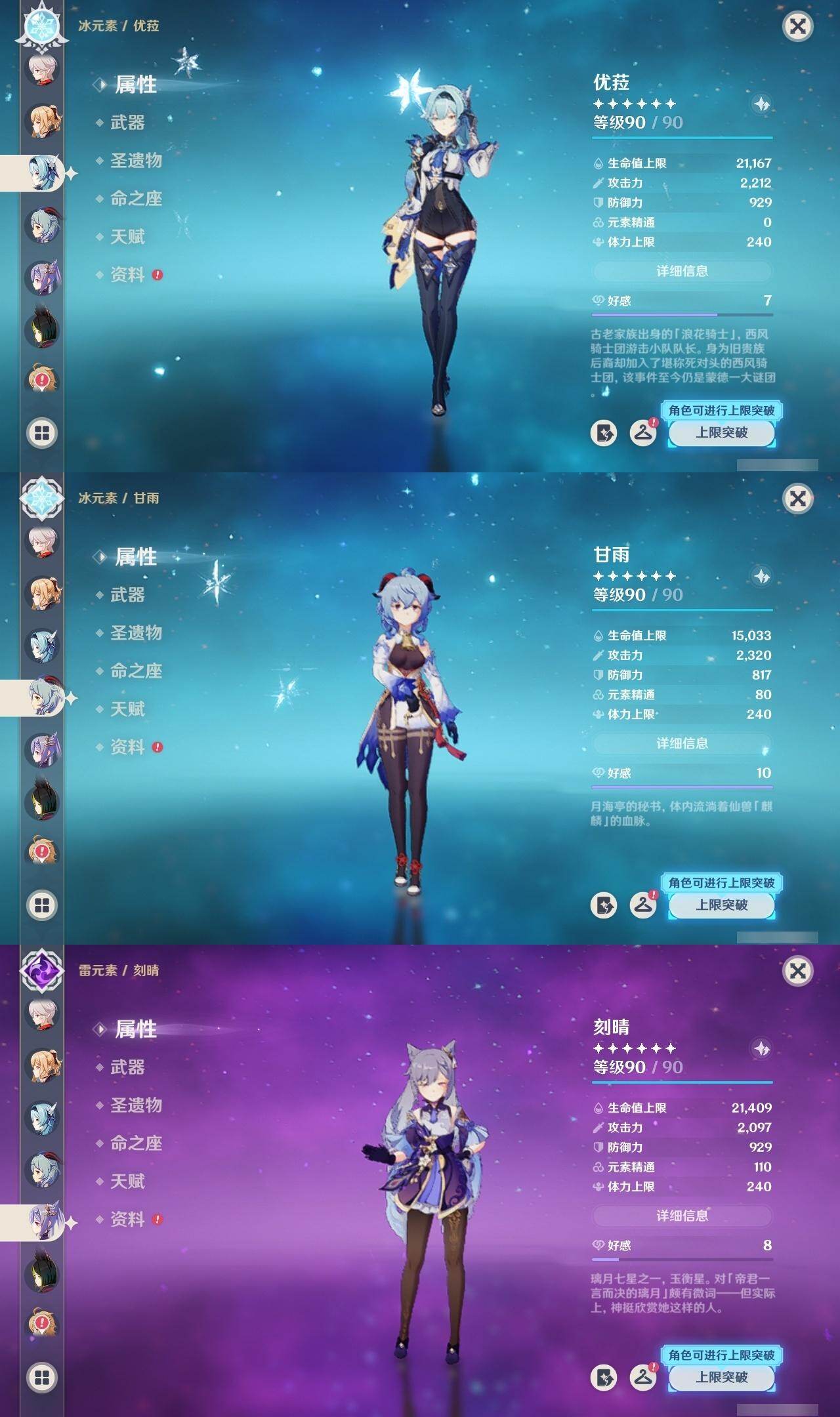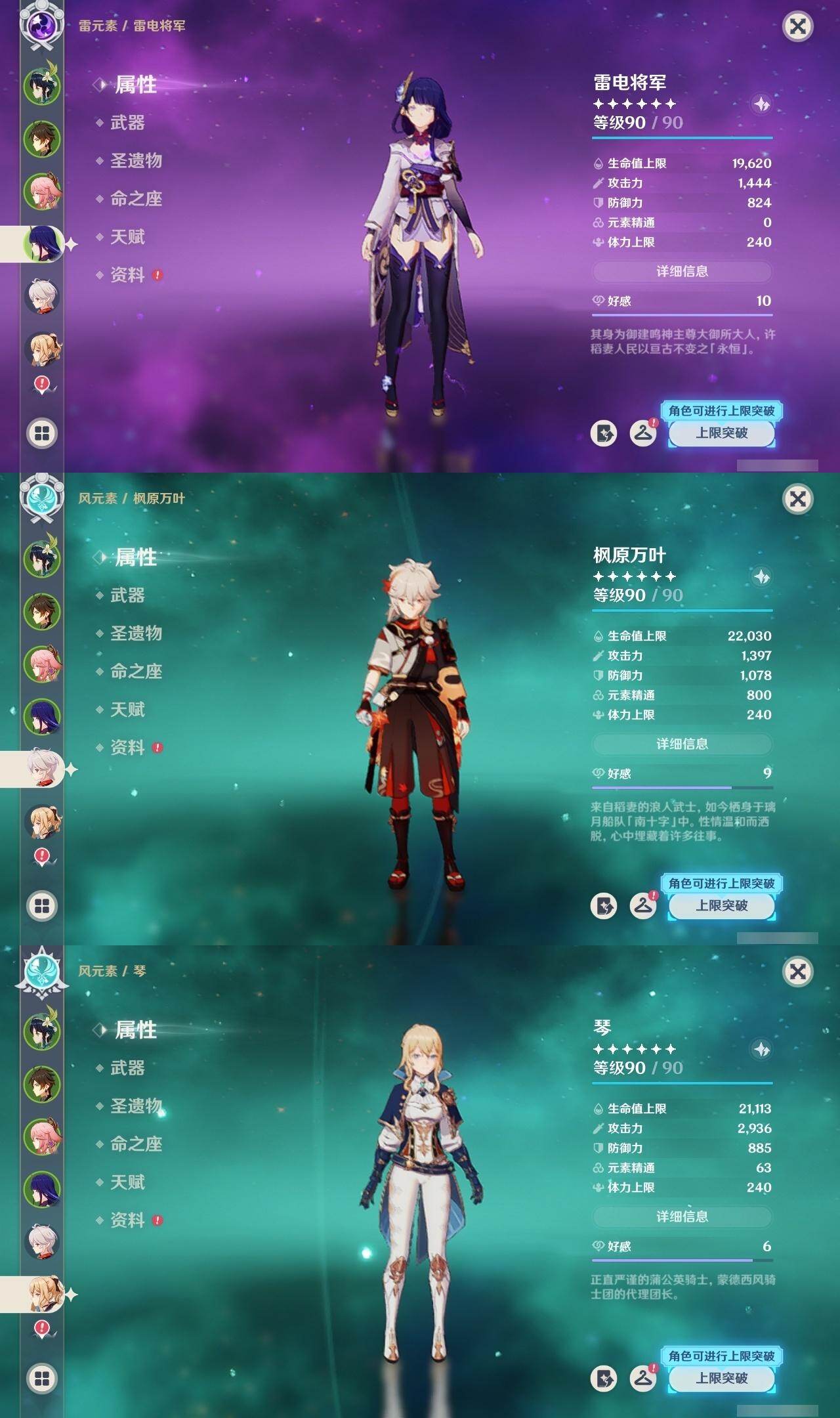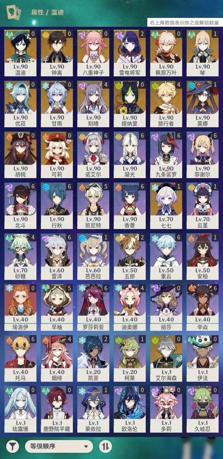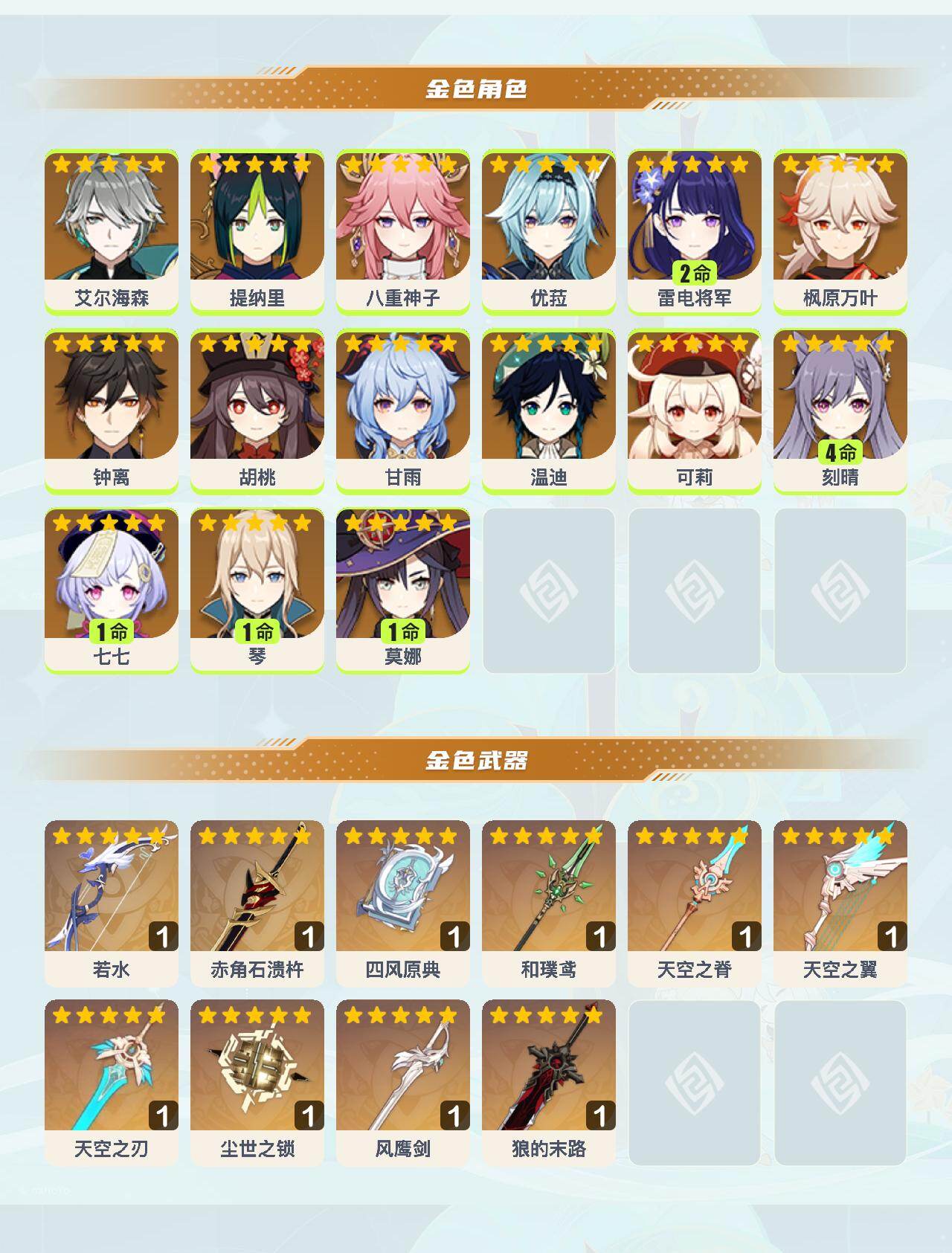 0命艾尔海森,0命提纳里,0命八重神子,0命优菈,2命雷电将军,0命枫原万叶,0命钟离,0命胡桃,0命甘雨,0命温迪,0命可莉,4命刻晴,1命七七,1命琴,1命莫娜,精1若水,精1赤角石溃杵,精1四风原典,精1和璞鸢,精1天空之脊,精1天空之翼,精1天空之刃,精1尘世之锁,精1风鹰剑,精1狼的末路