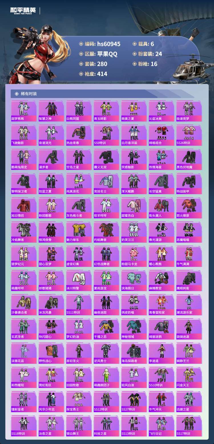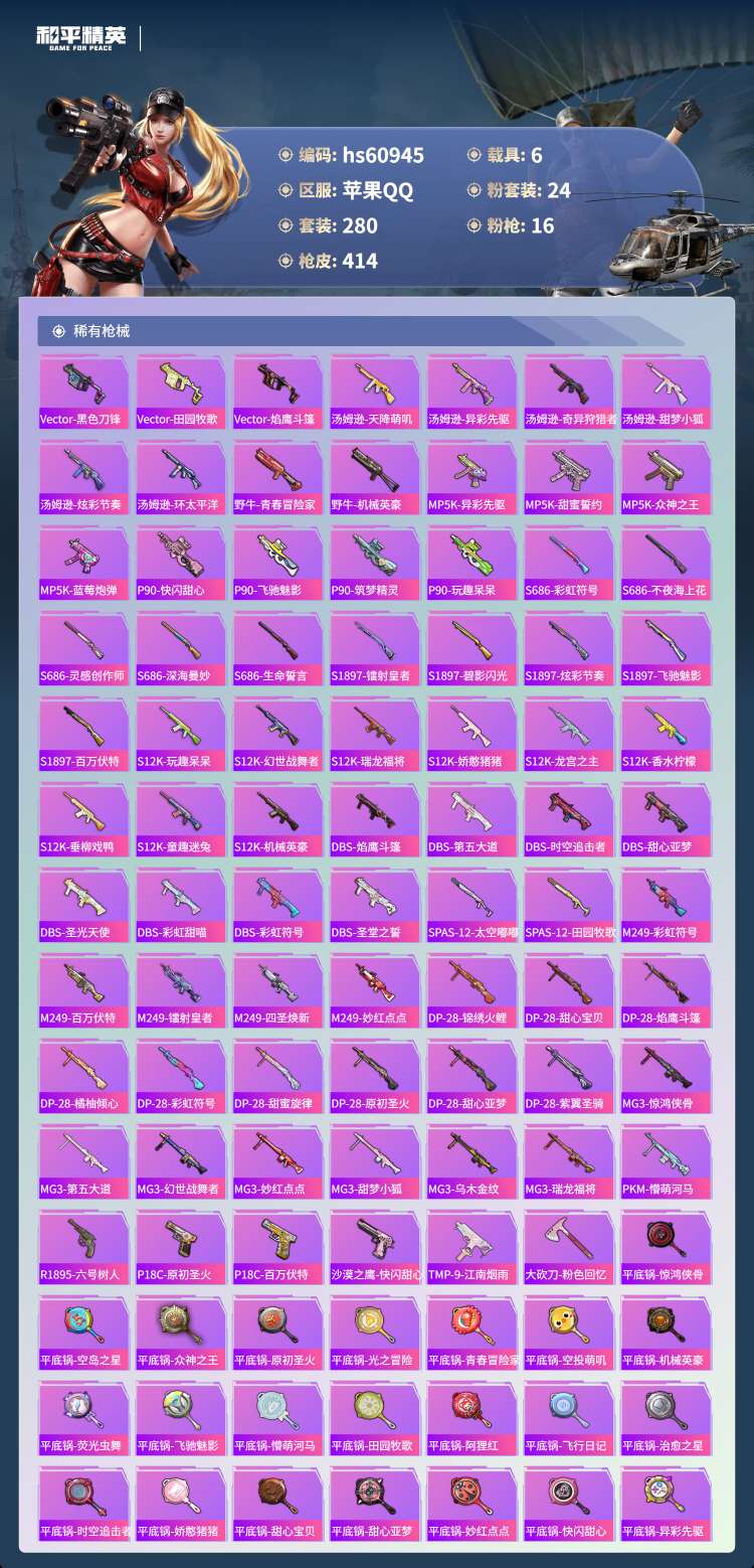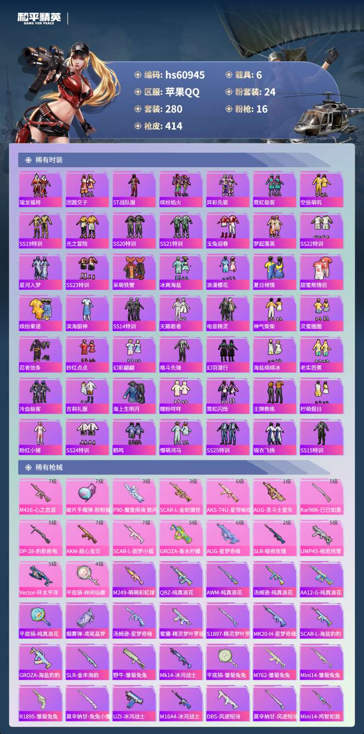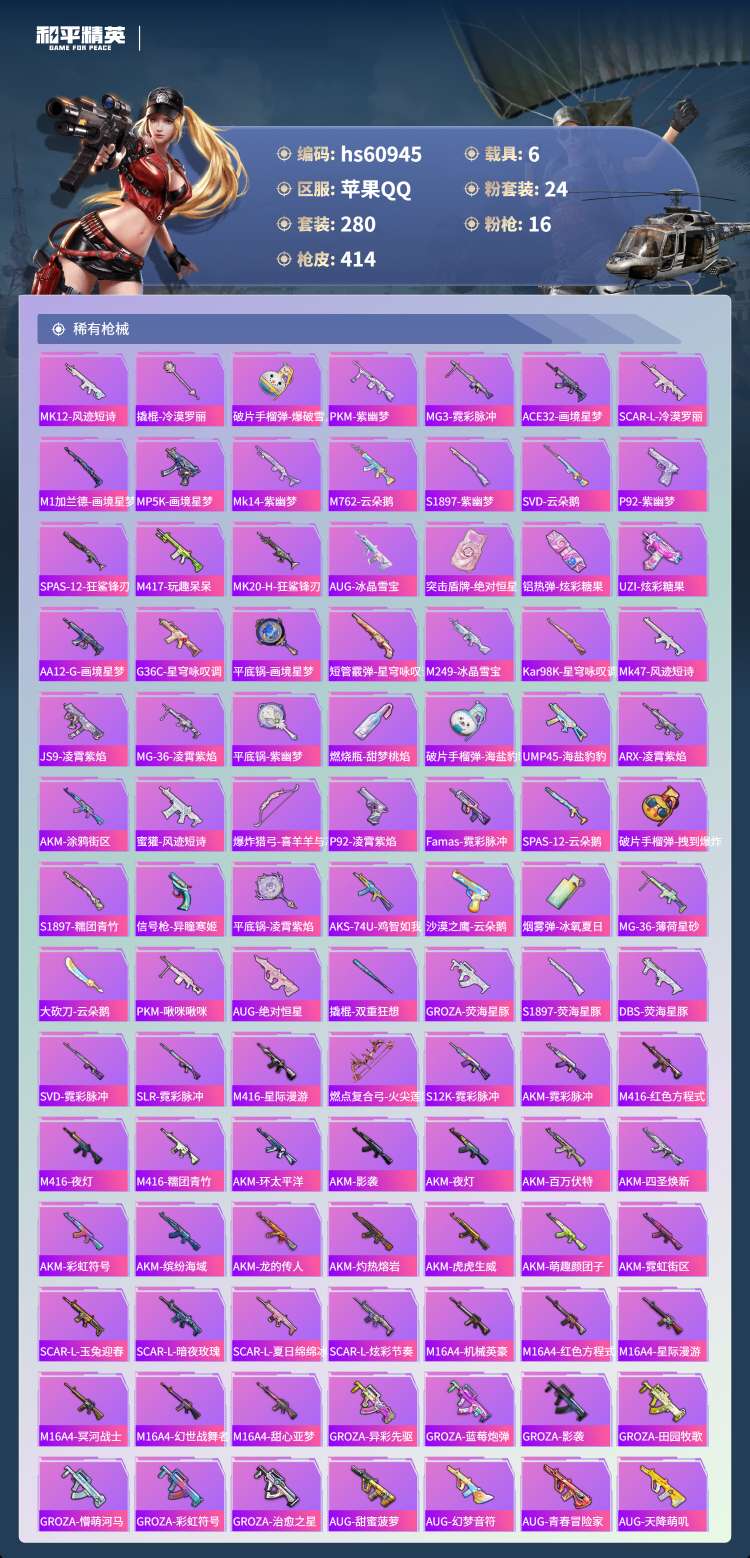 hs60945 苹果手Q-24王牌印记-有战神框-1红装-24粉装-16特效枪-6载具-156691