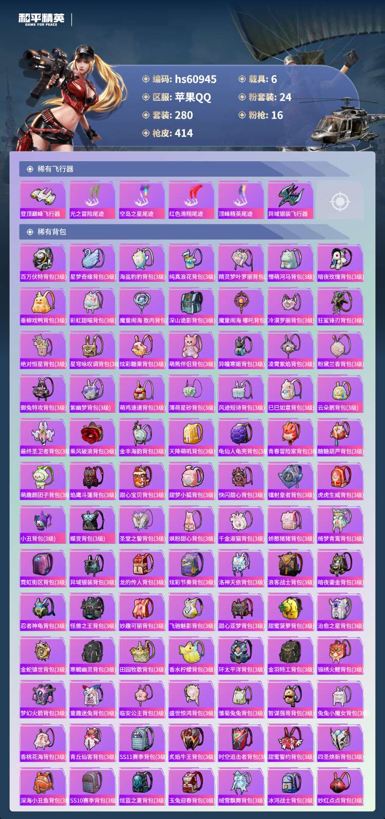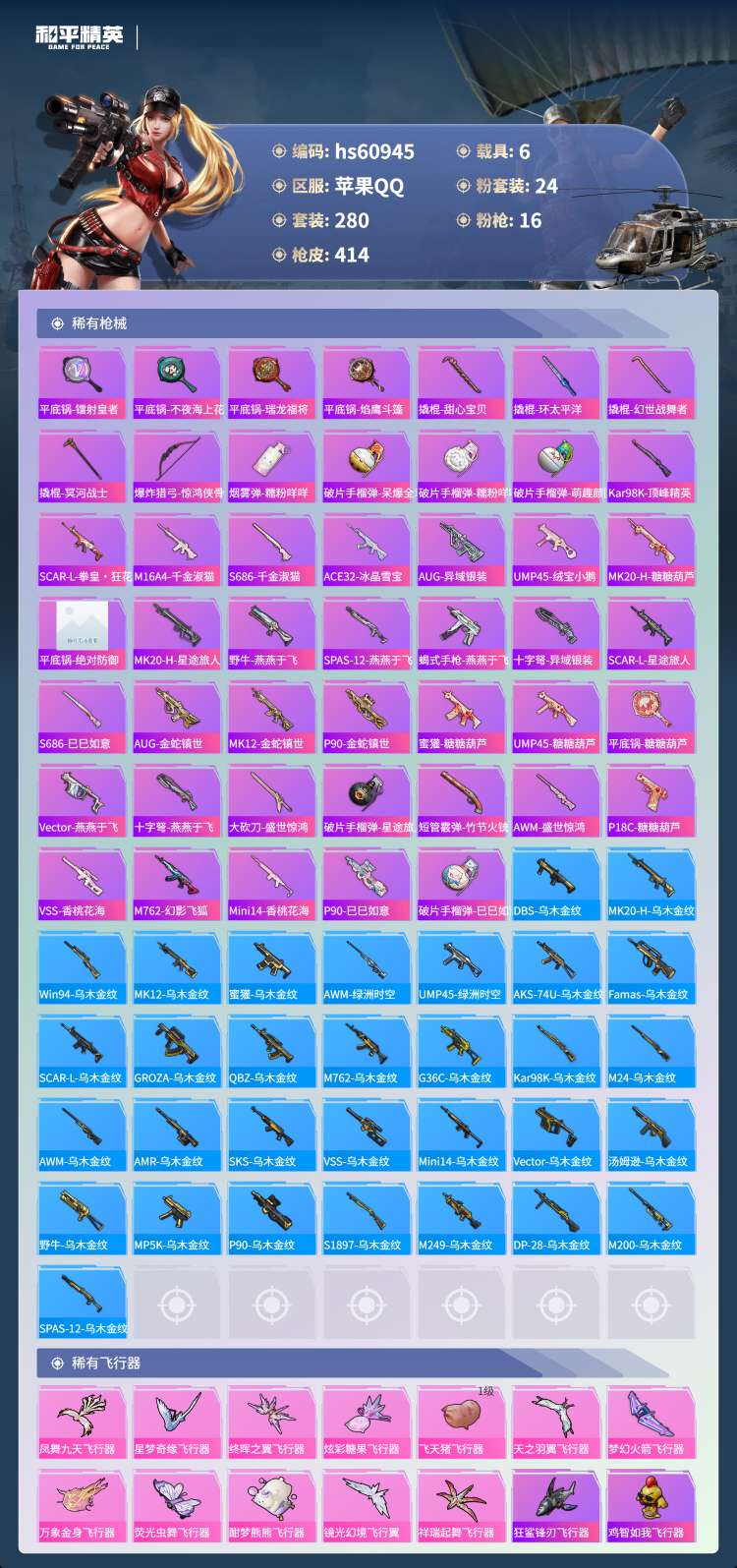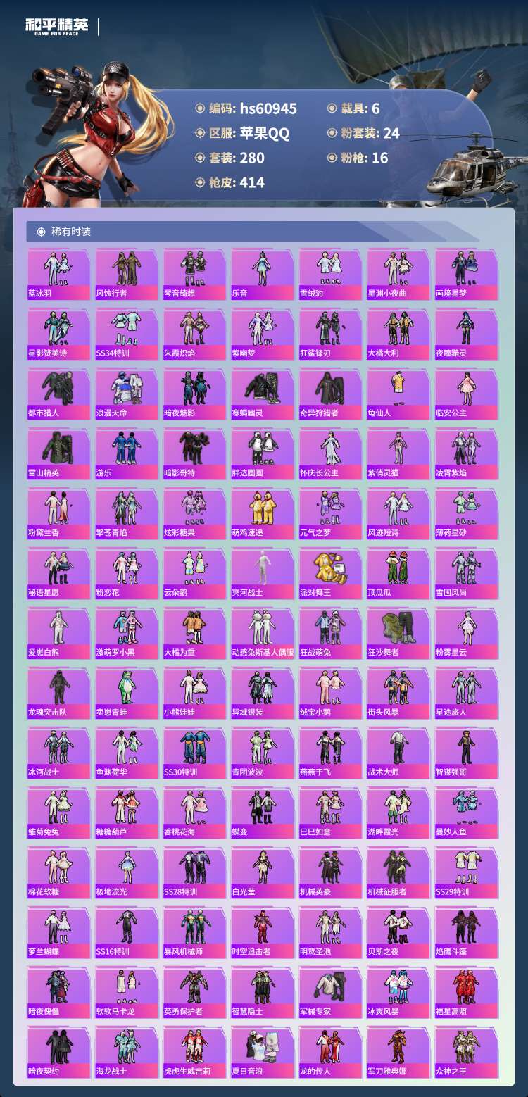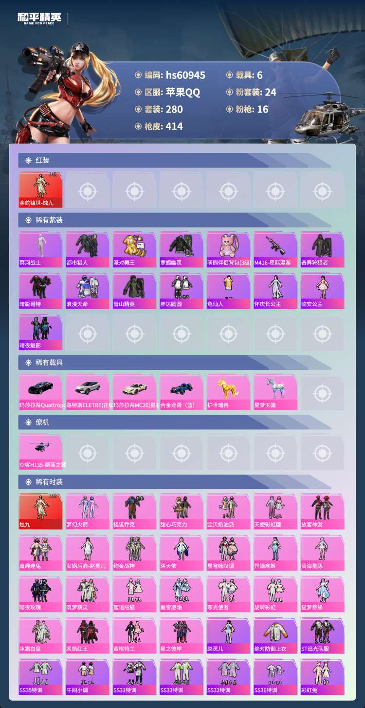 hs60945 苹果手Q-24王牌印记-有战神框-1红装-24粉装-16特效枪-6载具-156691