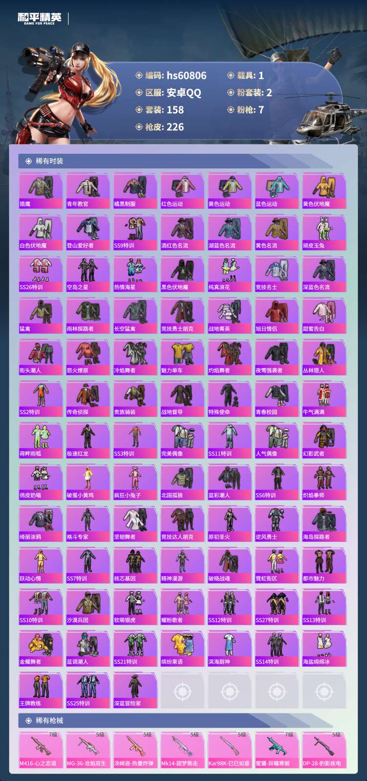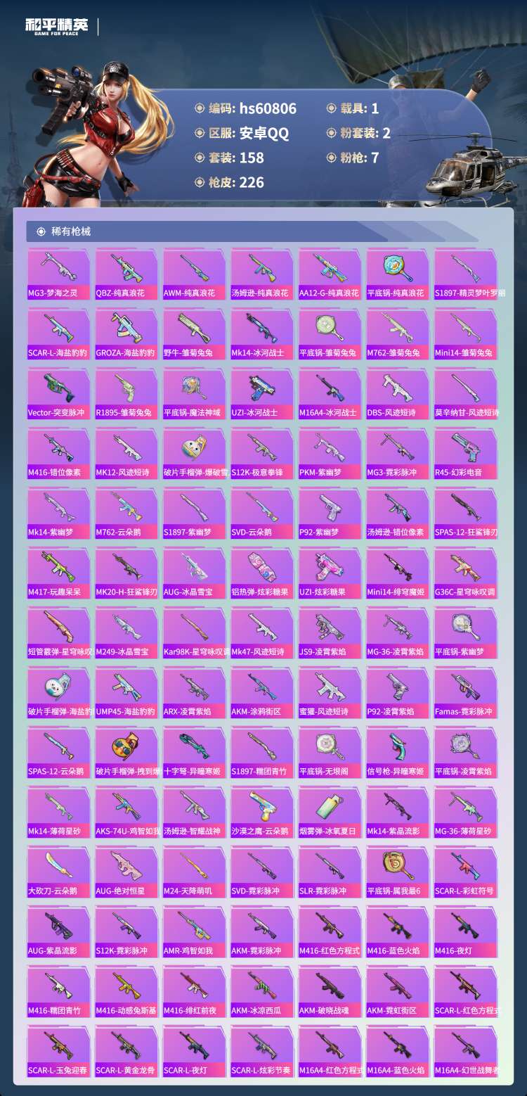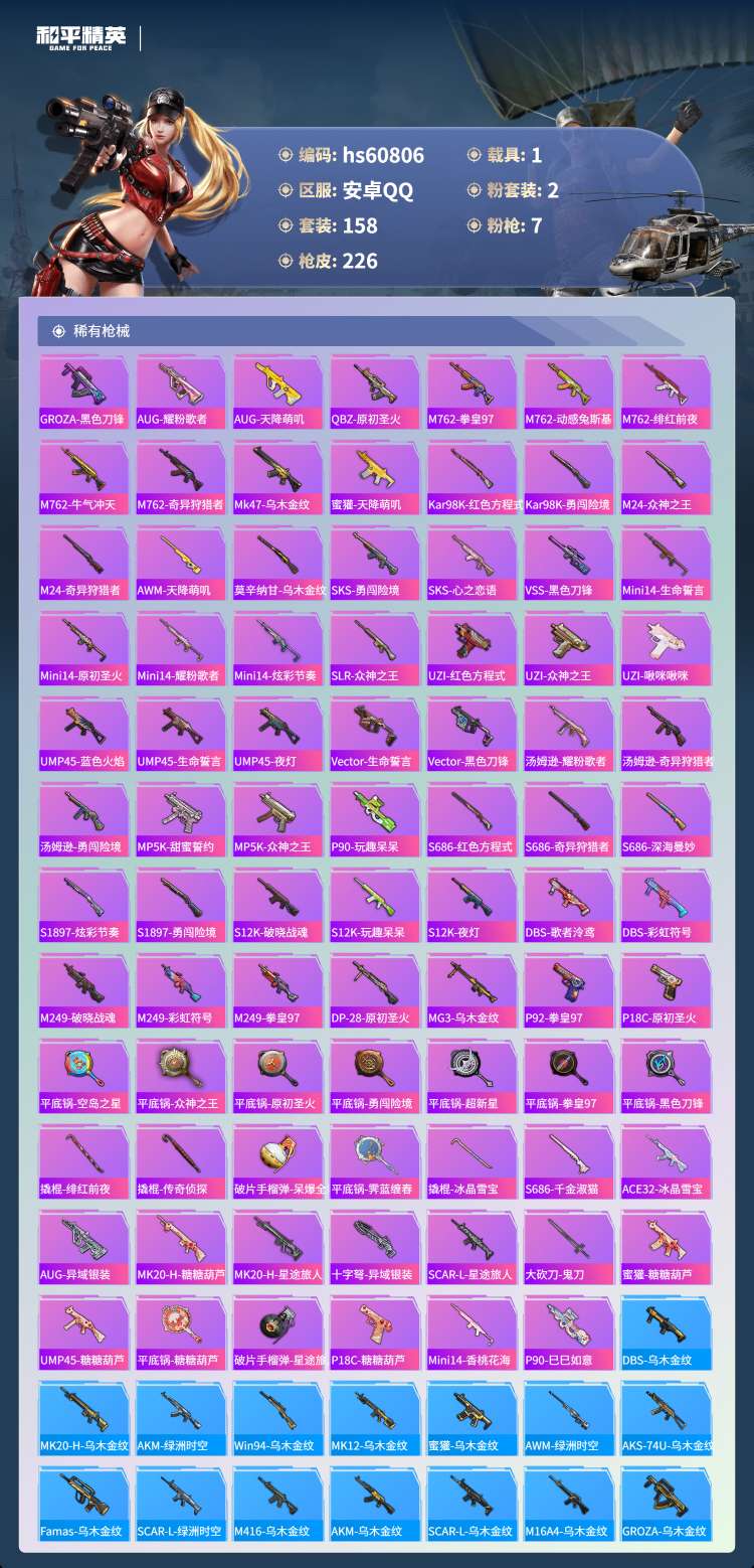 hs60806 安卓手Q-24王牌印记-有战神框-2粉装-7特效枪-1载具-65845热力值-158