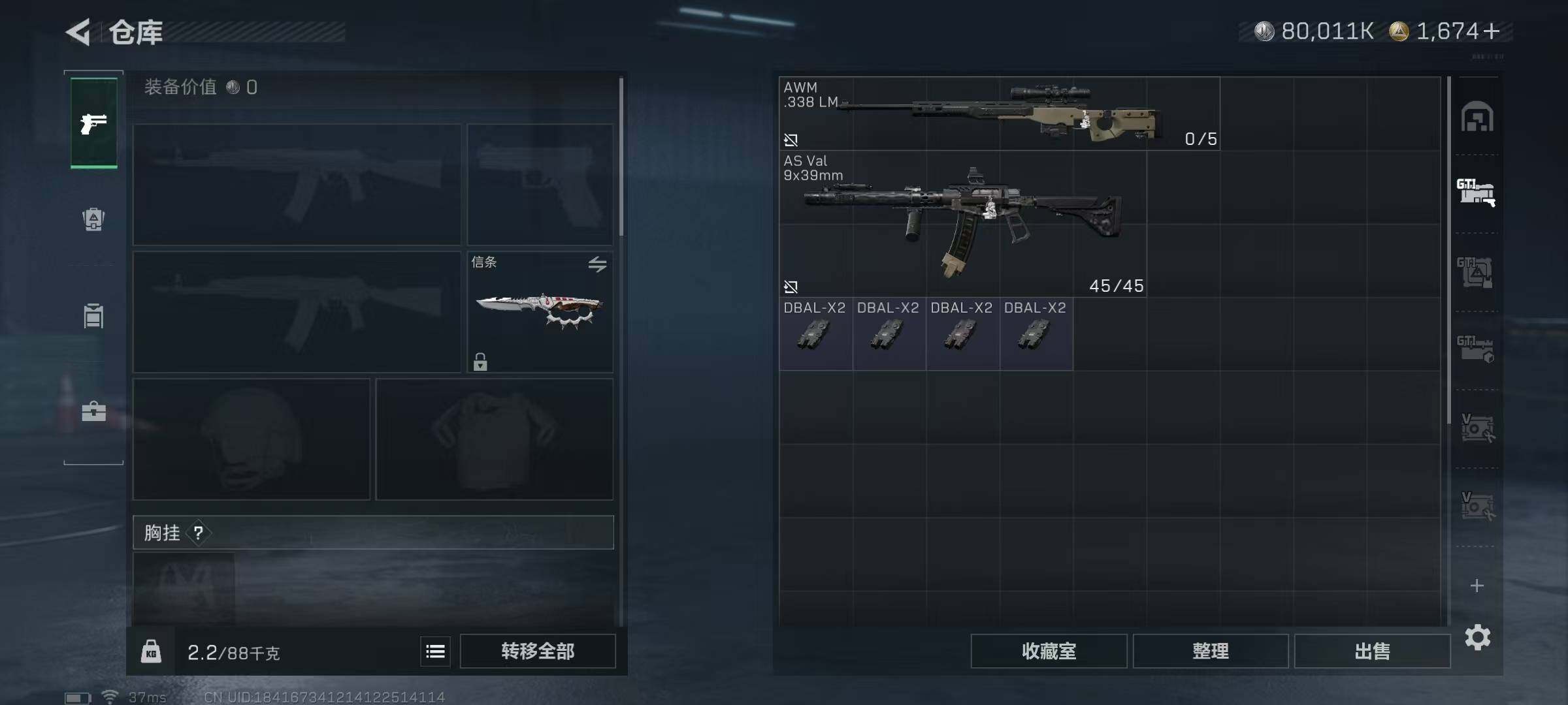 总资产(M):643M/哈夫币(K):80011K/哈夫币(K):80011K/传说枪皮数:21/全