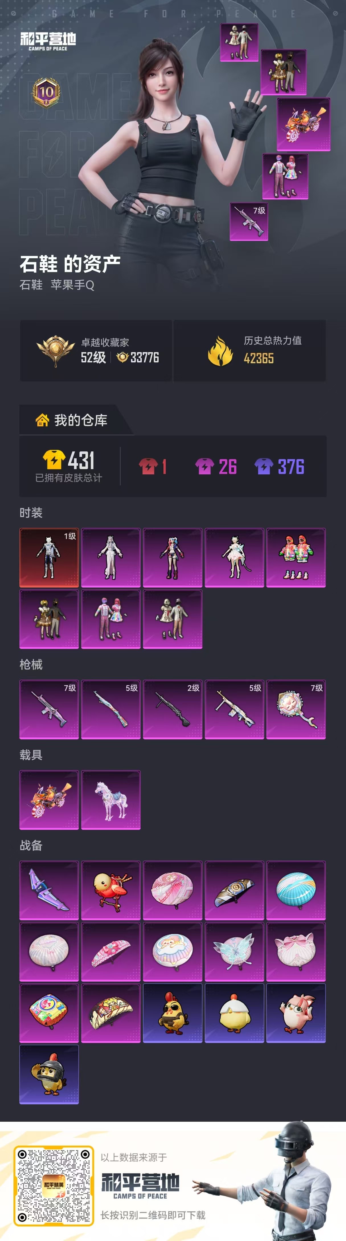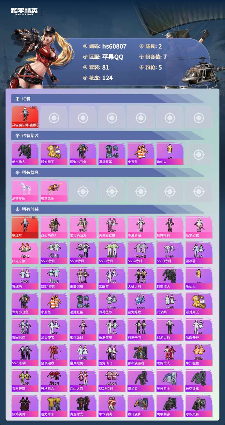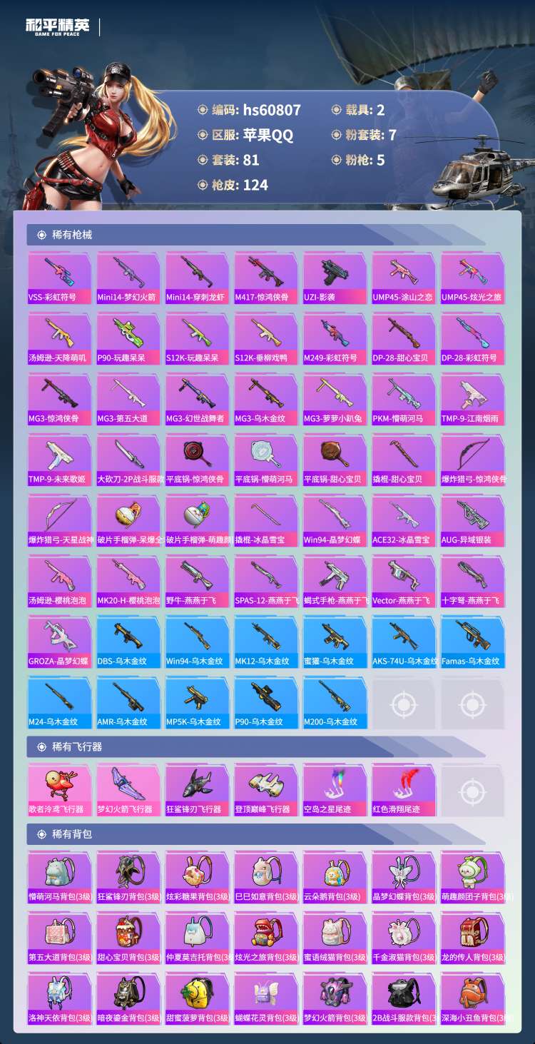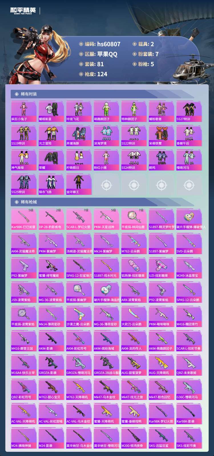 hs60807 苹果手Q-10王牌印记-1红装-7粉装-5特效枪-2载具-42365热力值-81套装