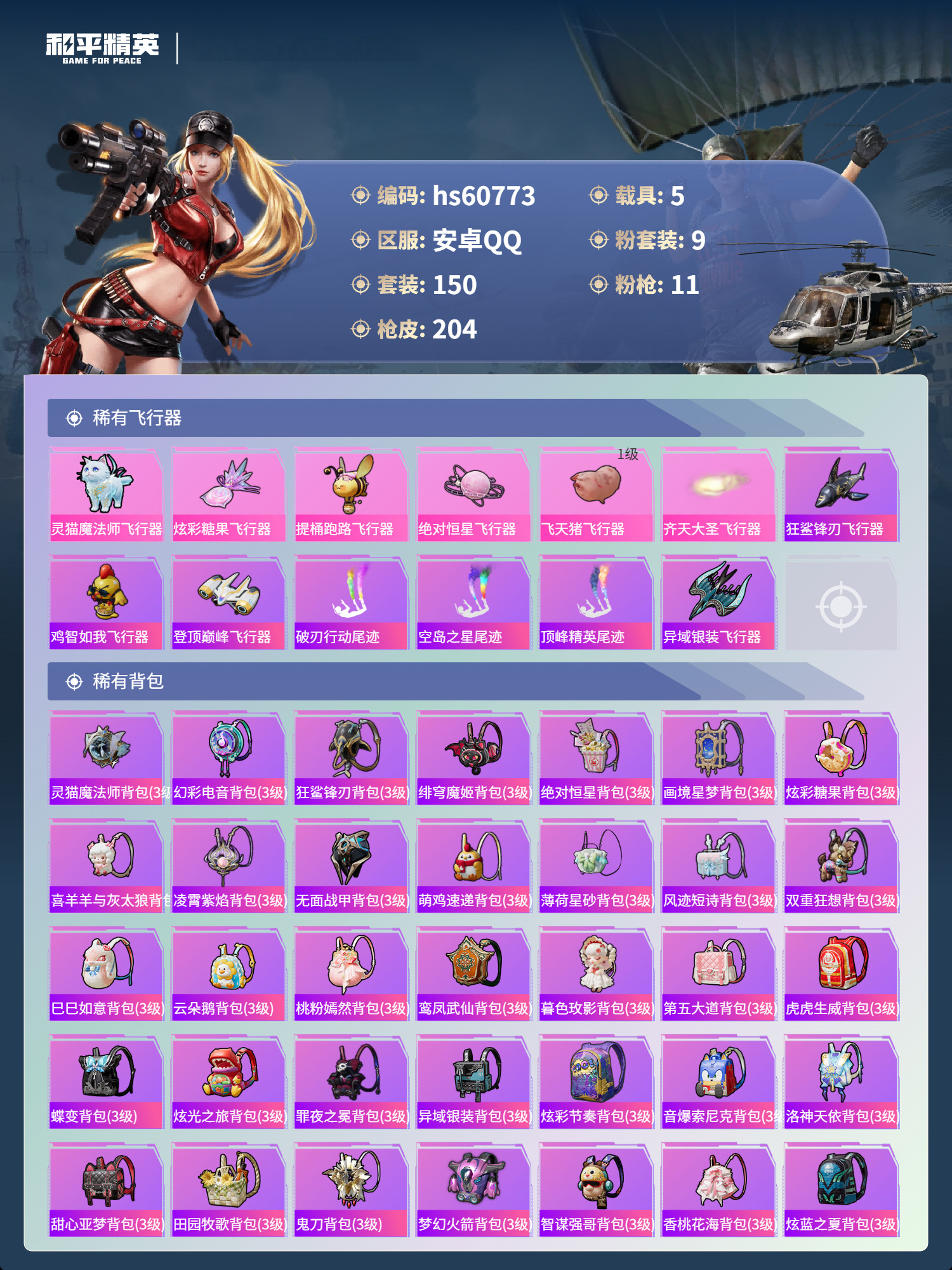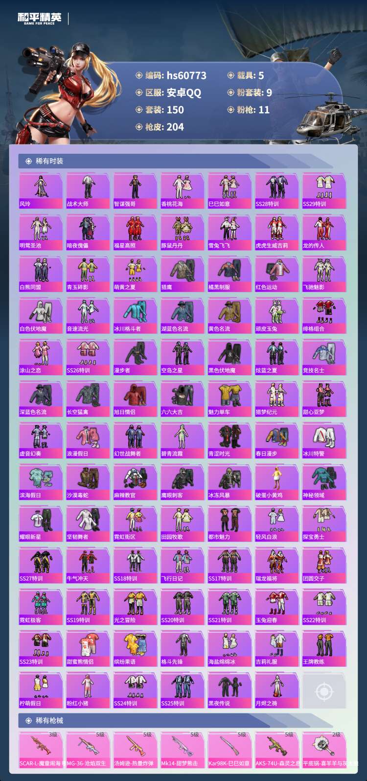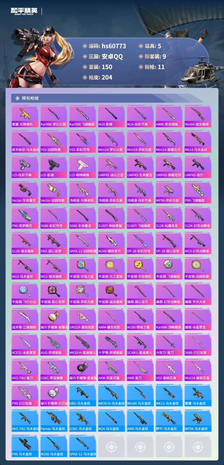hs60773 安卓手Q-15王牌印记-1红装-9粉装-11特效枪-5载具-76034热力值-150