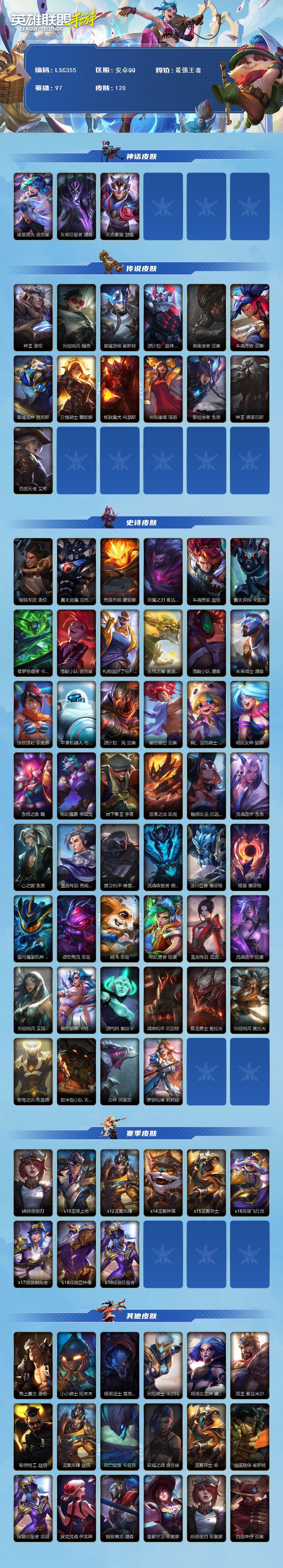 【LSC355】97英雄/120皮肤/最强王者/夜星流火 金克丝/灰烬征服者 潘森/天命豪赌 瑟提/神王 盖伦/光明哨兵 薇恩/星域游侠 崔斯特/源计划:超体 莫德凯撒/黑夜使者 亚索/斗魂无双 亚索/星域武神 贾克斯/日蚀骑士 蕾欧娜/炼狱魔犬 内瑟斯/光电璀璨 泽丽/黎明使者 永恩/神王 德莱厄斯/西部天使 艾希/钢铁军团 盖伦/霸天剑魔 亚托克斯/无限烈焰 黛安娜/恶魔之刃 泰达米尔/斗魂无双 赵信/霸天异形 卡兹克/猎梦吞噬者 卡兹克/清剿小队 金克丝/礼物选好了吗? 布隆/东恒之曜 奥