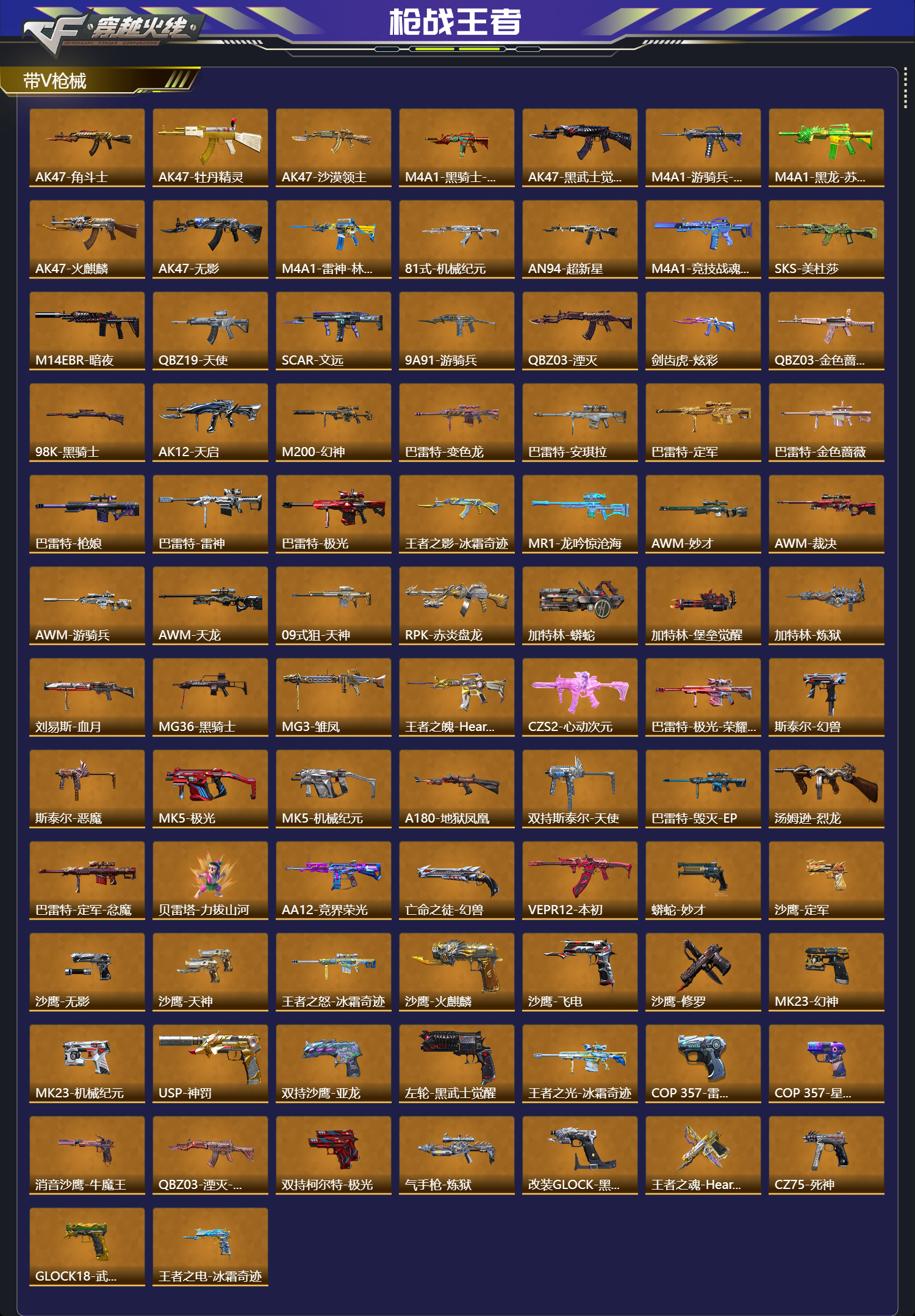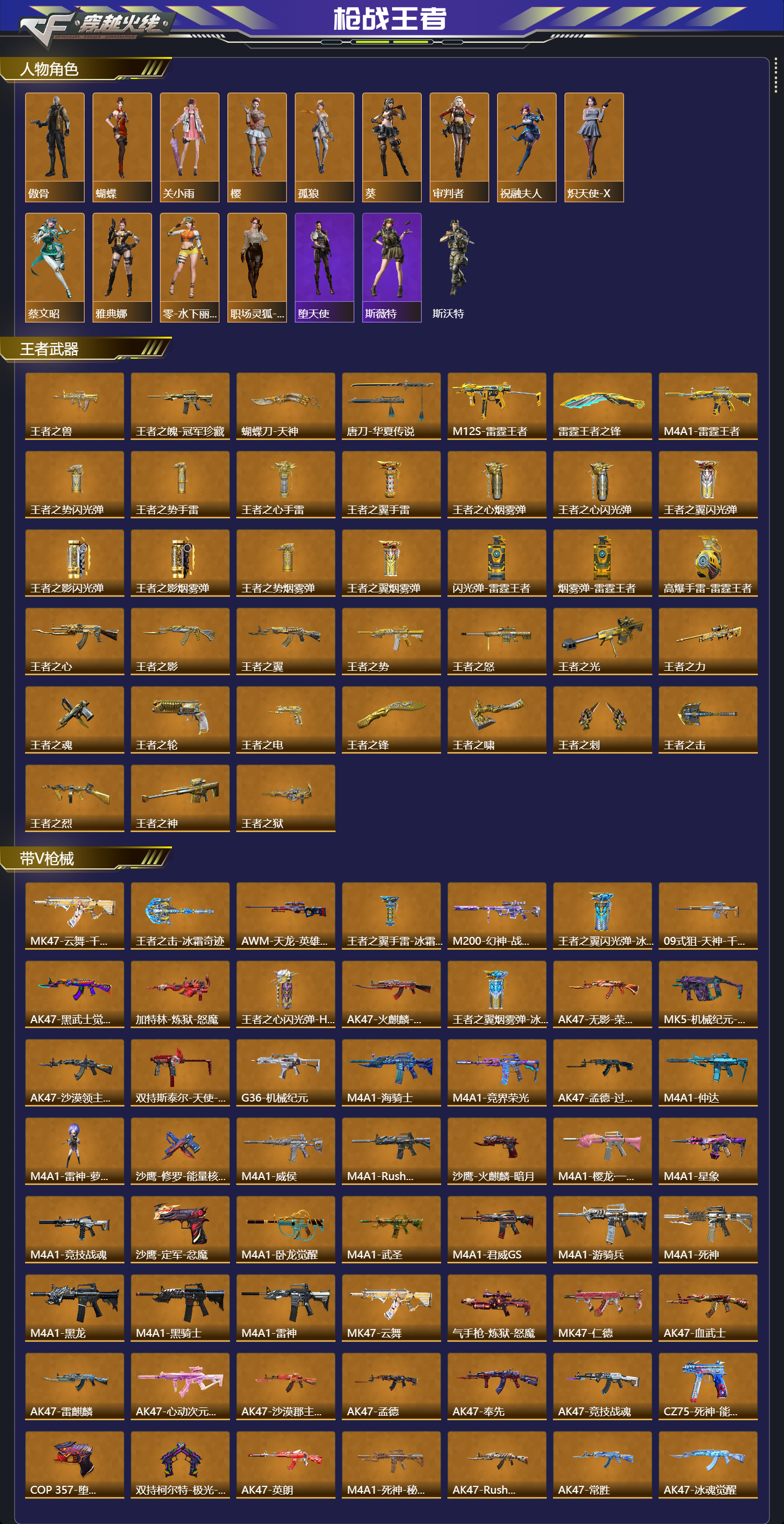 【王者武器】王者之兽,王者之魄-冠军珍藏,蝴蝶刀-天神,唐刀-华夏传说,M12S-雷霆王者,雷霆王者之锋,M4A