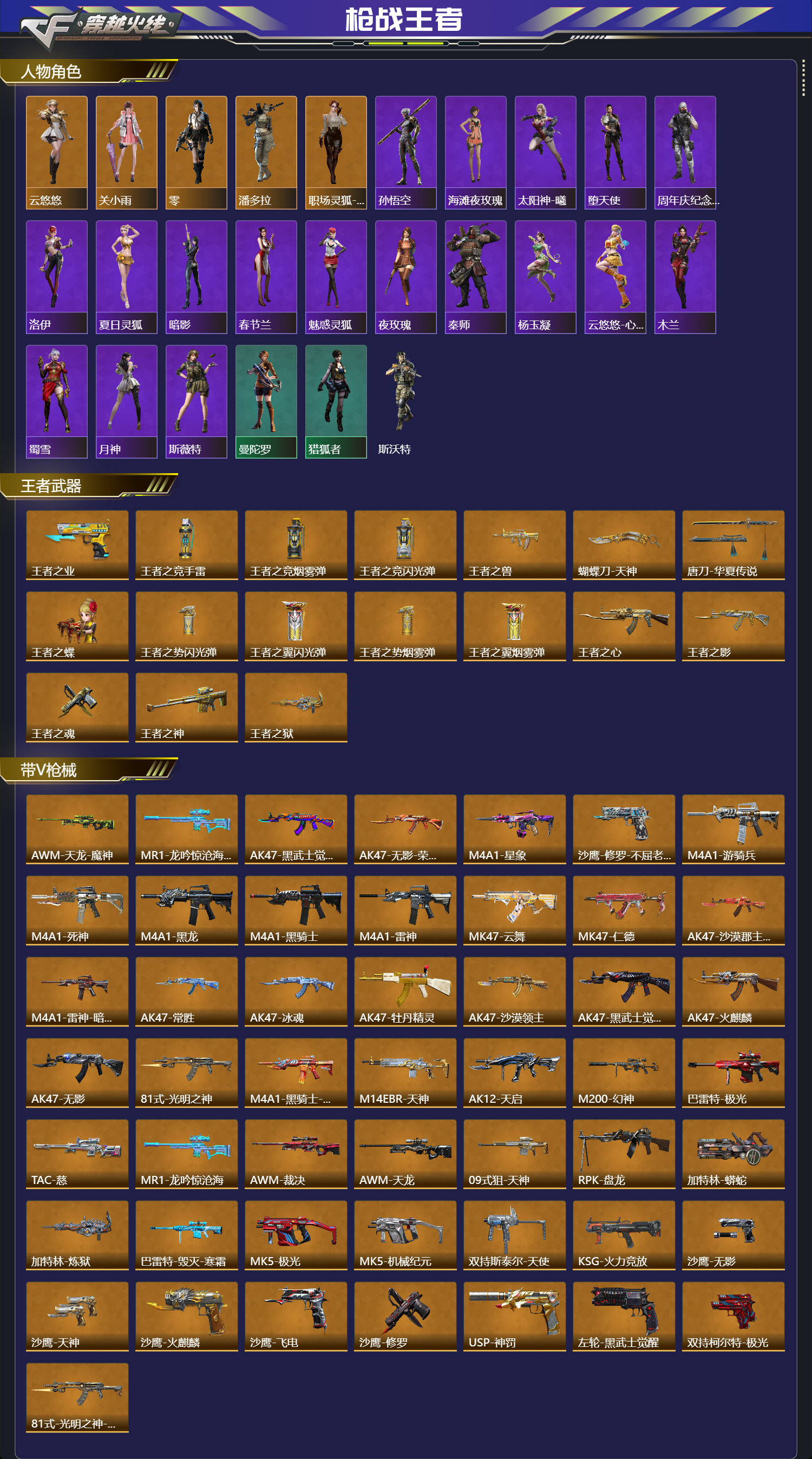 【人物角色】孙悟空,云悠悠,关小雨,海滩夜玫瑰,太阳神-曦,大老师,堕天使,周年庆纪念赛斯,运动宝贝兰,洛伊,夏日灵狐,暗影,春节兰,零,魅惑灵狐,曼陀罗,夜玫瑰,潘多拉,猎狐者,斯沃特,秦师,杨玉凝,云悠悠-心动起点,木兰,蜀雪,月神,职场灵狐-赛事经理,斯薇特,