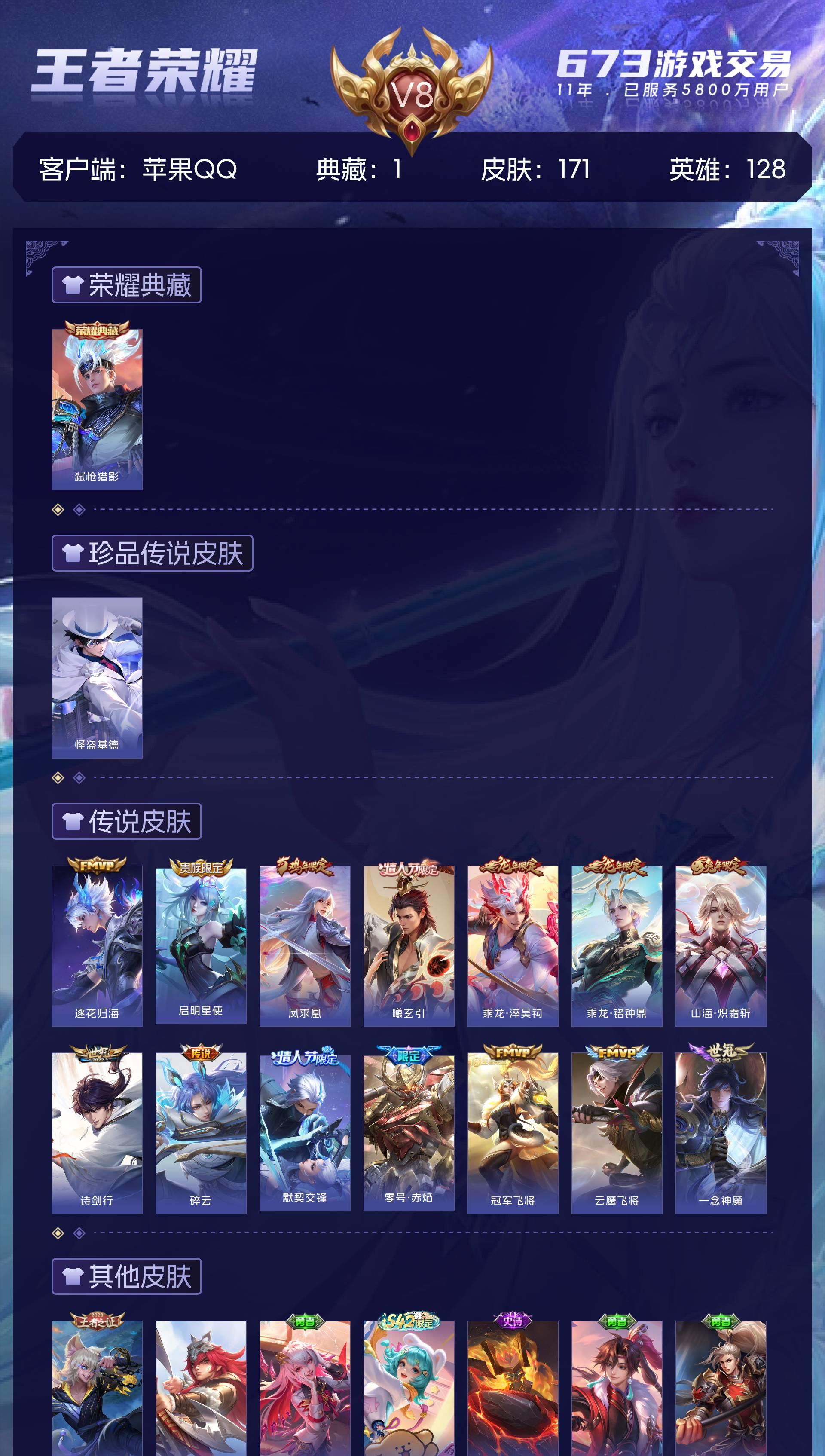 V8 皮肤171 英雄128 最强王者 荣耀典藏1 珍品传说1 传说14 其他皮肤161