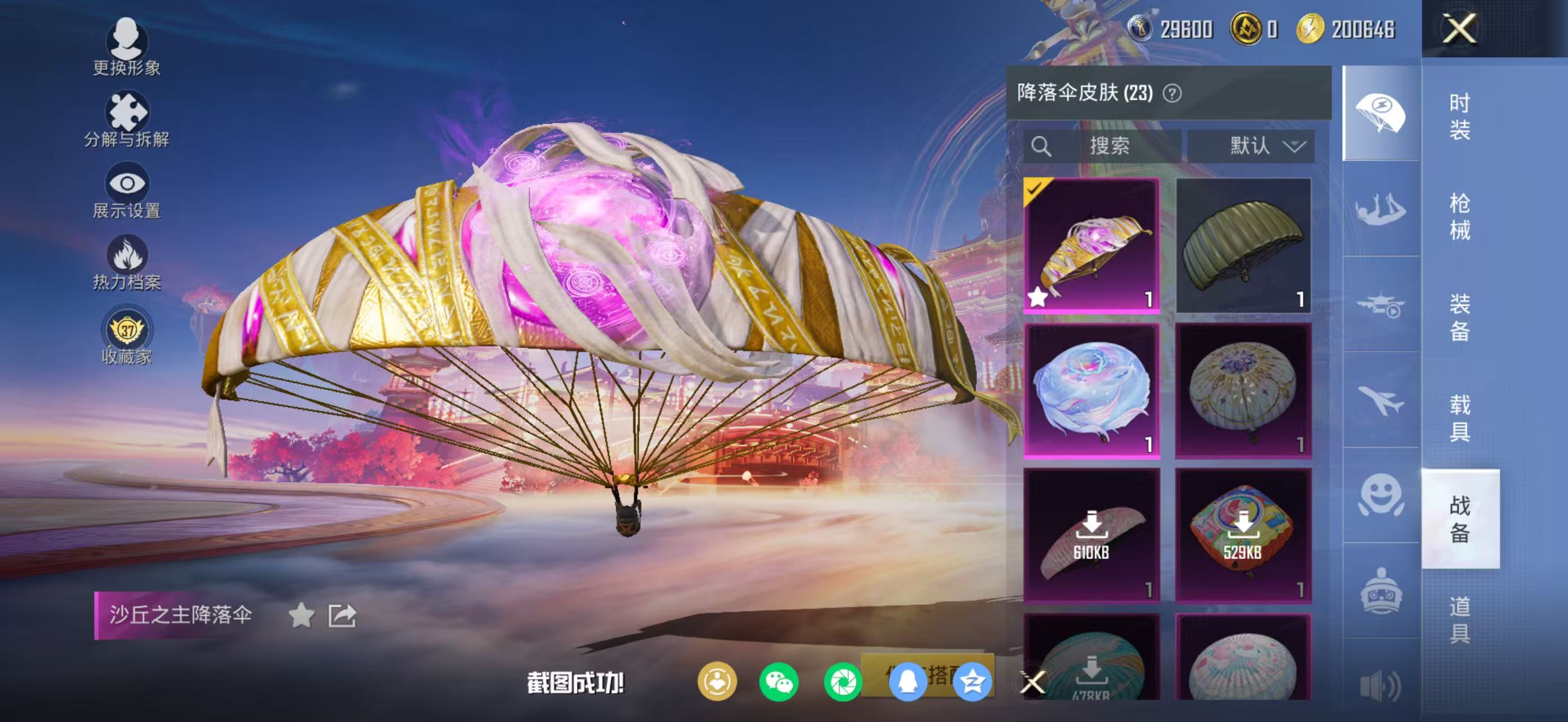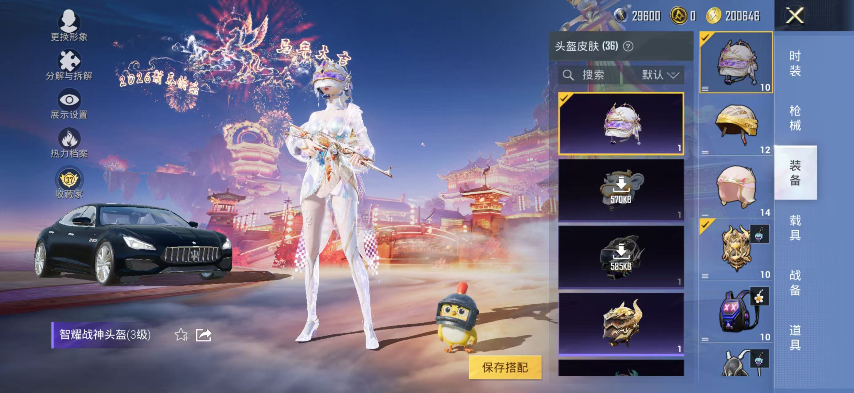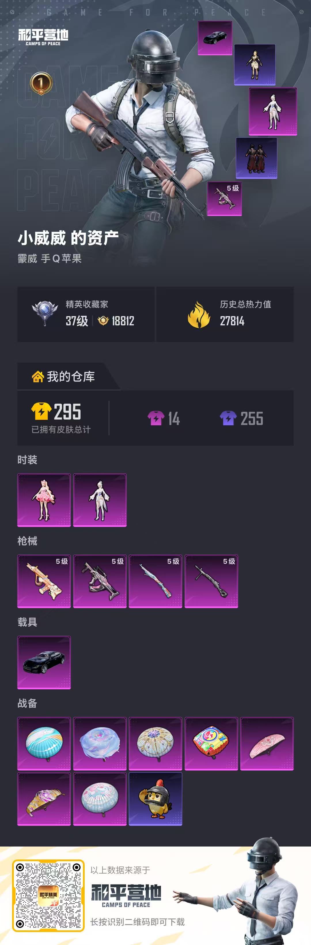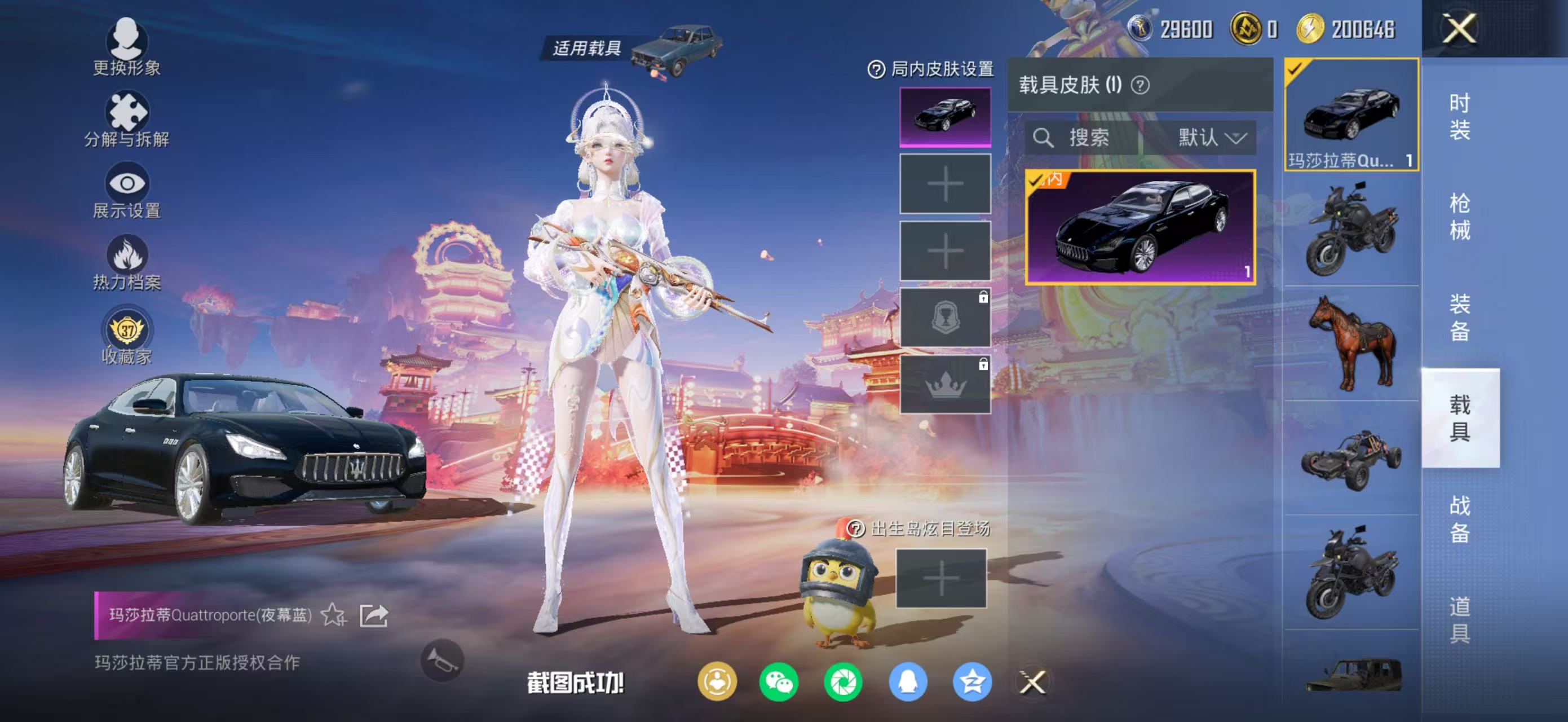 苹果Q区,一辆载具玛莎拉蒂,四把升级枪,两个粉装,一套身法衣很多降落伞详细自己看