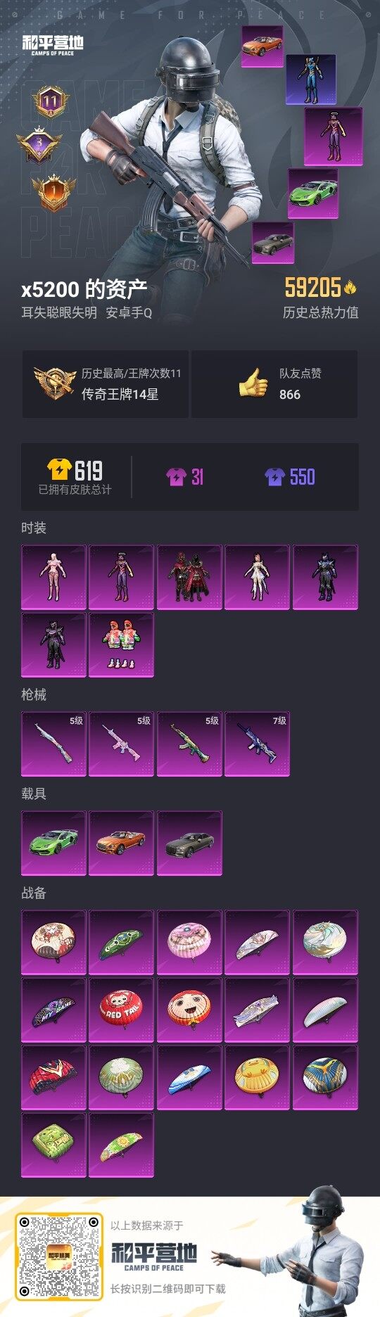 【暑期末清货/特价急出/永久包赔】:安卓 手Q-7粉装-4特效枪-3载具-5.9w热力值-11印记-128套装-170枪皮【热门品类】:套装-深海小丑鱼,套装-奇异狩猎者【稀有载具】:兰博基尼Aventador SVJ(翡翠绿),宾利欧陆GT敞篷(火焰橘),宾利飞驰(布罗德盖棕双色)【特效枪等级】:AKM-绿萝繁花(五级),SCAR-L-青春物语(七级),M416-电玩时刻(五级),Kar98K