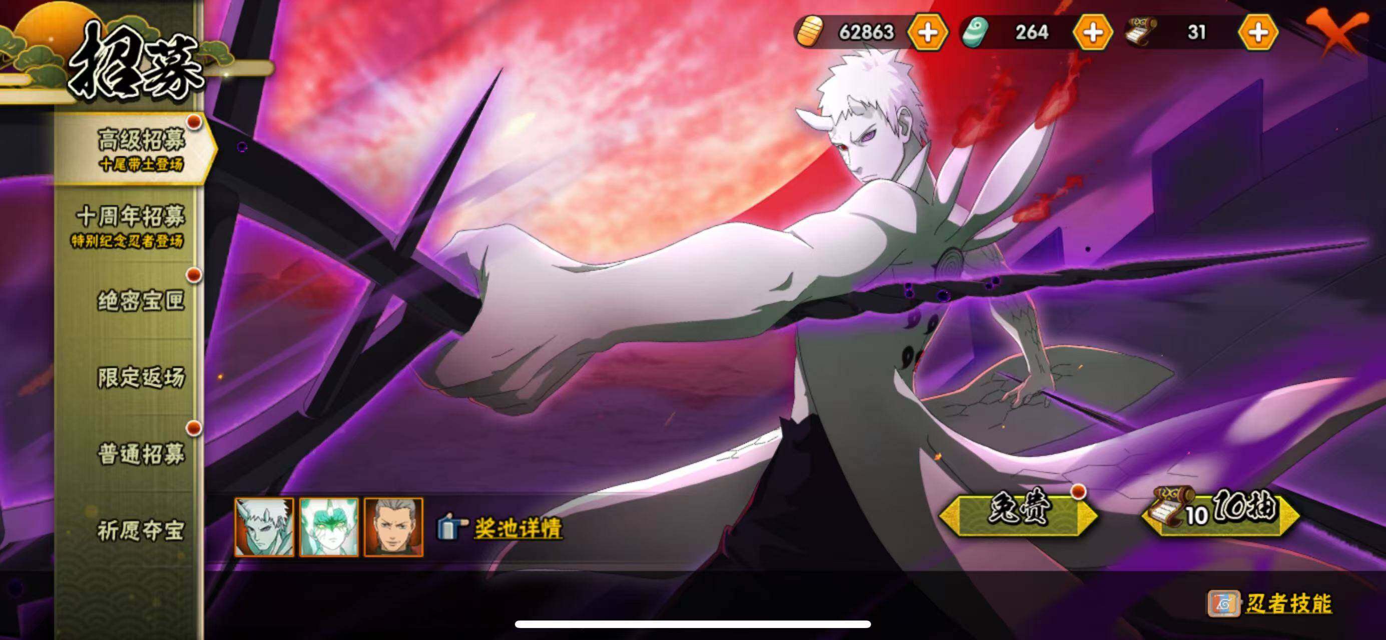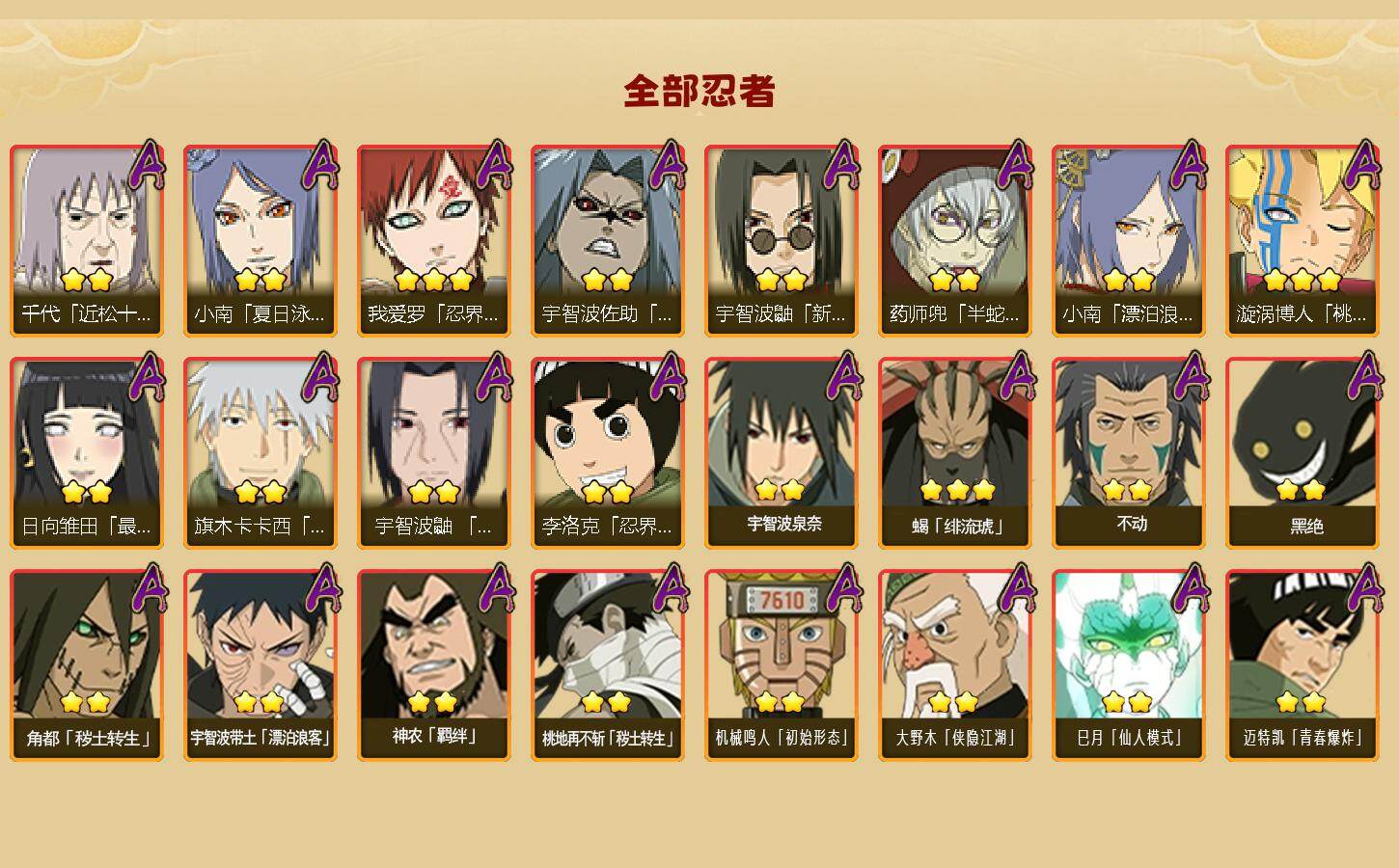 【S级忍者】:长门「秽土转生」(3星),三代目风影「秽土转生」(3星),半藏「秽土转生」(3星),金角·银角「秽土转生」(3星),猿飞日斩「秽土转生」(3星),波风水门「秽土转生」(3星),千手扉间「秽土转生」(3星),千手柱间「秽土转生」(3星),宇智波鼬「秽土转生」(3星),宇智波斑「秽土转生」(3星),宇智波斑「秽土转生·解」(3星),大野木「忍界大战」(3星),春野樱