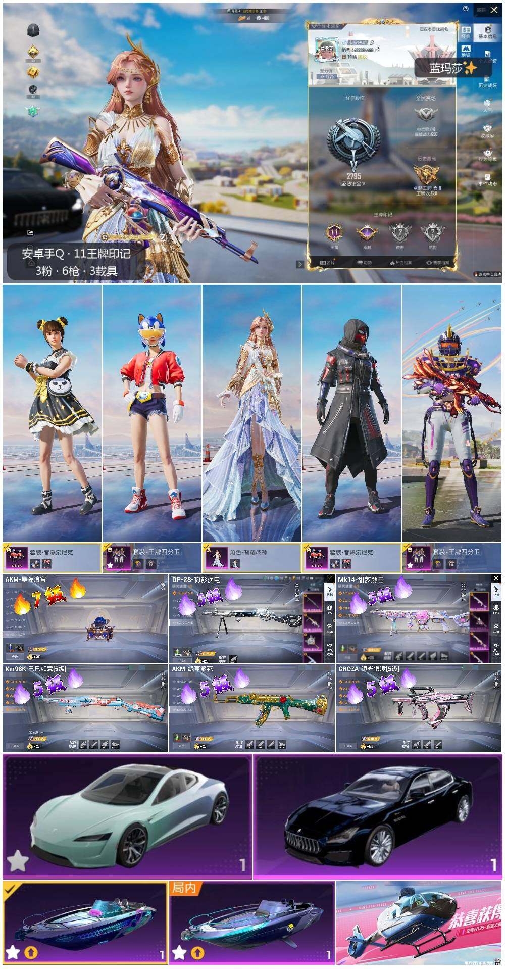 【店主推荐捡漏号!可直接换绑】安卓 手Q-3粉装-6特效枪-4载具-1粉色飞行器-6.3w热力值-11王牌印记-154套装-181枪皮【热门品类】:粉装-音爆索尼克,套装-奇异狩猎者,套装-龟仙人,套装-浪漫波比,套装-粉红小猪【粉色载具】:特斯拉Roadster(水滴蓝),玛莎拉蒂Quattroporte(夜幕蓝),空客H135-蔚蓝之翼,快艇-塞莎KL27(深潜蓝)【粉色套装】:粉装-王牌四