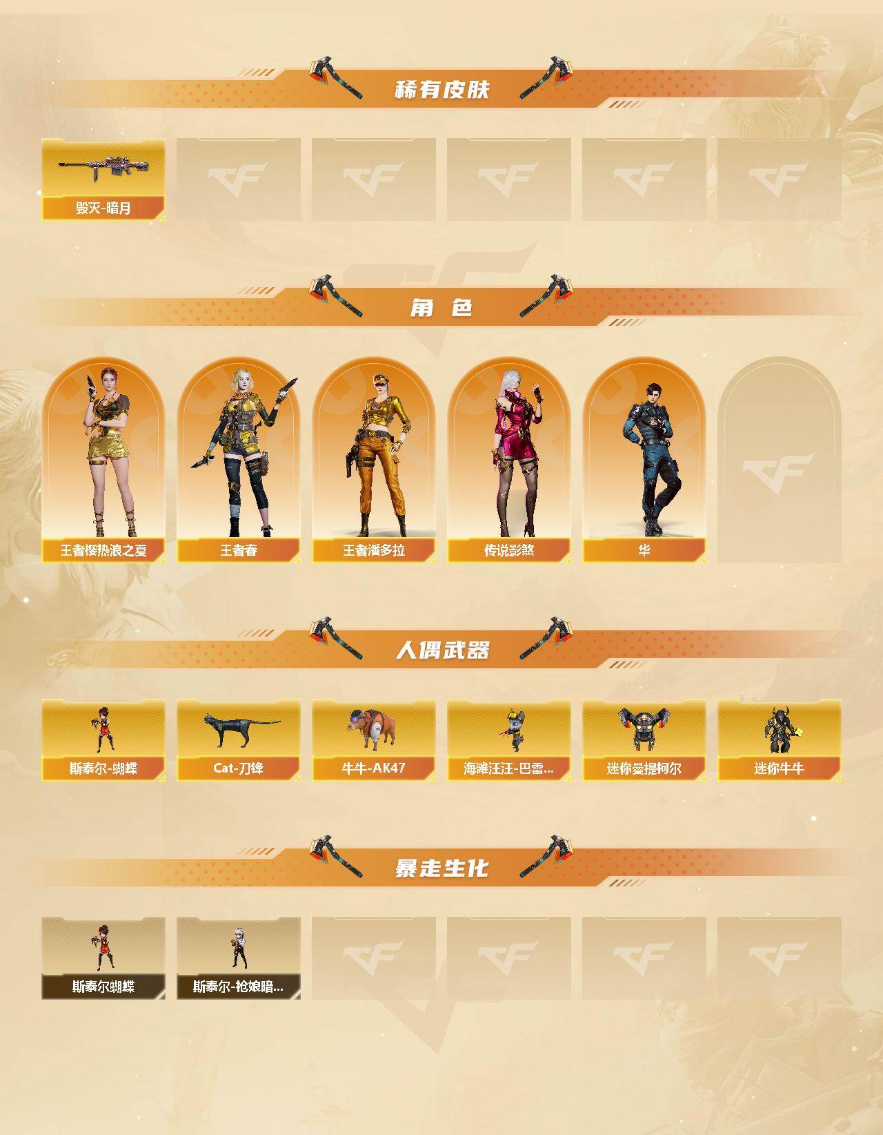 【稀有皮肤】:幻神-冠军之幻,幻神-宠儿-2021MVP,雷神-荣耀之魄,火麒麟-轻羽皮肤,毁灭-暗月,毁灭-荣耀之怒,毁灭