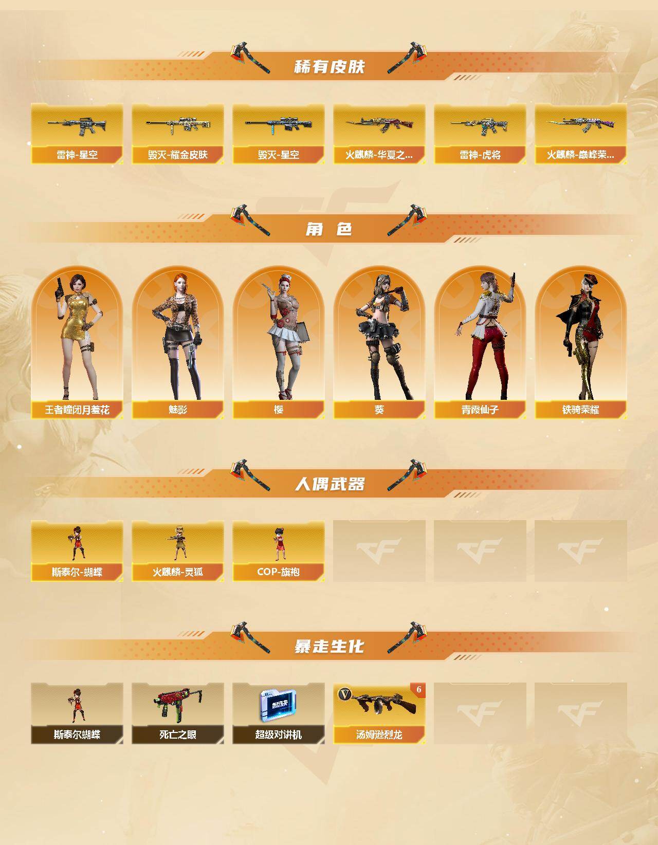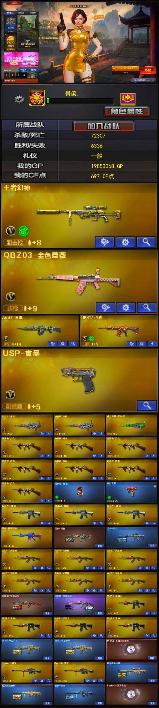 【热门武器】:QBZ03-金色蔷薇,HK417-朱雀,死亡之眼,M4A1-黑骑士*4,汤姆逊-烈龙*7,加特林-炼狱*2,斯泰尔-蝴蝶,USP-雷暴,沙鹰-修罗*5