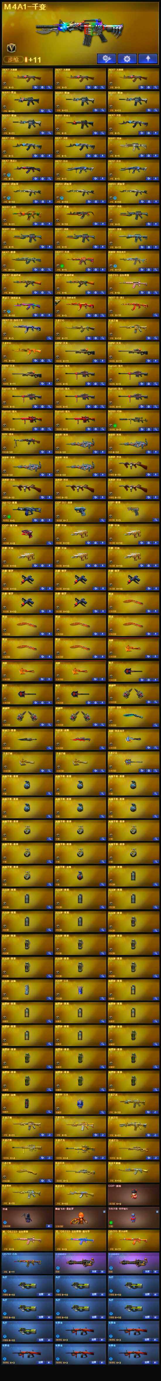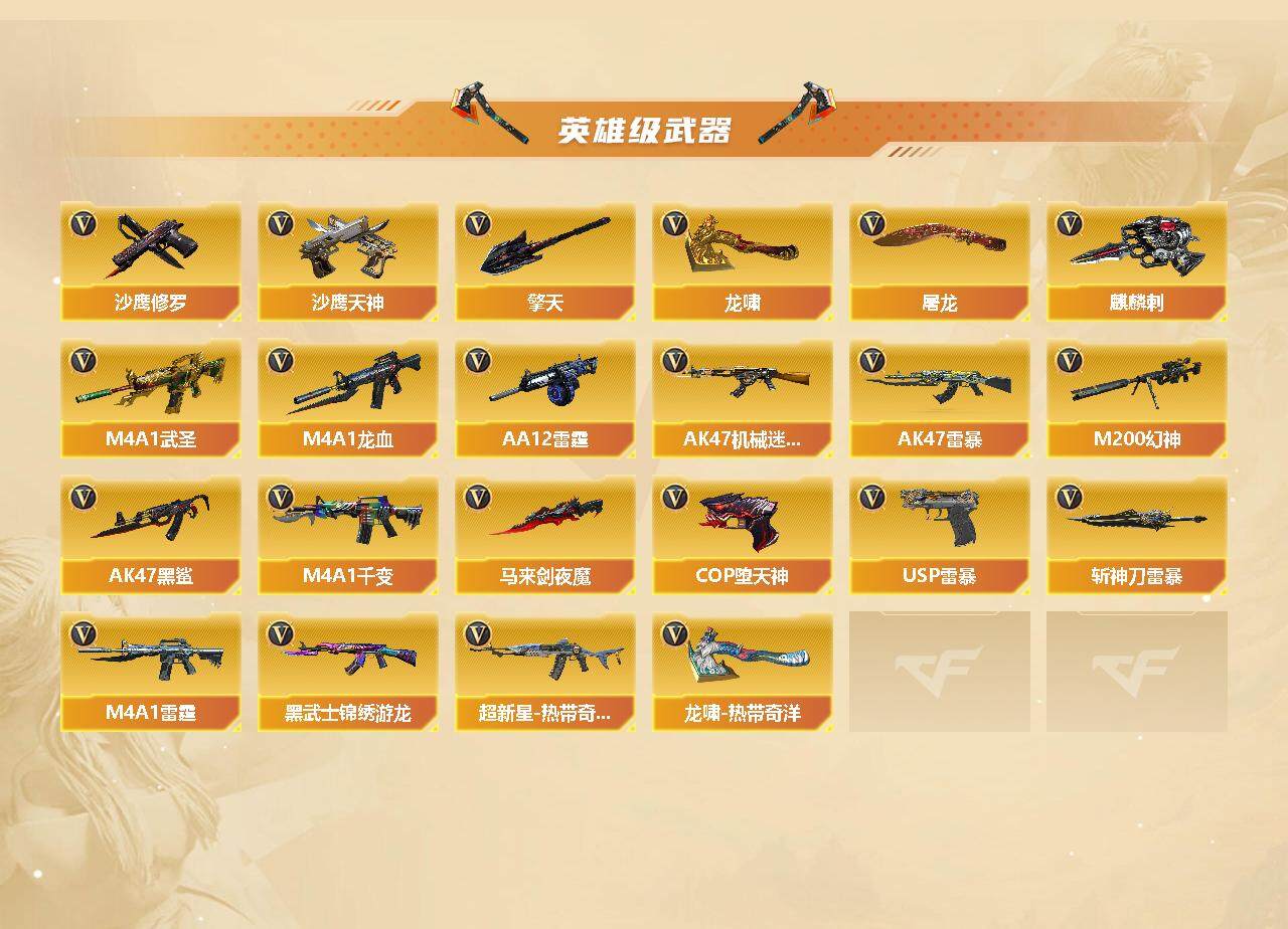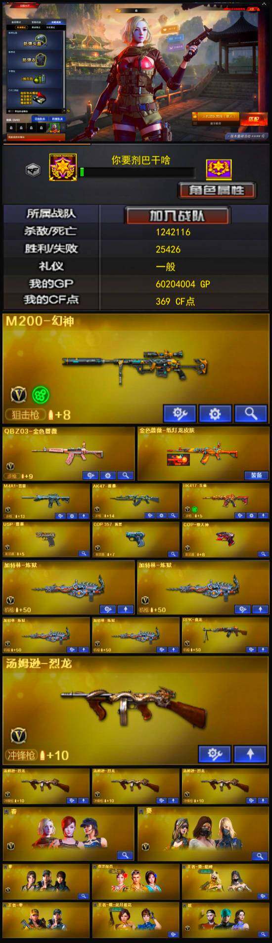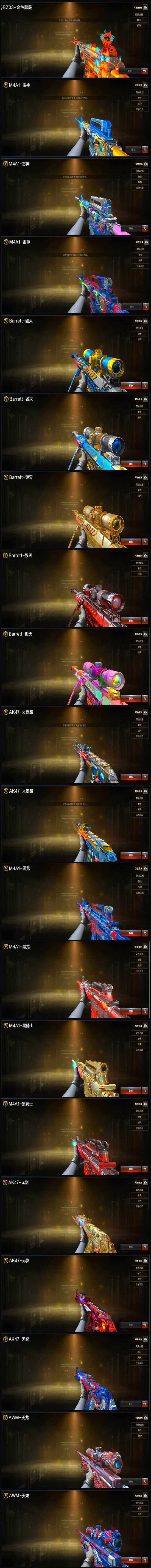 【热门武器】:QBZ03-金色蔷薇,HK417-朱雀,M200-幻神,M4A1-黑骑士,汤姆逊-烈龙*4,RPK-盘龙,加特林-炼狱*4,火麒麟-绝迹,USP-雷暴,COP-堕天神,沙鹰-修罗*5