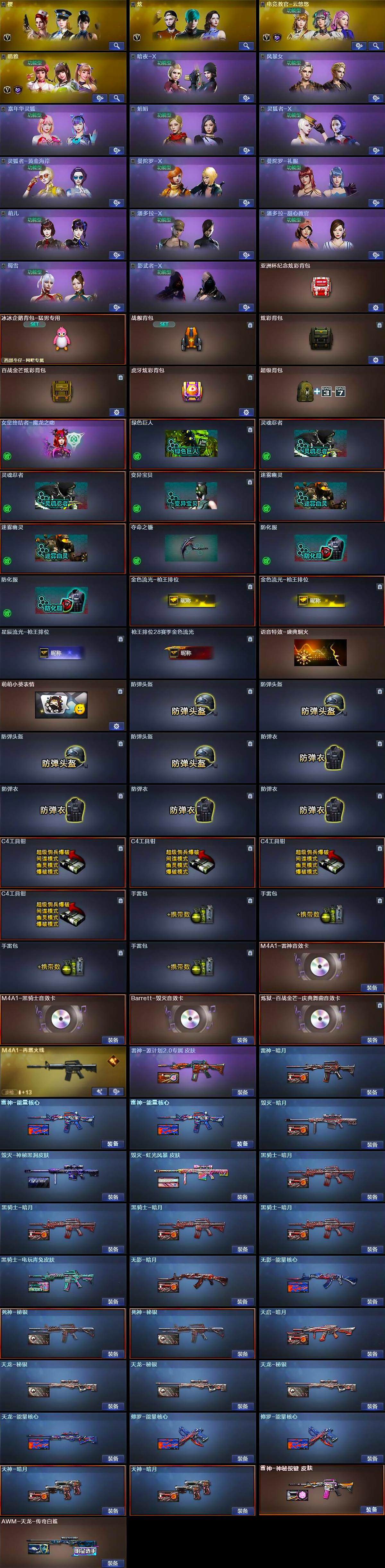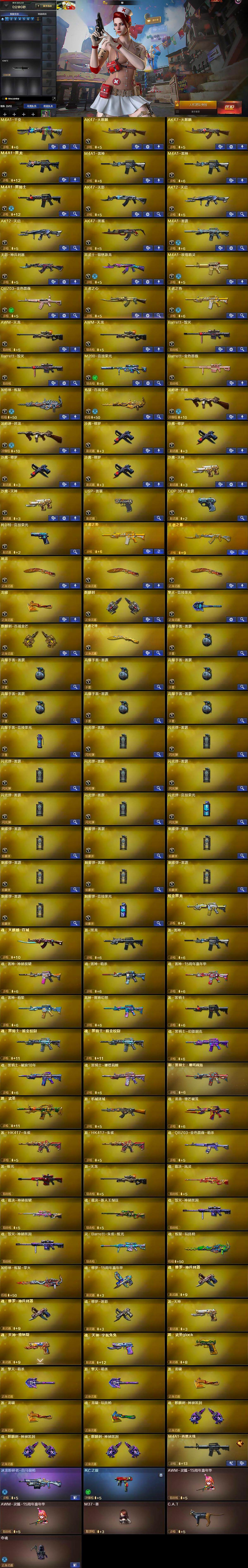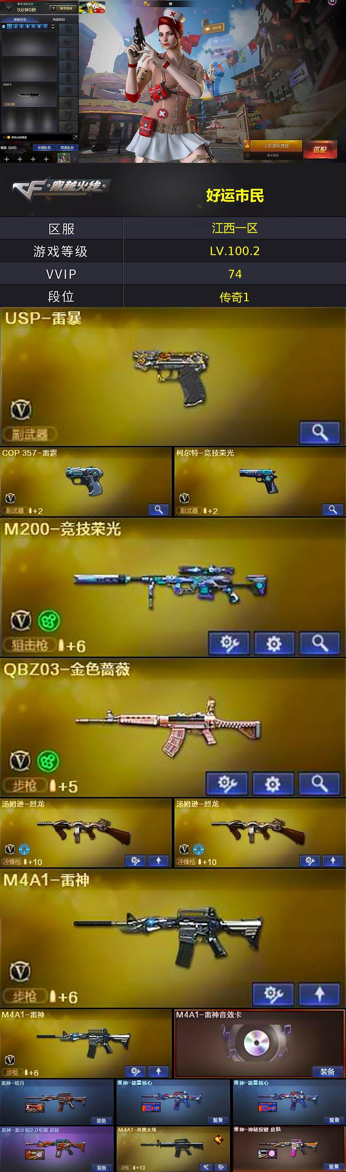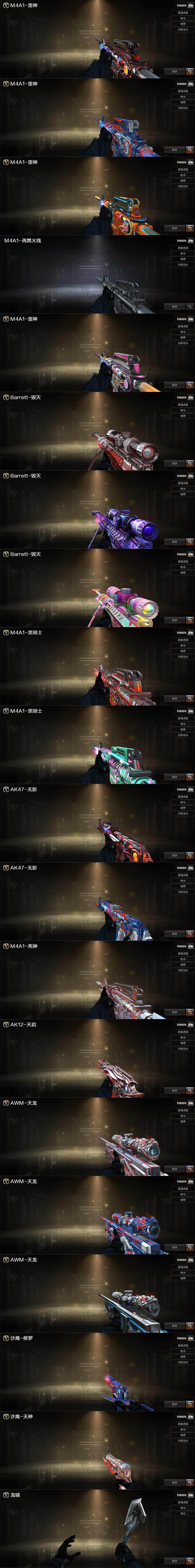 【热门武器】:QBZ03-金色蔷薇,M200-竞技荣光,死亡之眼,C.A.T,M4A1-黑骑士,汤姆逊-烈龙*2,加特林-炼狱,USP-雷暴,沙鹰-修罗*4,金刚伞