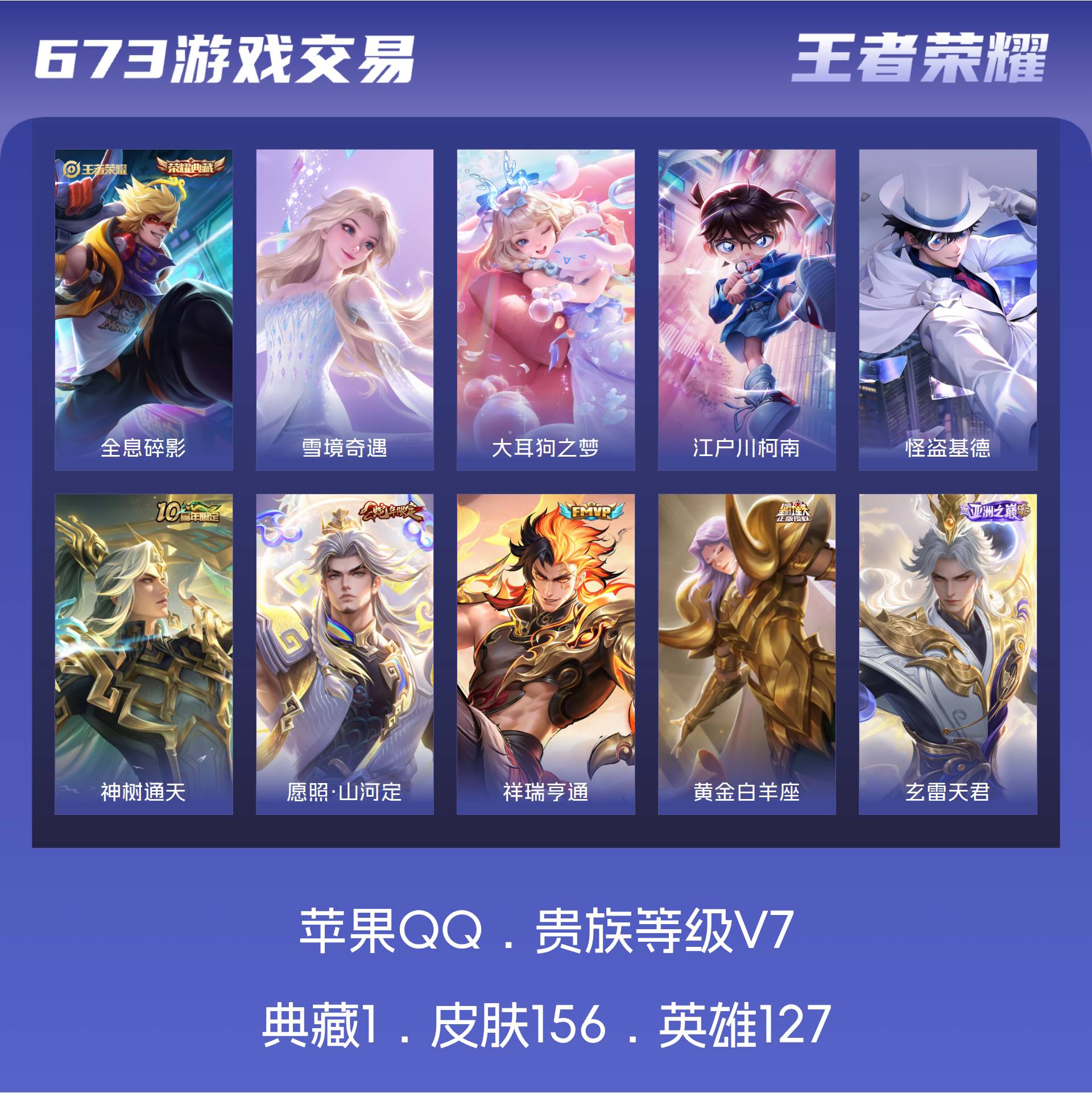 V7 皮肤156 英雄127 永恒钻石 荣耀典藏1 无双皮肤1 珍品传说3 传说7 其他皮肤149