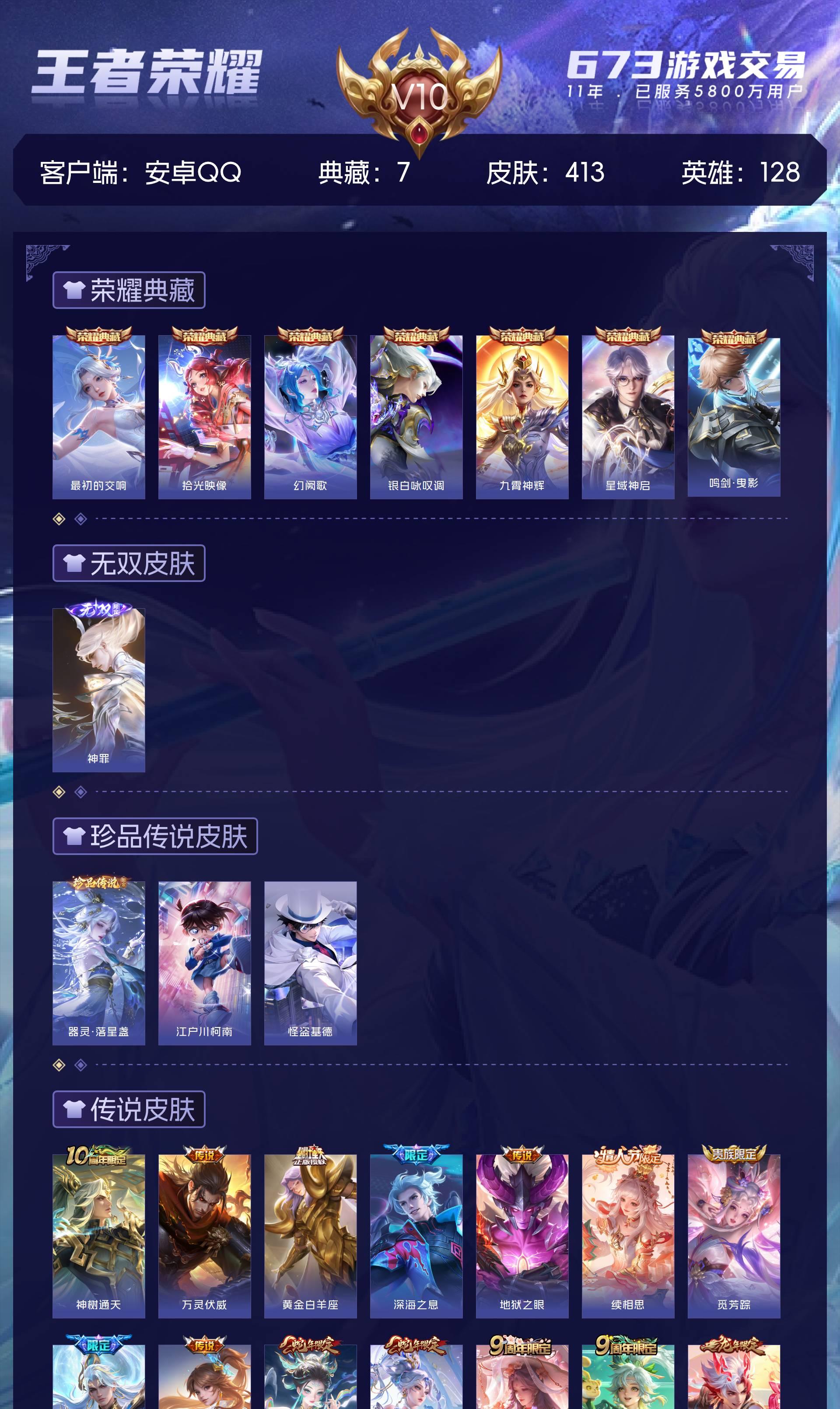 安卓QQ/至尊星耀/413皮肤/128英雄/7典藏/0珍品无双/1无双/3珍品传说/32传说/119