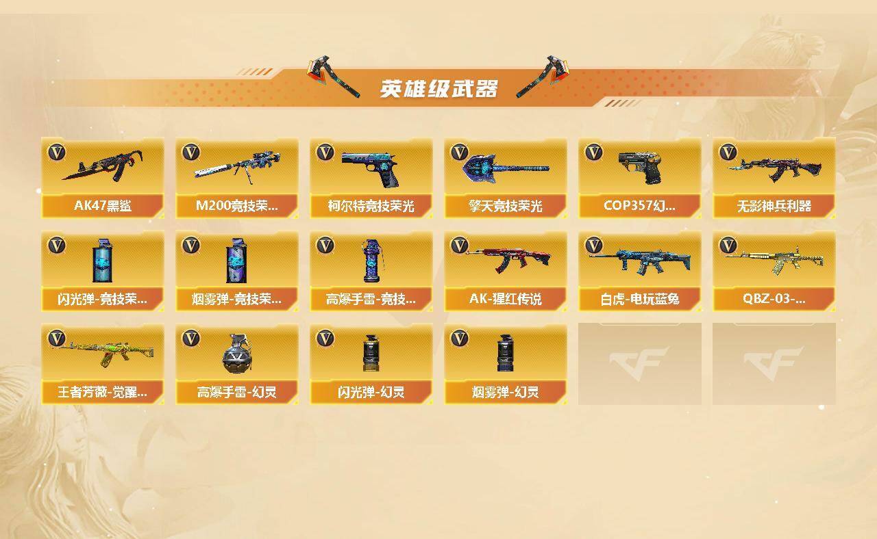 【热门武器】:传说灵眸,QBZ03-金色蔷薇,HK417-朱雀,M200-幻神,M200-竞技荣光,白虎-电玩蓝兔,M4A1-黑骑士,羊驼玩偶,毁灭-孙三炮,COP 357-幻灵,沙鹰-修罗*5
