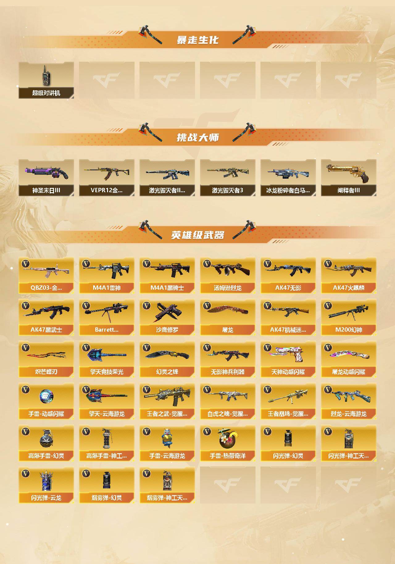 【热门武器】:传说破晓,QBZ03-金色蔷薇,M200-幻神,炼狱-迷你小钢,牛牛-AK47,M4A1-黑骑士,汤姆逊-烈龙,金色蔷薇-空,COP-白鲨,沙鹰-修罗*3,炽芒蝶刃