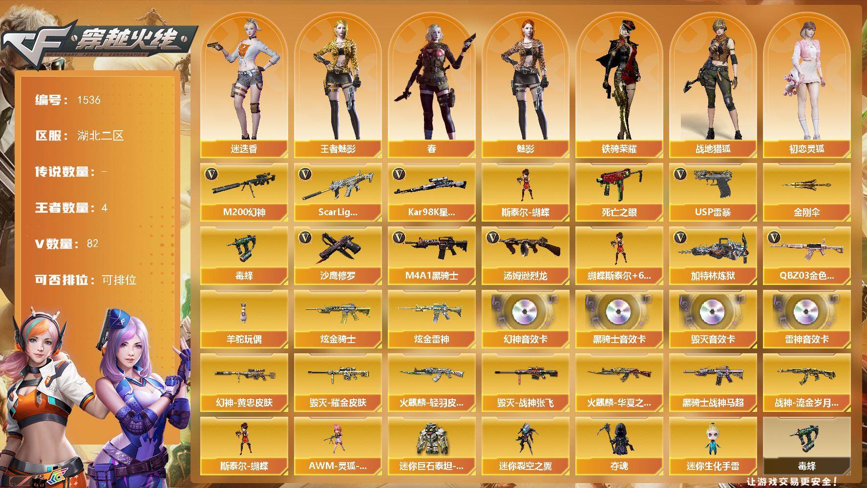 【热门武器】:传说圣灵,QBZ03-金色蔷薇,Scar Light-白虎,M200-幻神,M200-竞技荣光,死亡之眼,荣耀世冠-火麒麟,荣耀世冠-雷神,白虎-电玩蓝兔,柯尔特-冠军之特,荣耀世冠-柯尔特,Cat-刀锋,炼狱-迷你小钢,毒蜂,牛牛-AK47,M4A1-黑骑士*7,汤姆逊-烈龙*6,加特林-炼狱*7,斯泰尔-蝴蝶