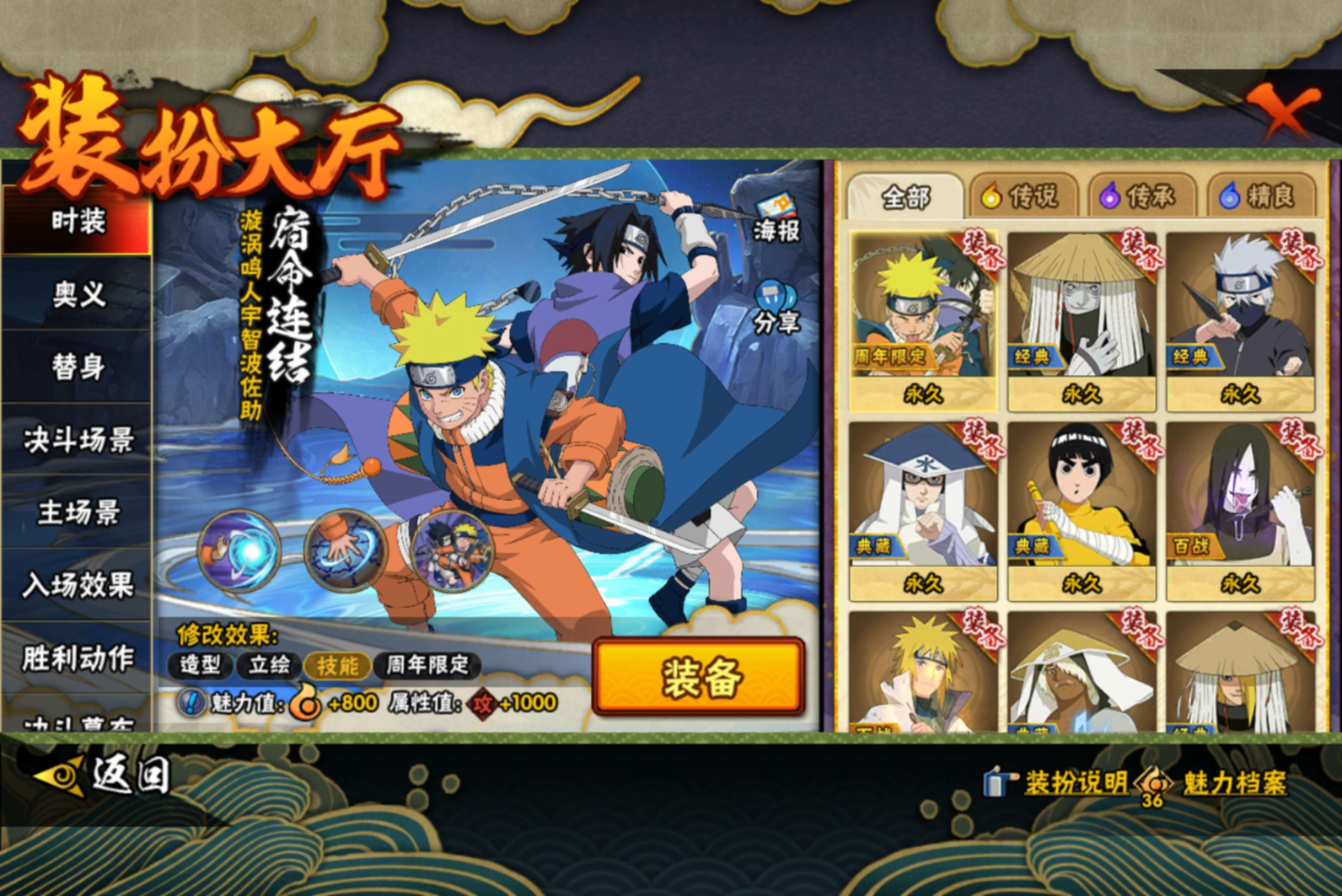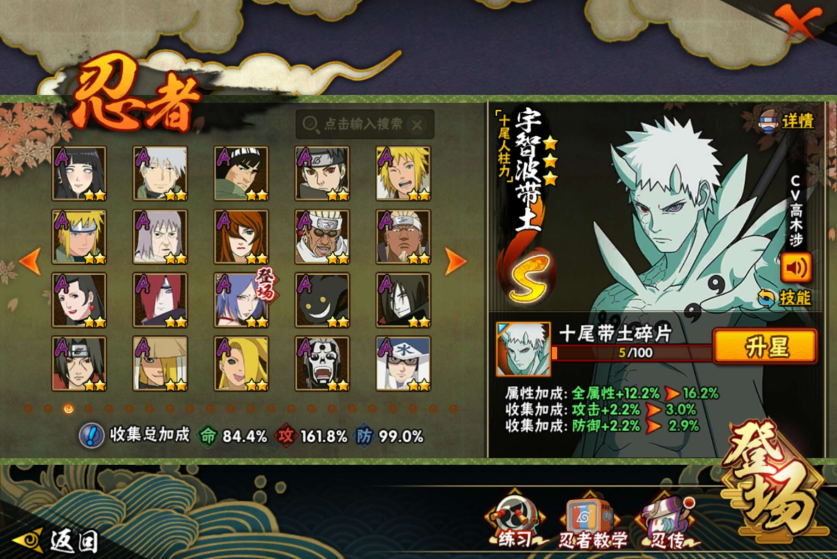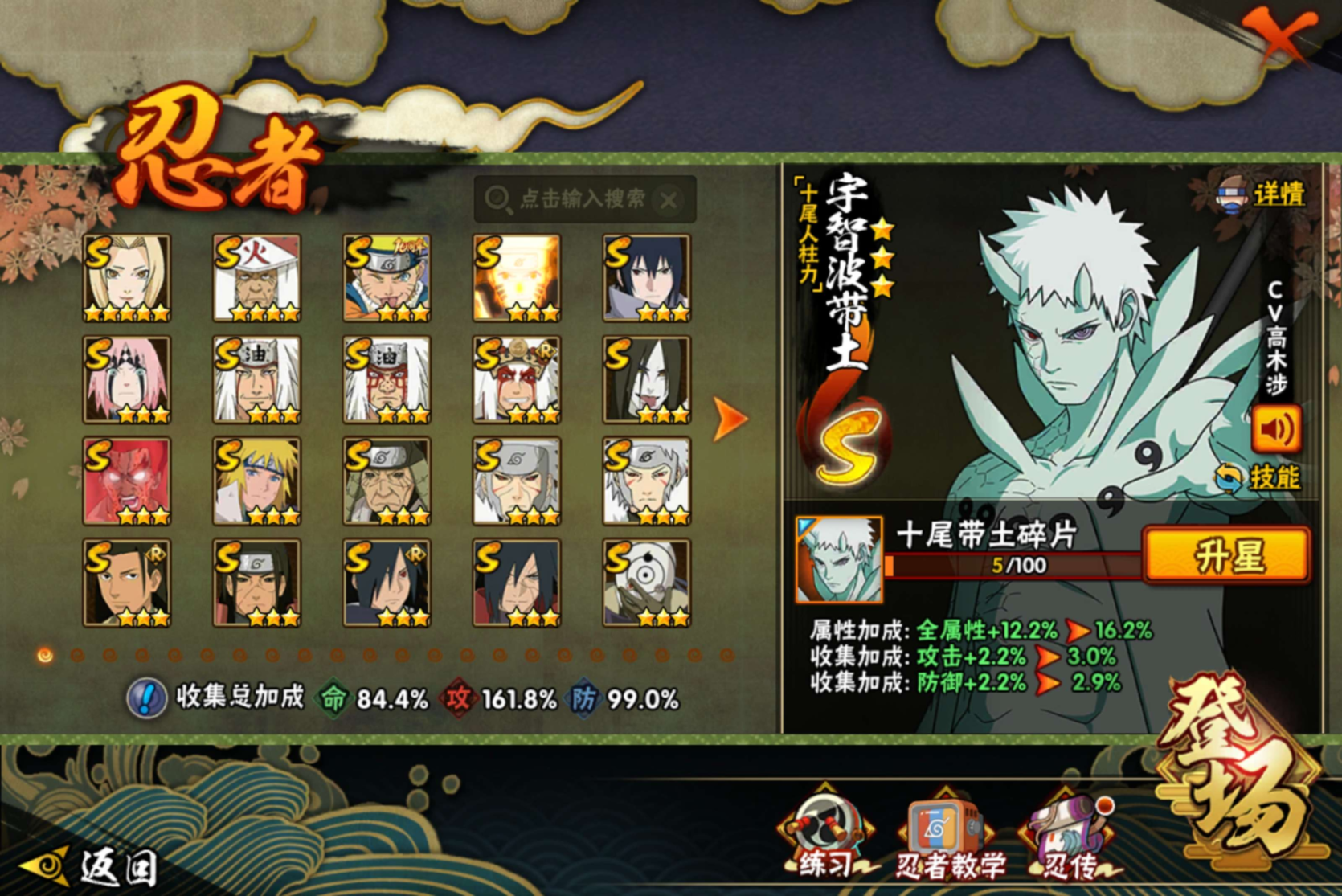 【S级忍者】宇智波带土「忍界大战」(3星),宇智波斑「木叶创立」(3星),迈特凯「死门」(3星),大野木「忍界大战」(3星),宇智波斑「秽土转生·解」(3星),宇智波佐助「永恒万花筒」(3星),大筒木桃式(3星),神秘面具男「红夜之刃」(3星),大筒木金式(3星),艾「忍界大战」(3星),春野樱「