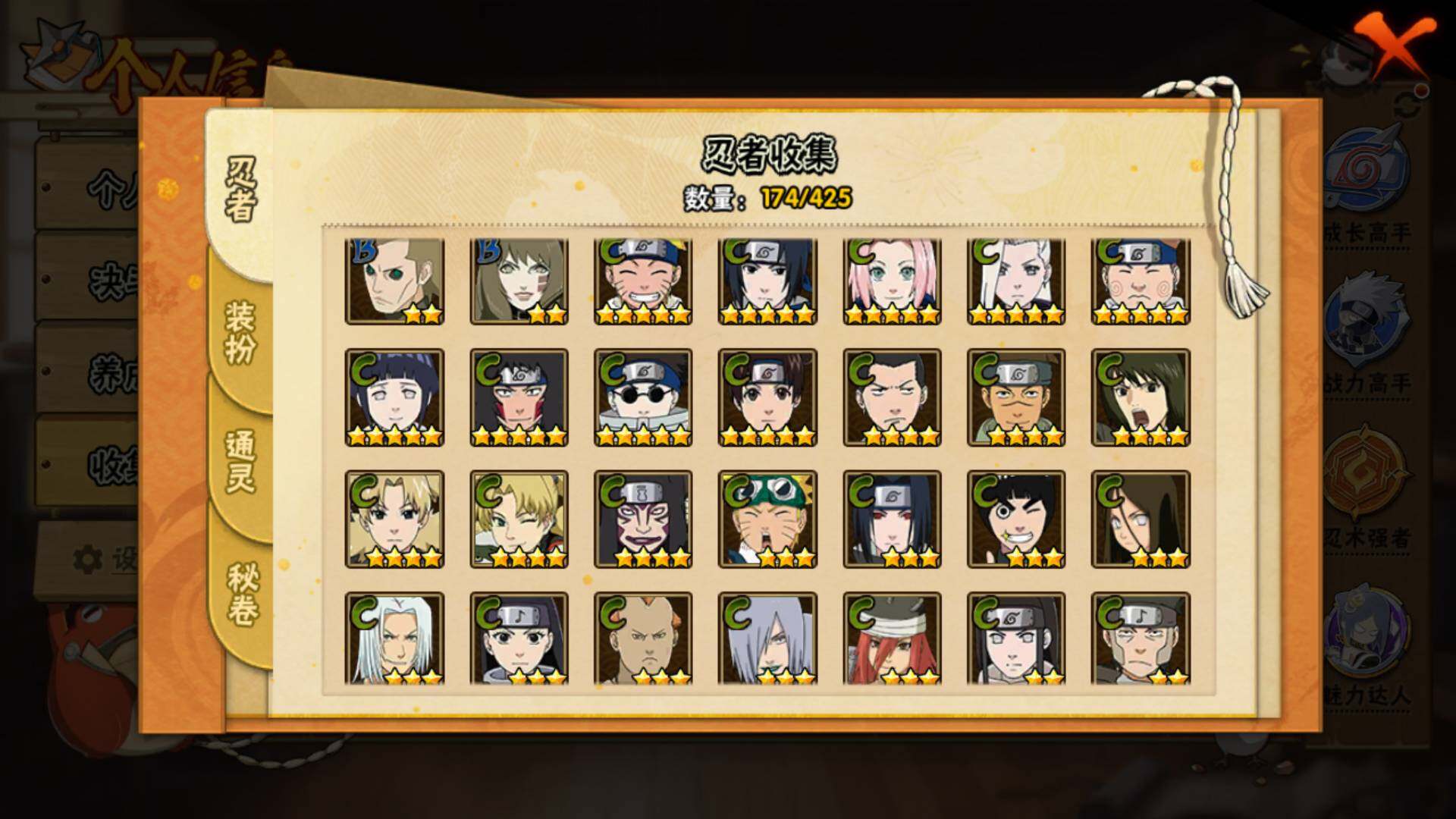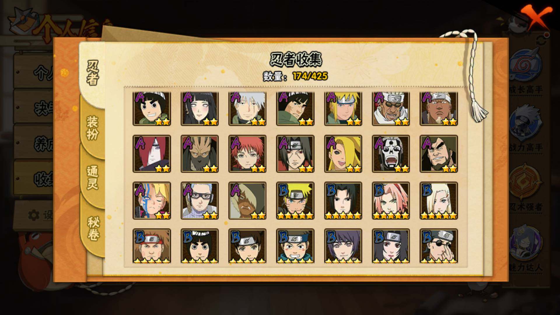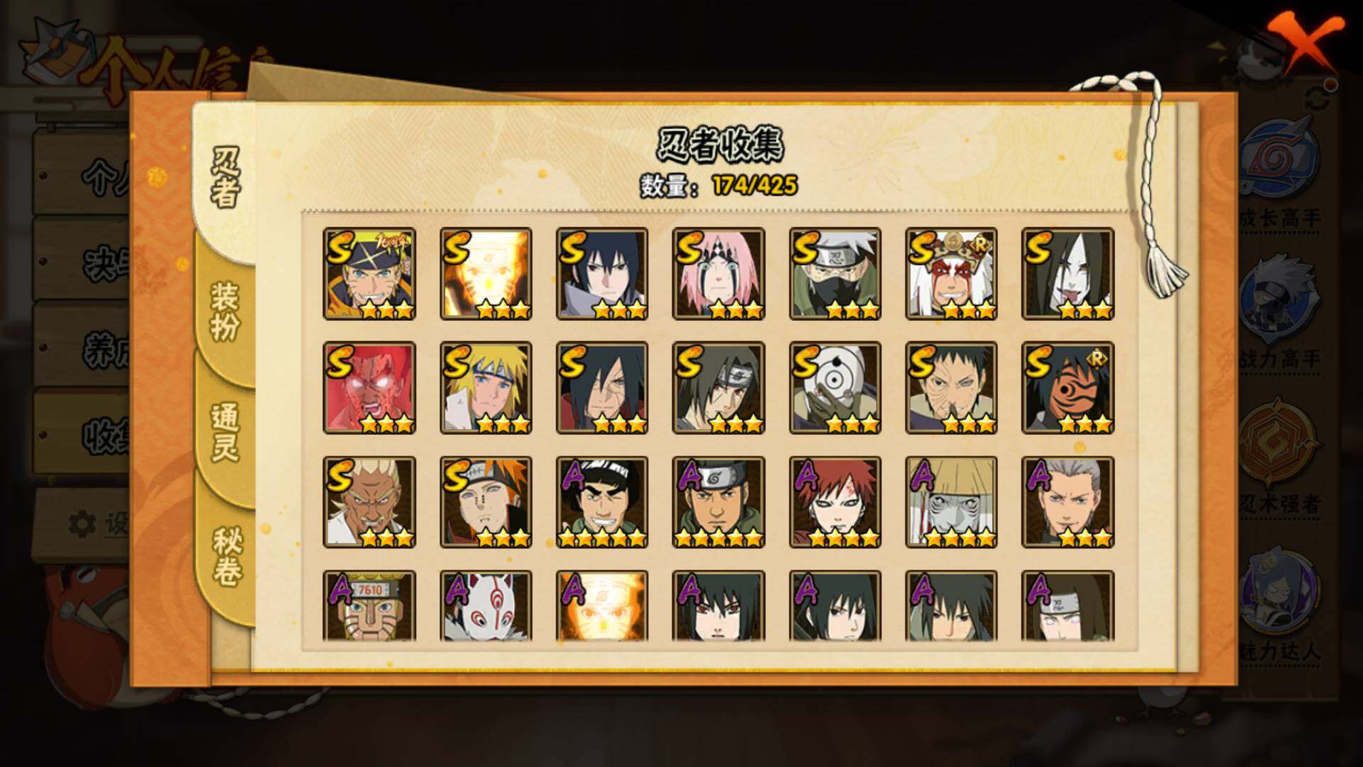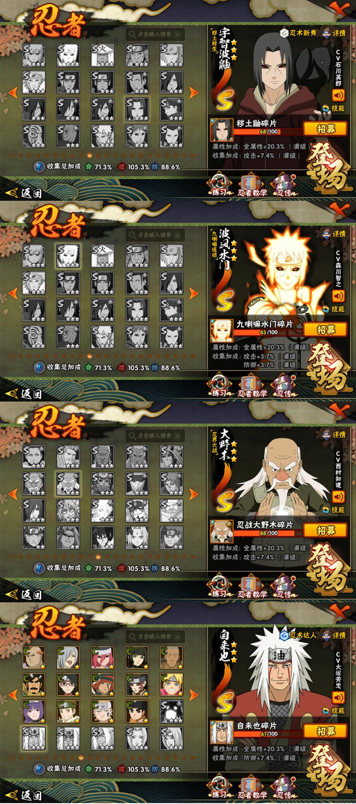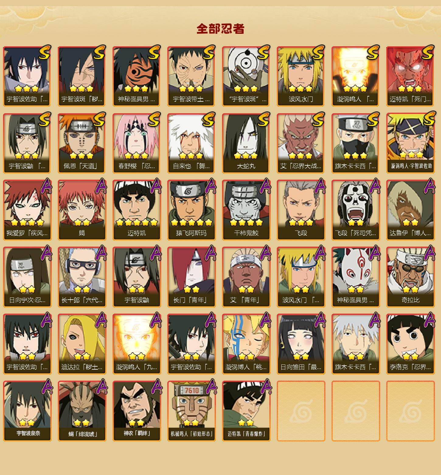 【S级忍者】:宇智波斑「秽土转生·解」(3星),春野樱「忍界大战」(3星),宇智波带土「忍界大战」(3星),艾「忍界大战」(3星),宇智波鼬「须佐能乎」(3星),旗木卡卡西「须佐能乎」(3星),自来也「舞之豪杰」(3星),大蛇丸(