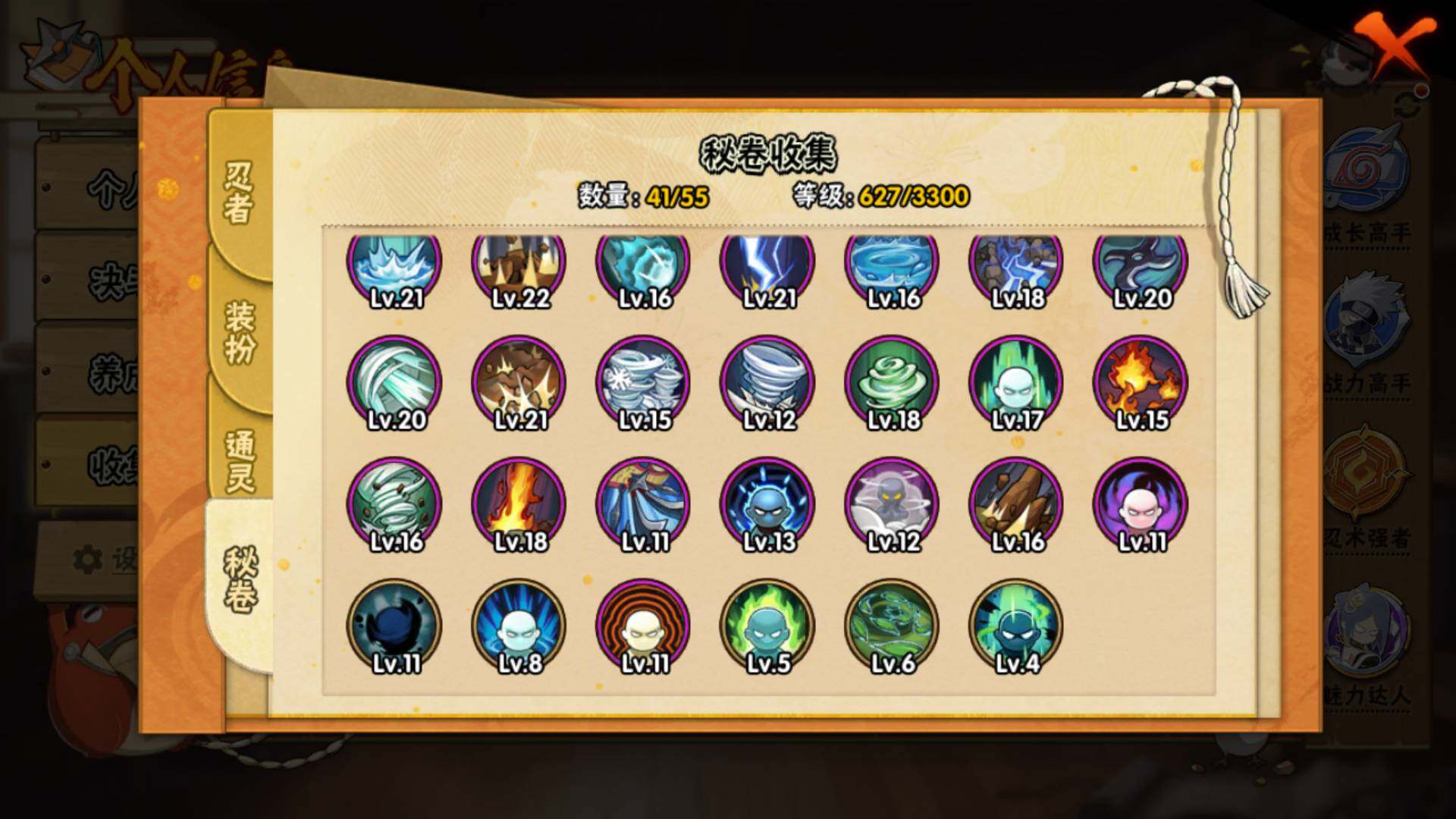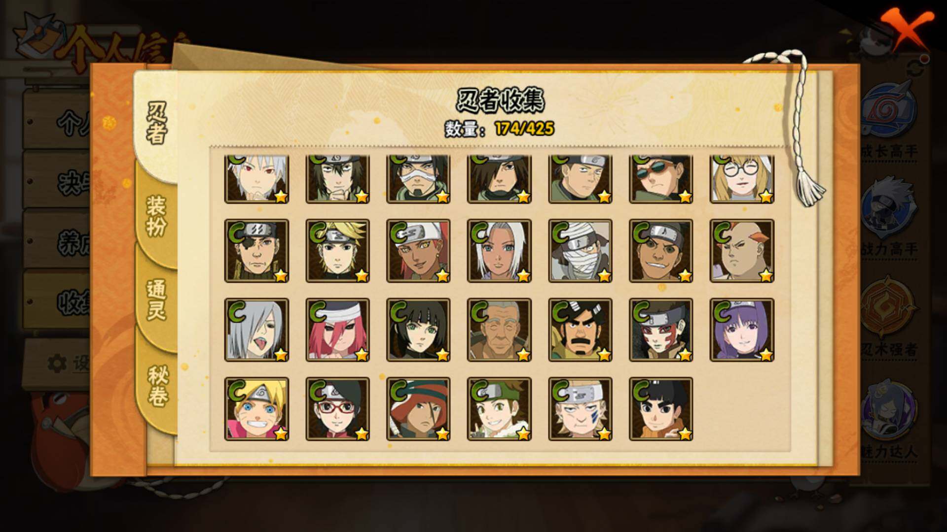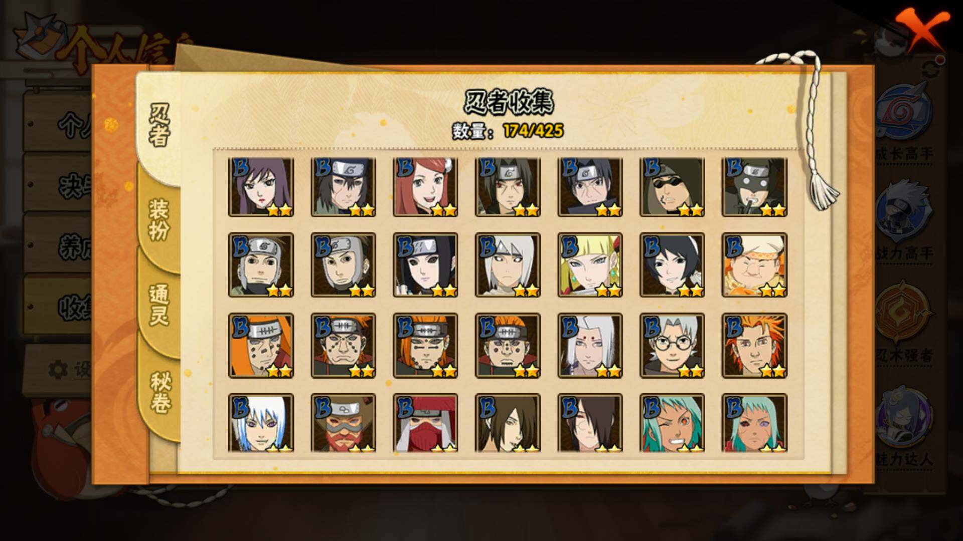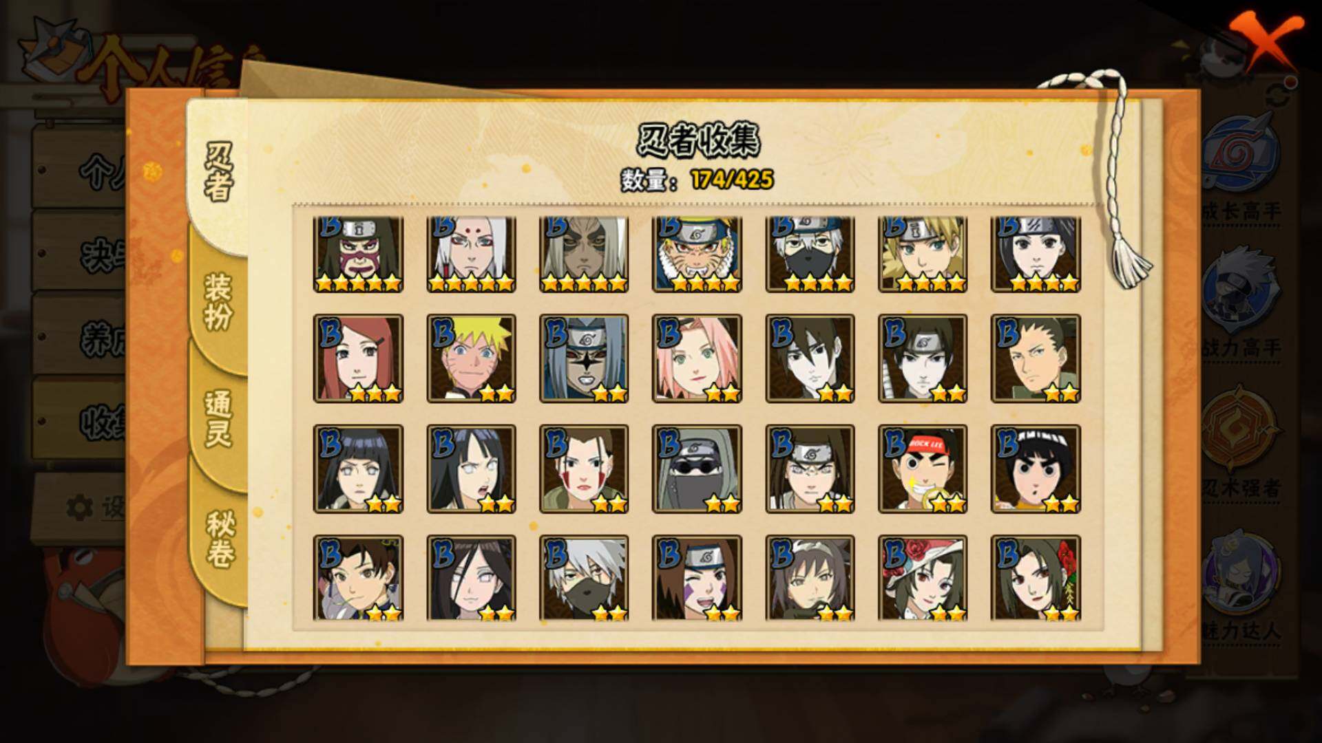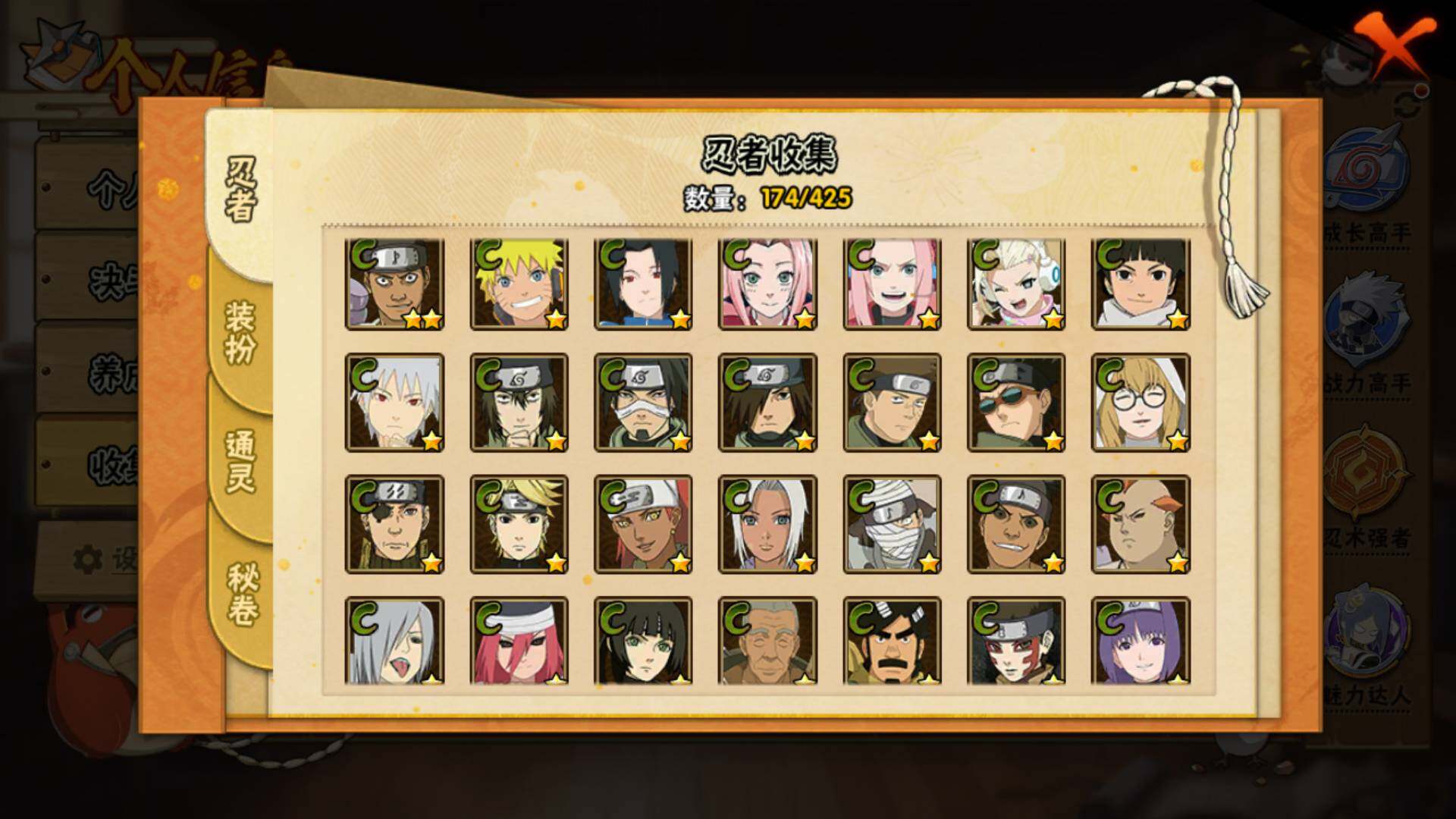 【S级忍者】:宇智波斑「秽土转生·解」(3星),春野樱「忍界大战」(3星),宇智波带土「忍界大战」(3星),艾「忍界大战」(3星),宇智波鼬「须佐能乎」(3星),旗木卡卡西「须佐能乎」(3星),自来也「舞之豪杰」(3星),大蛇丸(