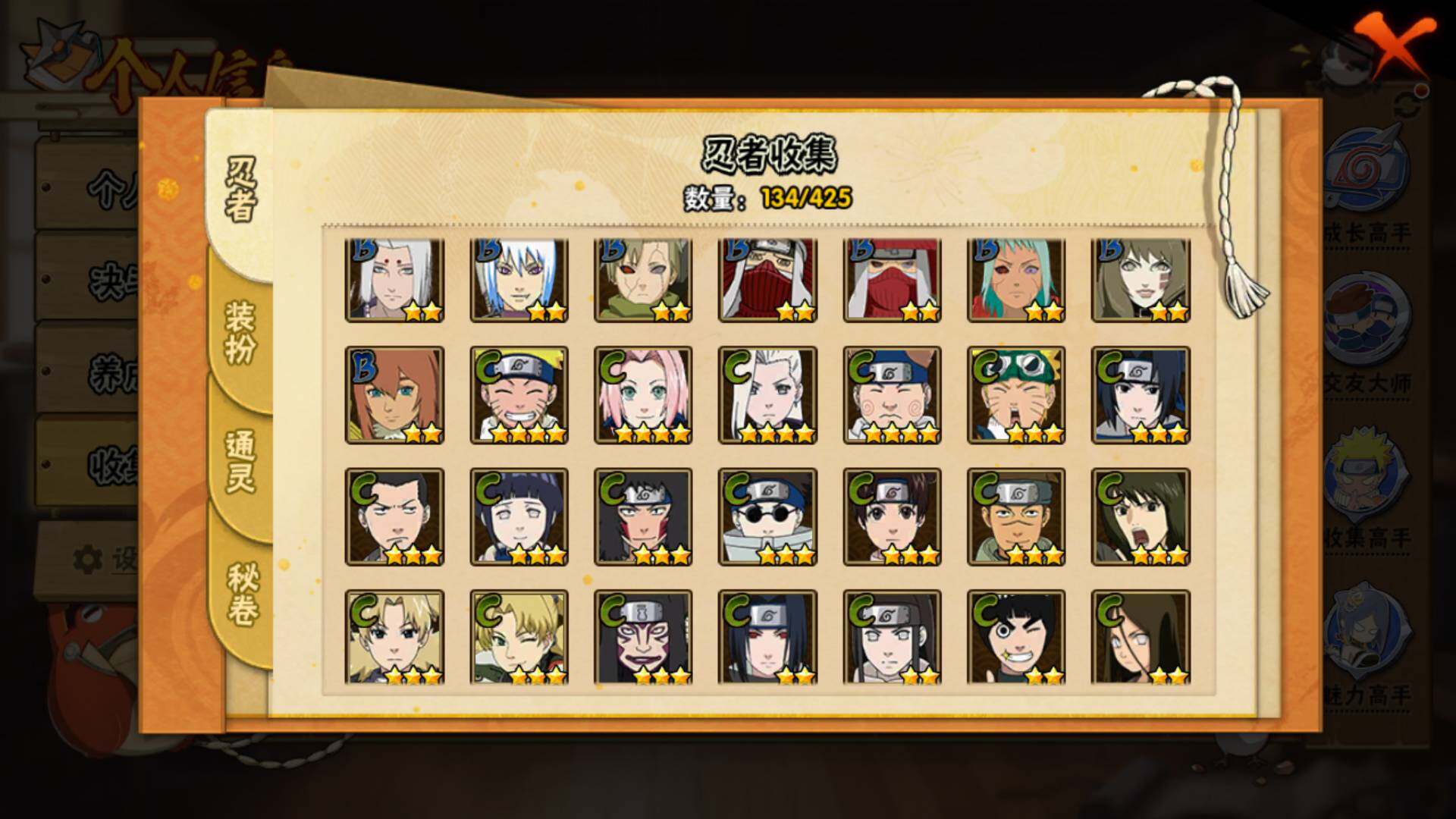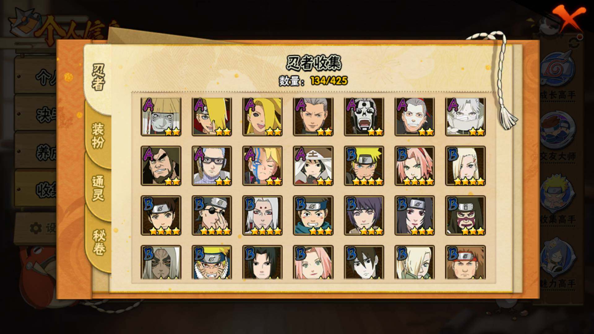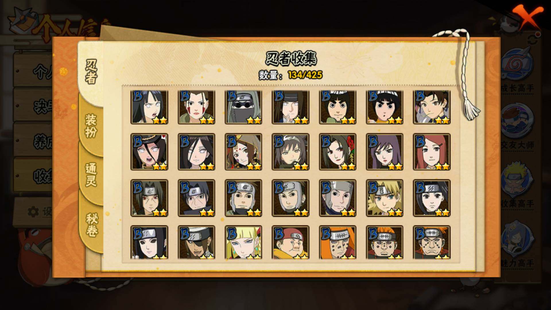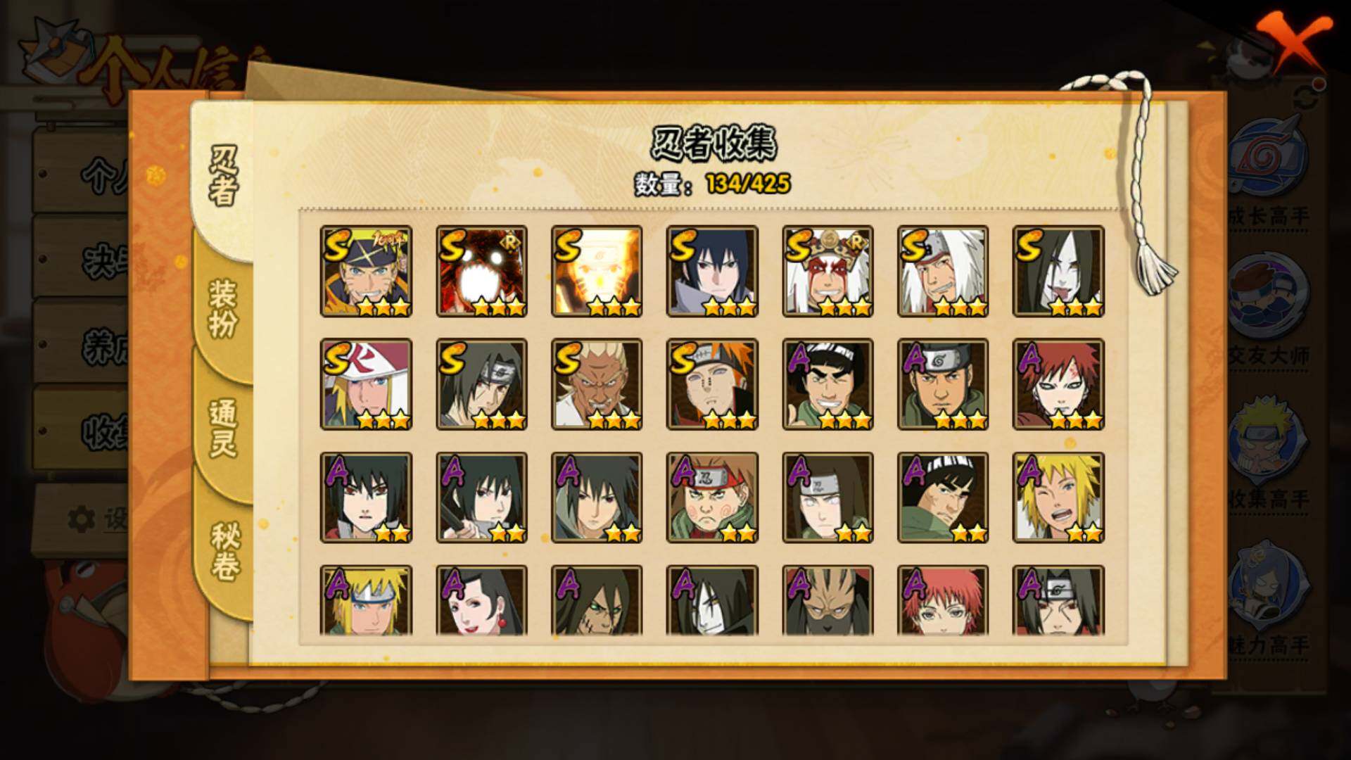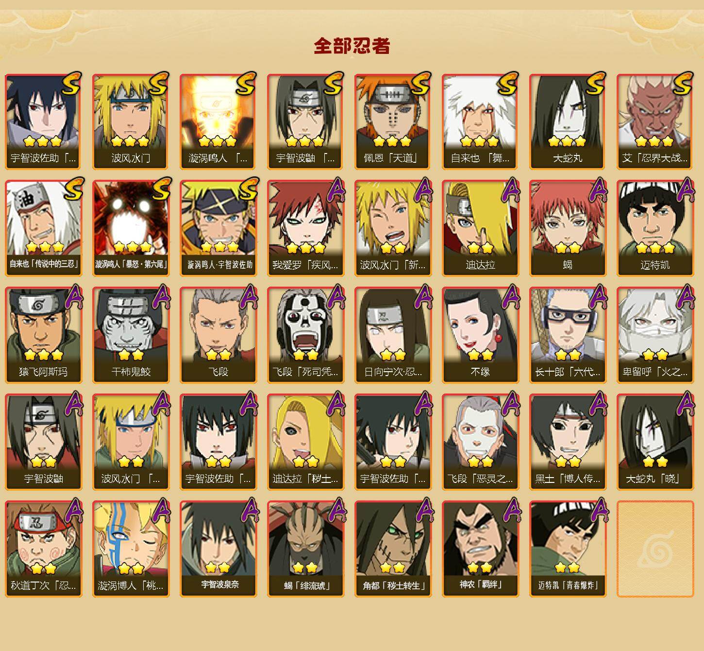 【S级忍者】:艾「忍界大战」(3星),宇智波鼬「须佐能乎」(3星),自来也「舞之豪杰」(3星),大蛇丸(3星),自来也「传说中的三忍」(3星),波风水门(3星),漩涡鸣人「九喇嘛连结」(3星),佩恩「天道」(3星),宇智波佐助「永恒万花筒」(3星),漩涡鸣人「