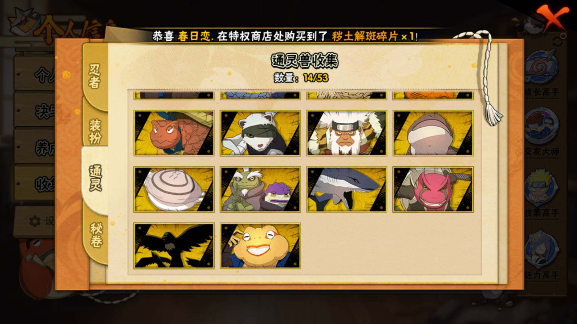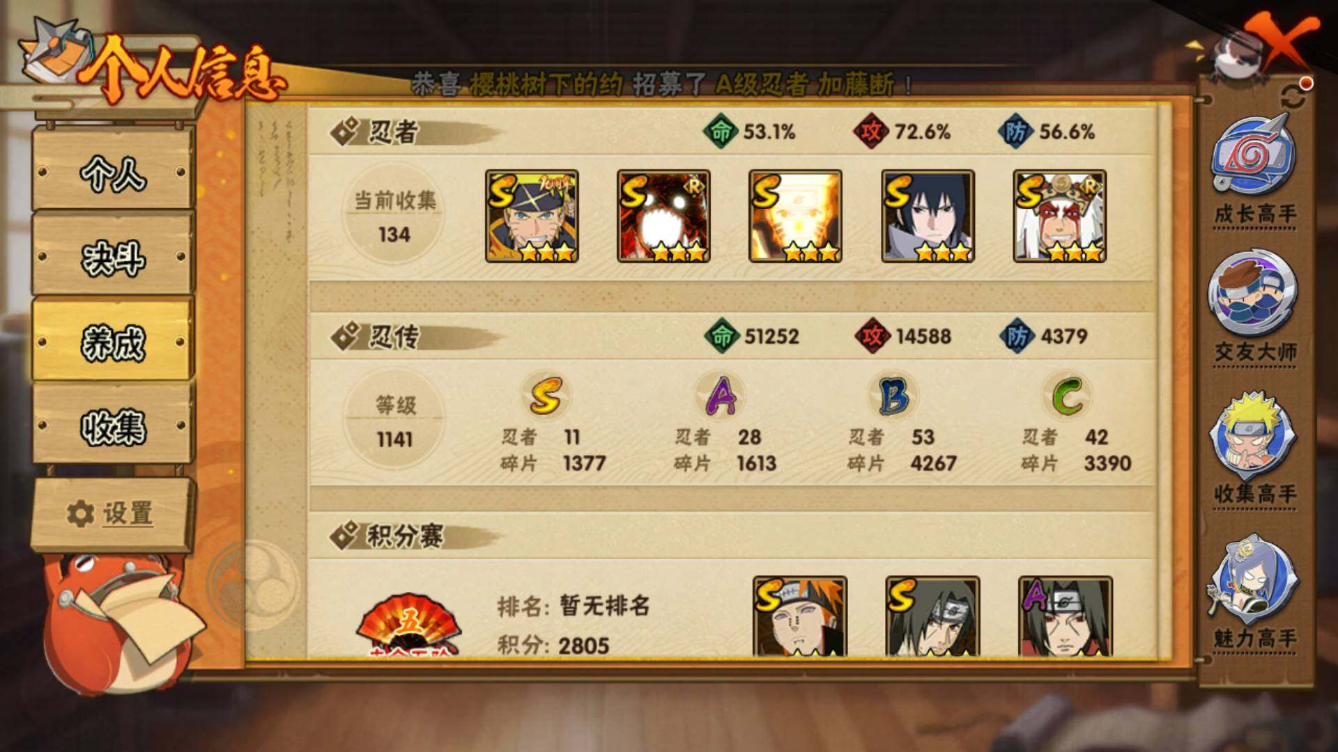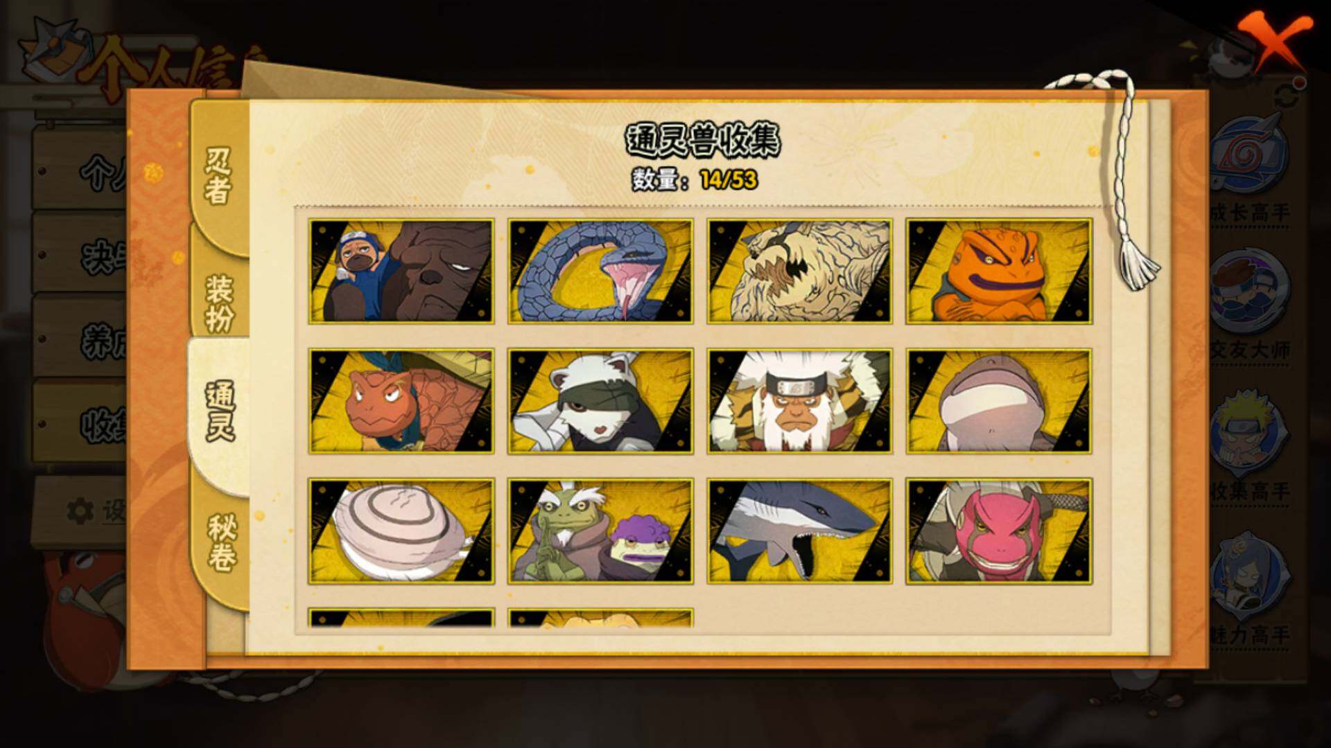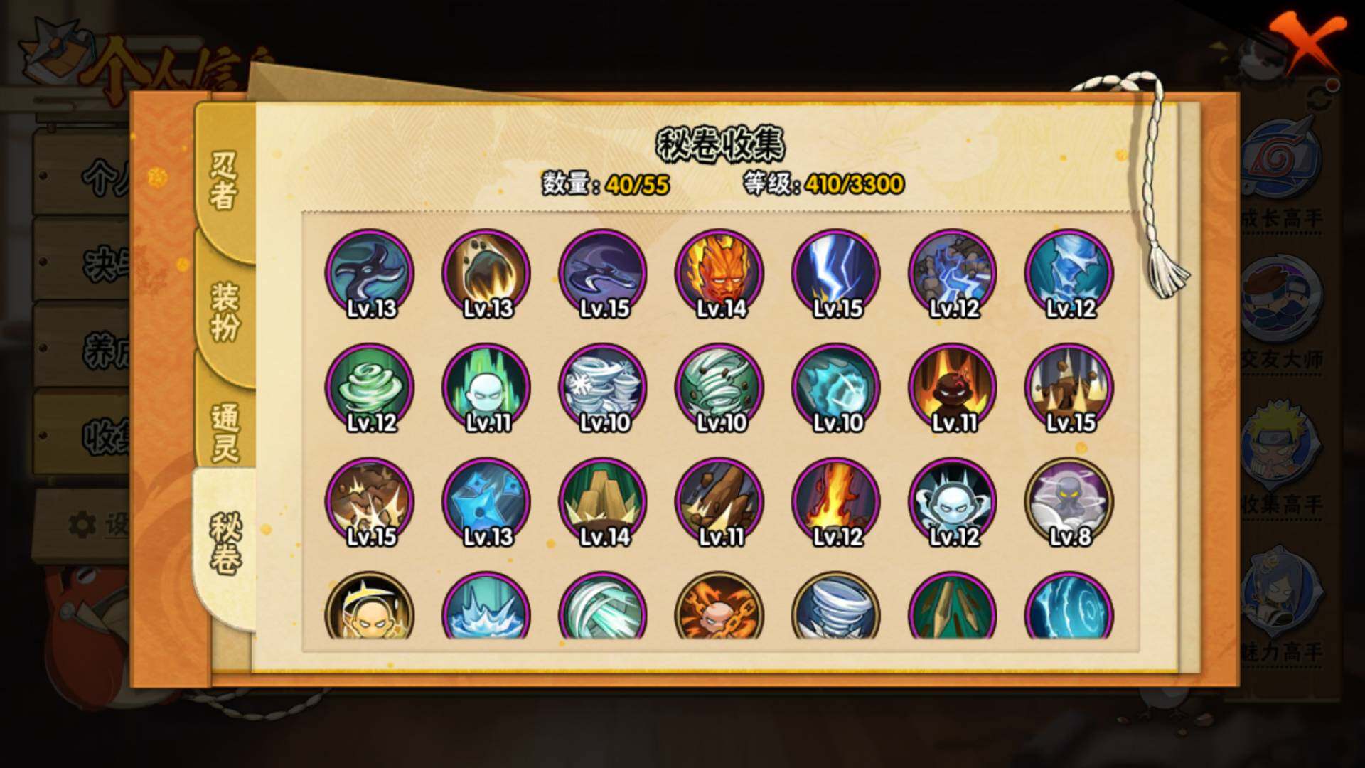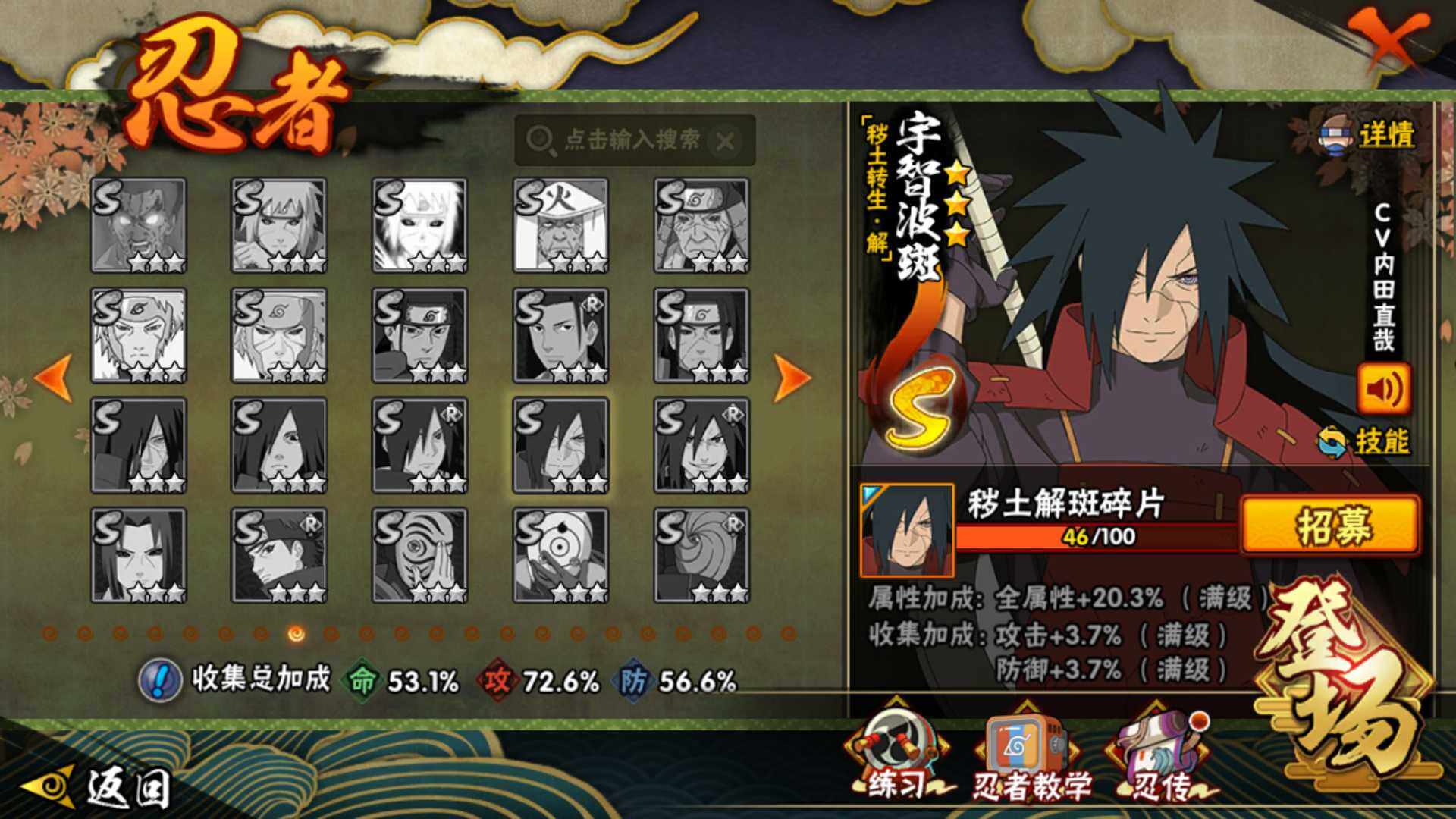 【S级忍者】:艾「忍界大战」(3星),宇智波鼬「须佐能乎」(3星),自来也「舞之豪杰」(3星),大蛇丸(3星),自来也「传说中的三忍」(3星),波风水门(3星),漩涡鸣人「九喇嘛连结」(3星),佩恩「天道」(3星),宇智波佐助「永恒万花筒」(3星),漩涡鸣人「