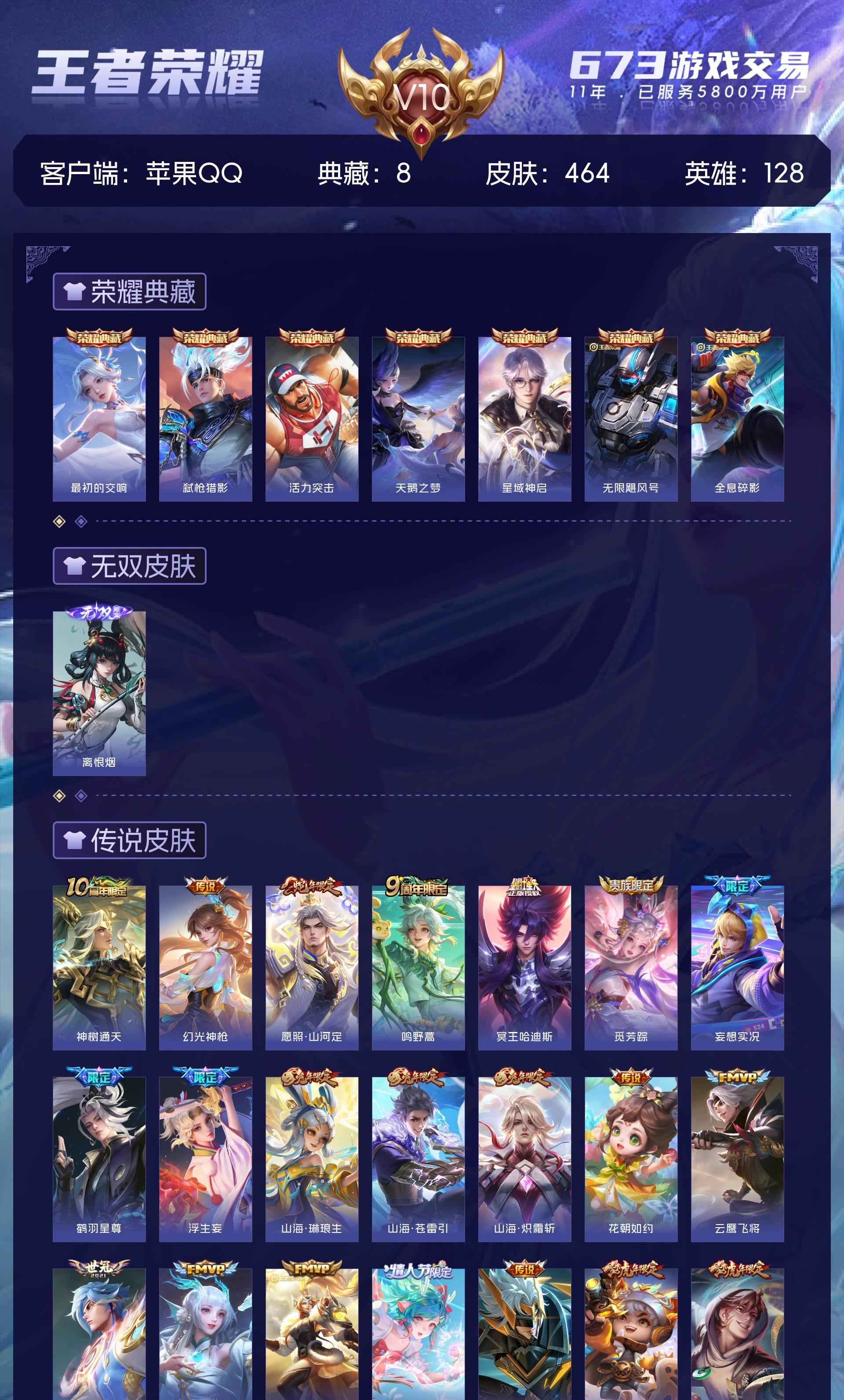 苹果QQ/至尊星耀/464皮肤/128英雄/7典藏/0珍品无双/1无双/0珍品传说/54传说/157