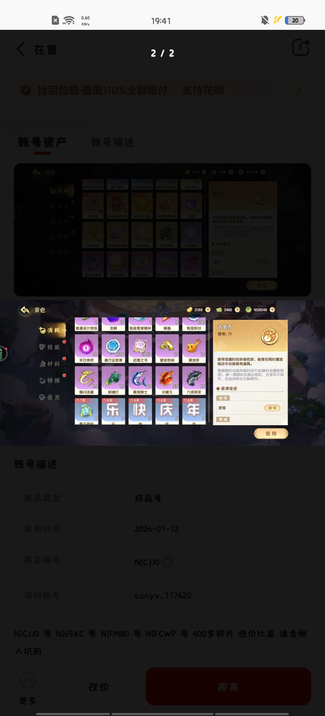 通过App,与卖家商议价格及保险,并向卖家索要账号最新截图,确认后下单购买。
