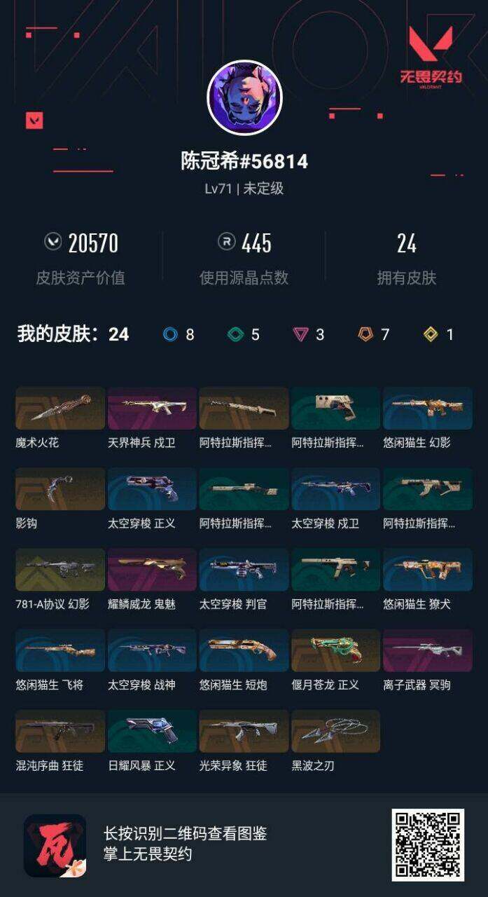 终极*7/传奇*1/卓越*3/皮肤*24/等级*71/段位:未定级/幻棱/炼狱/维斯/暮蝶/壹决/铁臂/捷风/