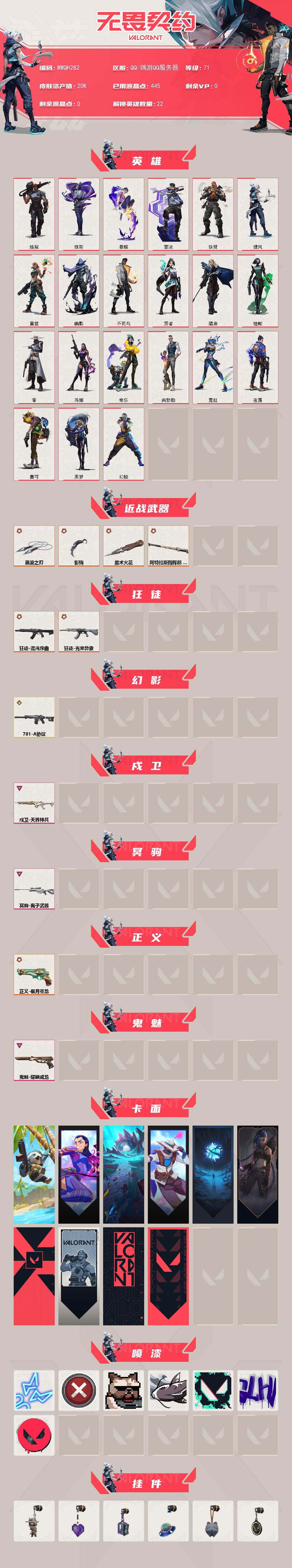 【WWQH282】终极*7/传奇*1/卓越*3/皮肤*24/等级*71/段位:未定级/幻棱/炼狱/维斯/暮蝶/壹决/铁臂/捷风/雷兹/幽影/不死鸟/贤者/猎枭/蝰蛇/零/芮娜/奇乐/尚勃勒/霓虹/夜露/盖可/黑梦/近战武器-魔术火花/近战武器-影钩/近战武器-黑波之刃/近战武器-阿特拉斯指挥部 甩棍/狂徒-混沌序曲/狂徒-光荣异象/幻影-781-A协议/戍卫-天界神兵/冥驹-离子武器/正义-偃月苍龙/鬼魅-耀鳞威龙/树懒大作战 卡面/无畏契约GO!第一卷:芮娜 卡面/珍珠棘贝 卡面/无畏契约GO