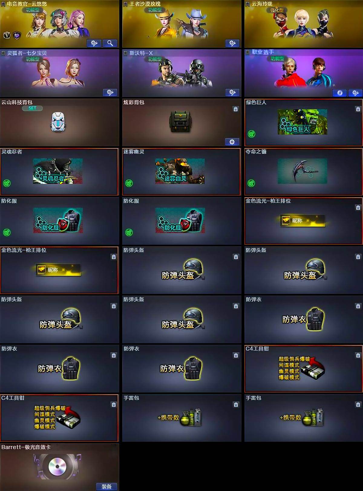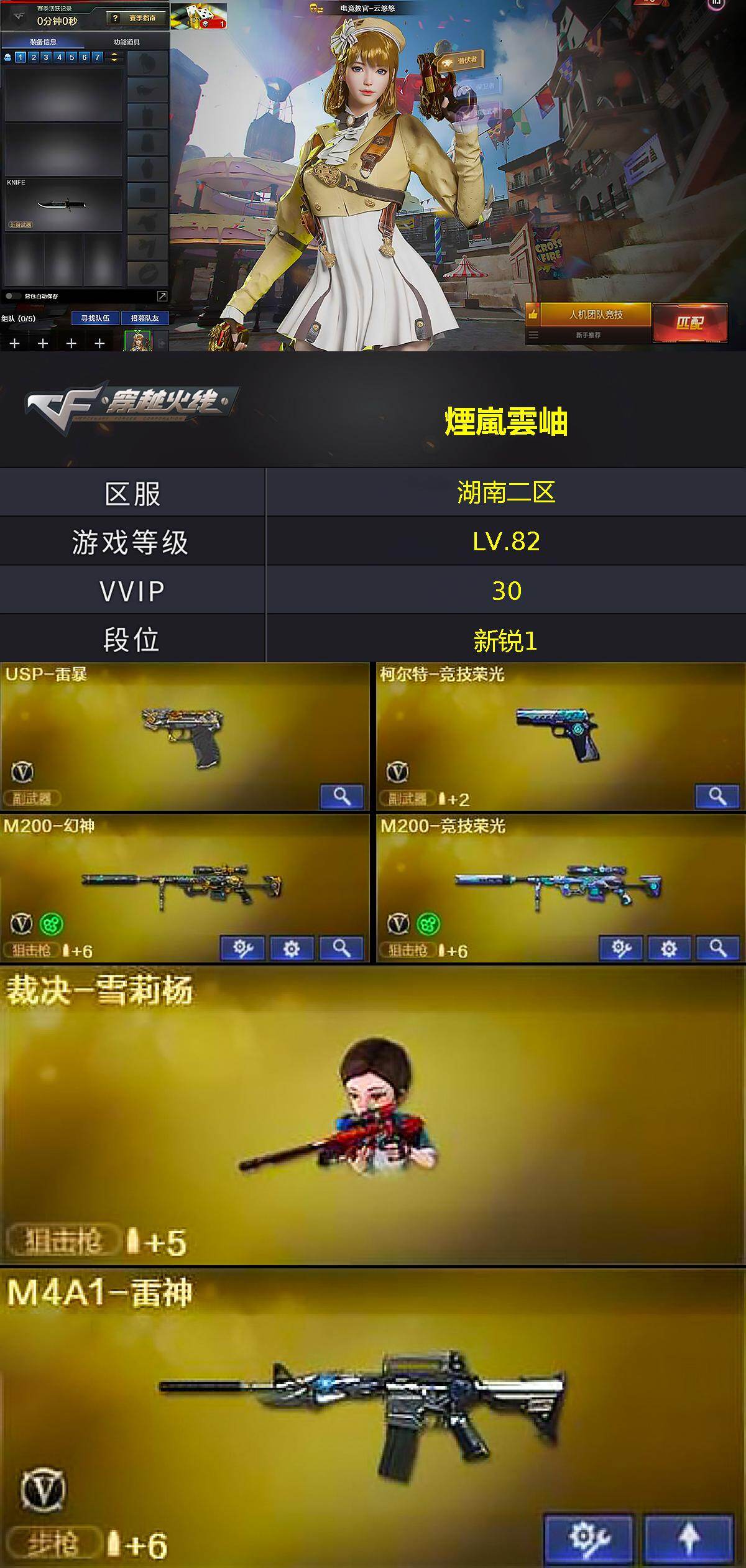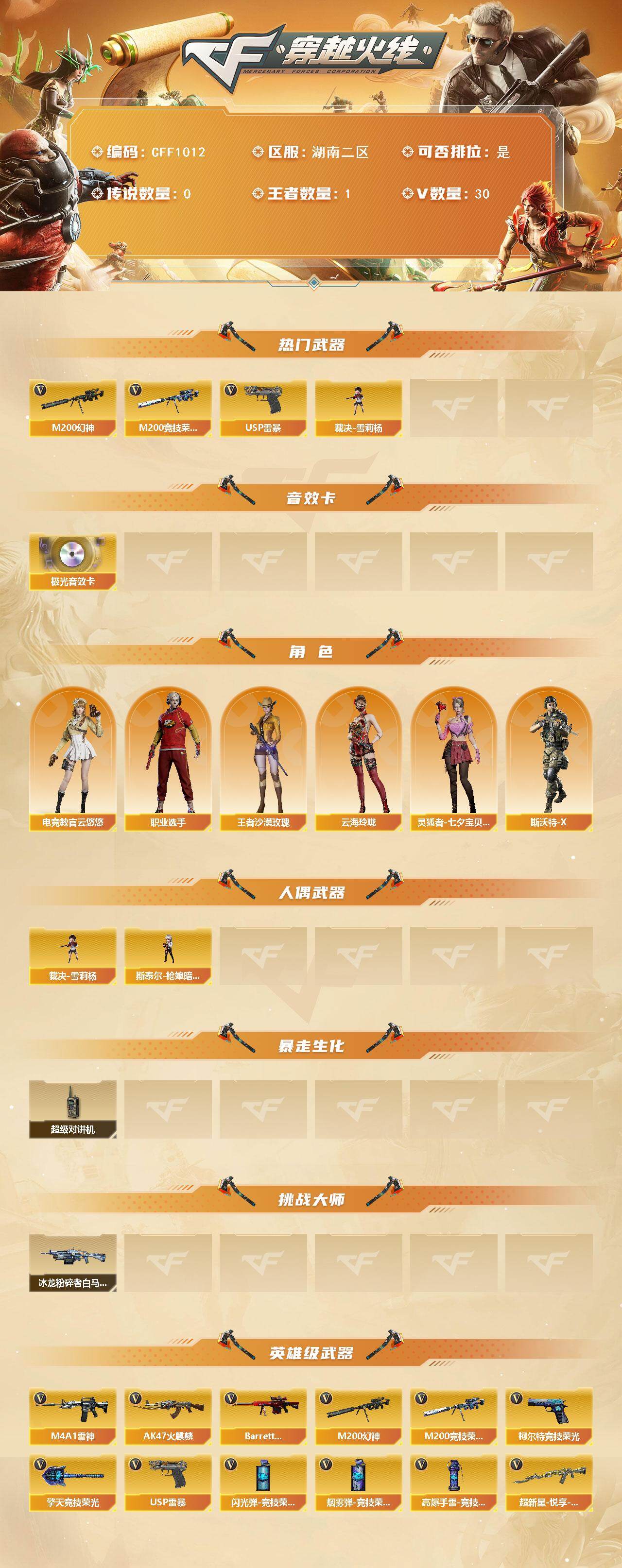 【CFF1012】29V/82级/将帅/1王者/1英雄/M200_幻神/M200_竞技荣光/裁决-雪莉杨/USP_雷暴/Barrett-极光音效卡/电竞教官云悠悠/王者沙漠玫瑰/云海玲珑/灵狐者-七夕宝贝/斯沃特-X/职业选手/斯泰尔-枪娘暗刃/超级对讲机/冰龙粉碎者-白马银枪/AK47火麒麟/M4A1_雷神/超新星-悦享-觉醒版/Barrett极光/柯尔特_竞技荣光/擎天-竞技荣光/高爆手雷-竞技荣光/闪光弹-竞技荣光/烟雾弹-竞技荣光/云山科技背包/炫彩背包/绿色巨人/灵魂忍者/迷雾幽灵/夺