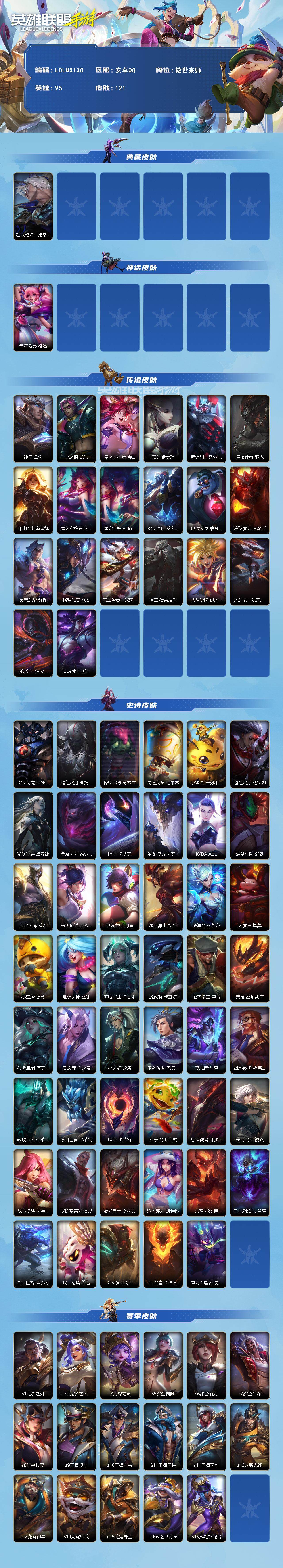 【LOLMX130】95英雄/121皮肤/傲世宗师/超武乾坤瑟提/无声裁影 格温/神王 盖伦/心之钢 凯隐/星之守护者 金克丝/魔女 伊芙琳/源计划:超体 莫德凯撒/黑夜使者 亚索/日蚀骑士 蕾欧娜/星之守护者 落 霞/星之守护者 陨 洛/霸天原祖 沃利贝尔/律政大亨 蒙多医生/炼狱魔犬 内瑟斯/灵魂莲华 瑟提/黎明使者 永恩/蕊雪盈春:兴荣 永恩/神王 德莱厄斯/战斗学院 伊泽瑞尔/源计划:泯灭 雷克顿/源计划:毁灭 派克/灵魂莲华 锤石/霸天剑魔 亚托克斯/腥红之月 亚托克斯/惊悚派对 阿木