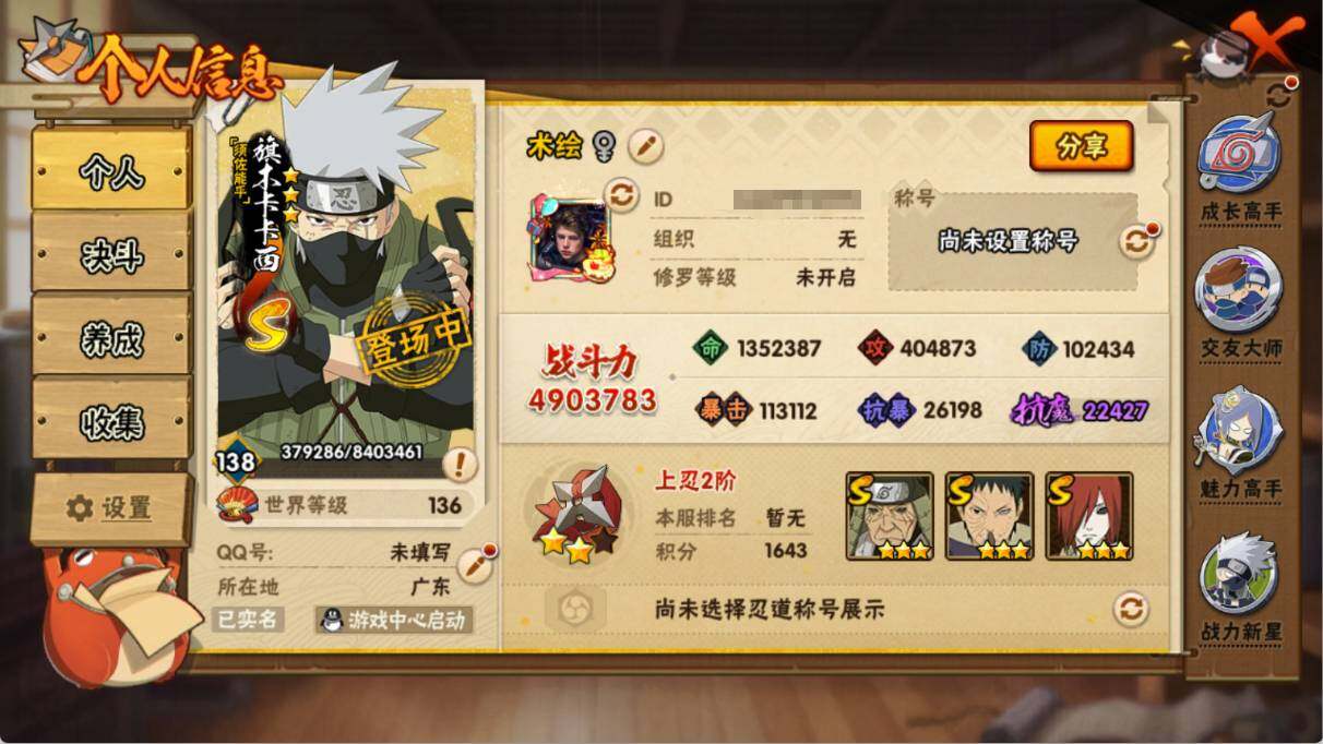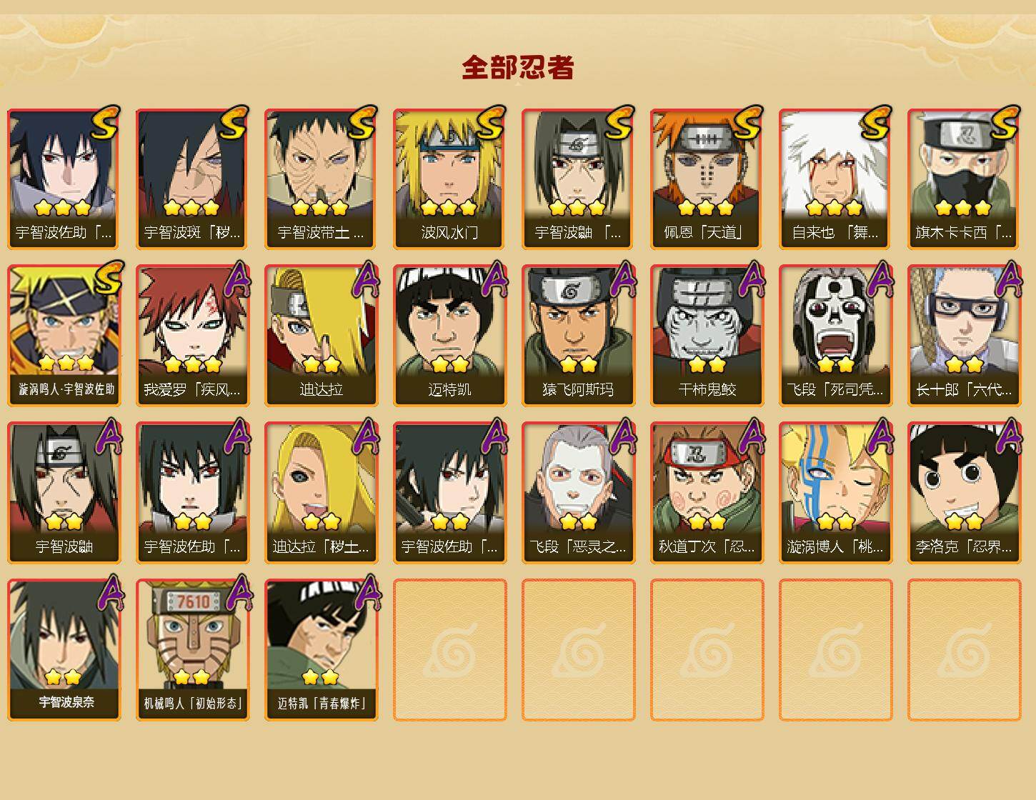 【HYYH1123】V4/战力490W/S忍9/A忍18/死司凭血-飞段/宇智波鼬/永恒万花筒-宇智波佐助/须佐能乎-旗木卡卡西/迈特凯/忍界大战-宇智波带土/天道-佩恩/3星漩涡鸣人·宇智波佐助/波风水门/忍界大战-秋道丁次/桃式显现-漩涡博人/3星我爱罗「疾风传」/忍界大战-李洛克/六代目水影-长十郎/舞之豪杰-自来也/恶灵之影-飞段/秽土转生-迪达拉/猿飞阿斯玛/万花筒写轮眼-宇智波佐助/2星宇智波泉奈/迪达拉/干柿鬼鲛/秽土转生·解-宇智波斑/2星迈特凯「青春爆炸」/须佐能乎-宇智波佐助