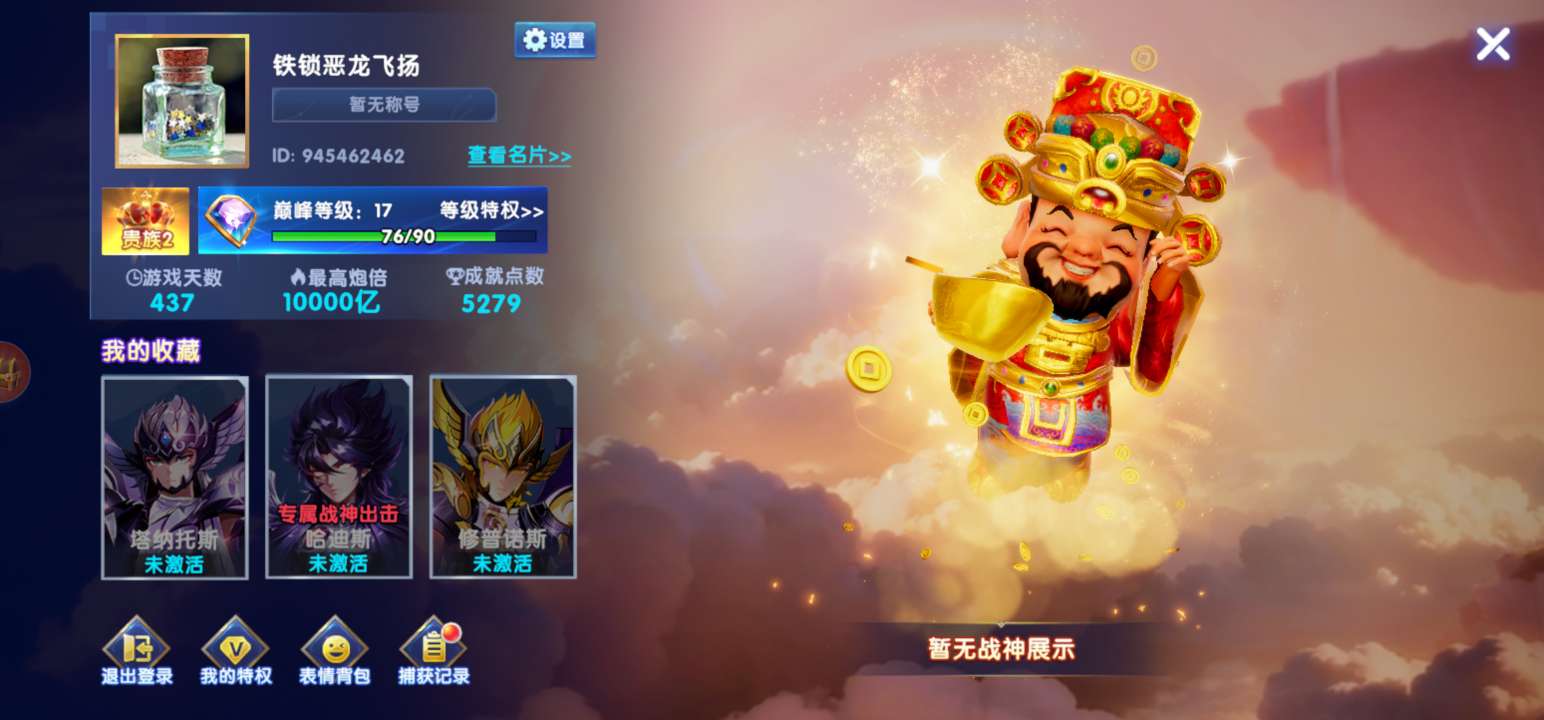 无绑v2,100+10炮6兆,巅峰17,月卡刚开,活动都在,有超能和吕布,8字头可改一切
