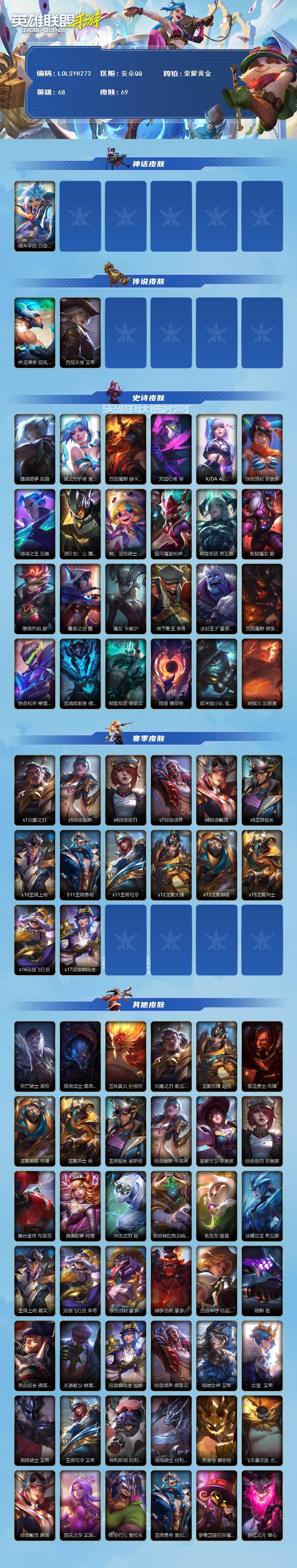 【LOLSYH272】68英雄/69皮肤/1神话/2传说/荣耀黄金/战斗学院 白金学长 伊泽瑞尔/神龙尊者 驭风啸龙 易/西部天使 艾希/摄魂猎手 凯隐/星之守护者 奥莉安娜/西部魔影 赫卡里姆/灭迹行者 烬/K/DA ALL OUT 伊芙琳/泳池派对 菲奥娜/战场之王 亚索/源计划:山 蕾欧娜/我,羽饰骑士 崔丝塔娜/银河魔装机神 希瓦娜/破败军团 希瓦娜/炼狱魔女 蔚/燎原烈焰 蔚/暮星之羽 霞/魔女 卡蜜尔/地下拳王 李青/冰封王子 蒙多医生/西部魔影 德莱厄斯/绝命机甲 格雷福斯/灵魂收
