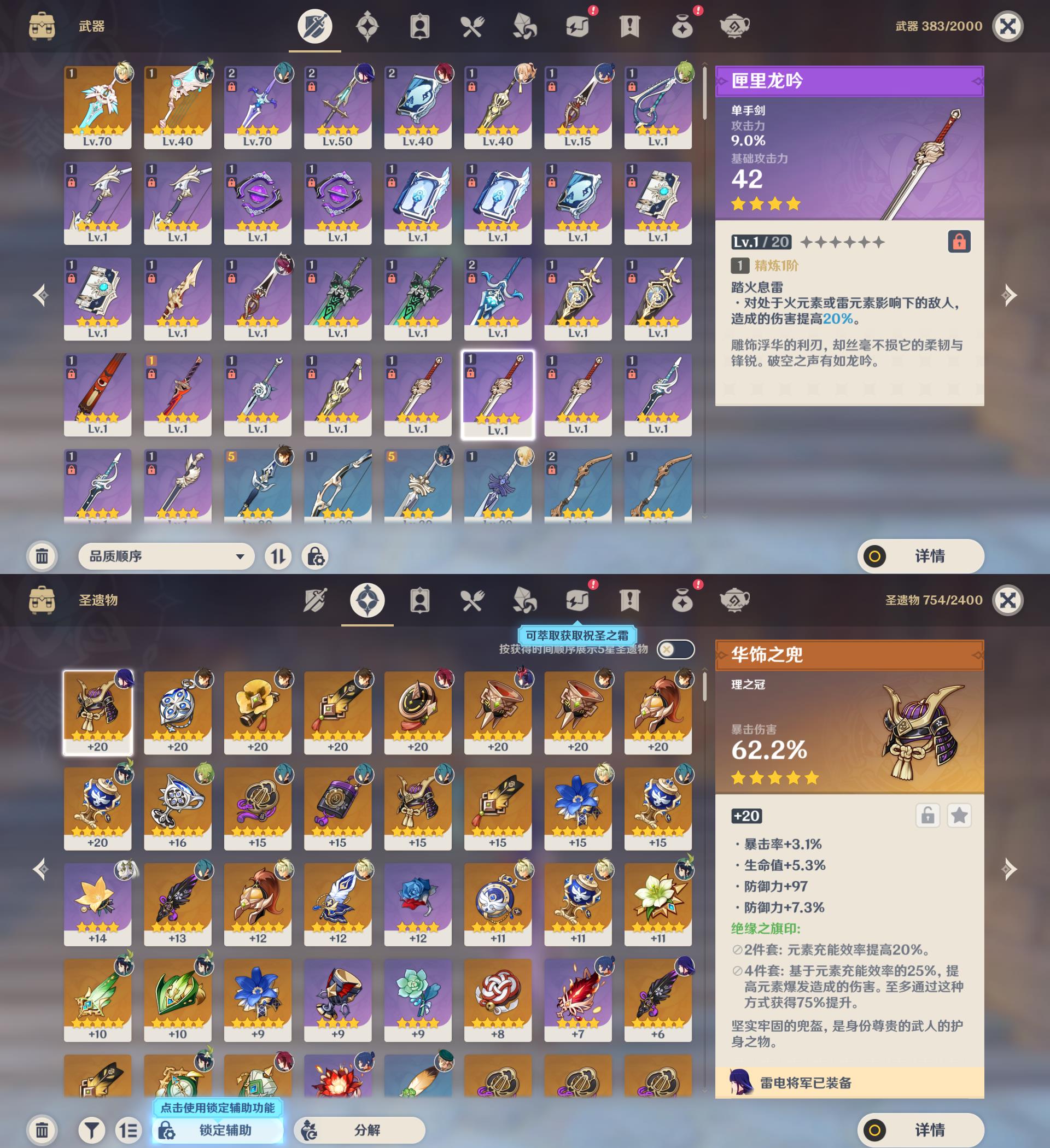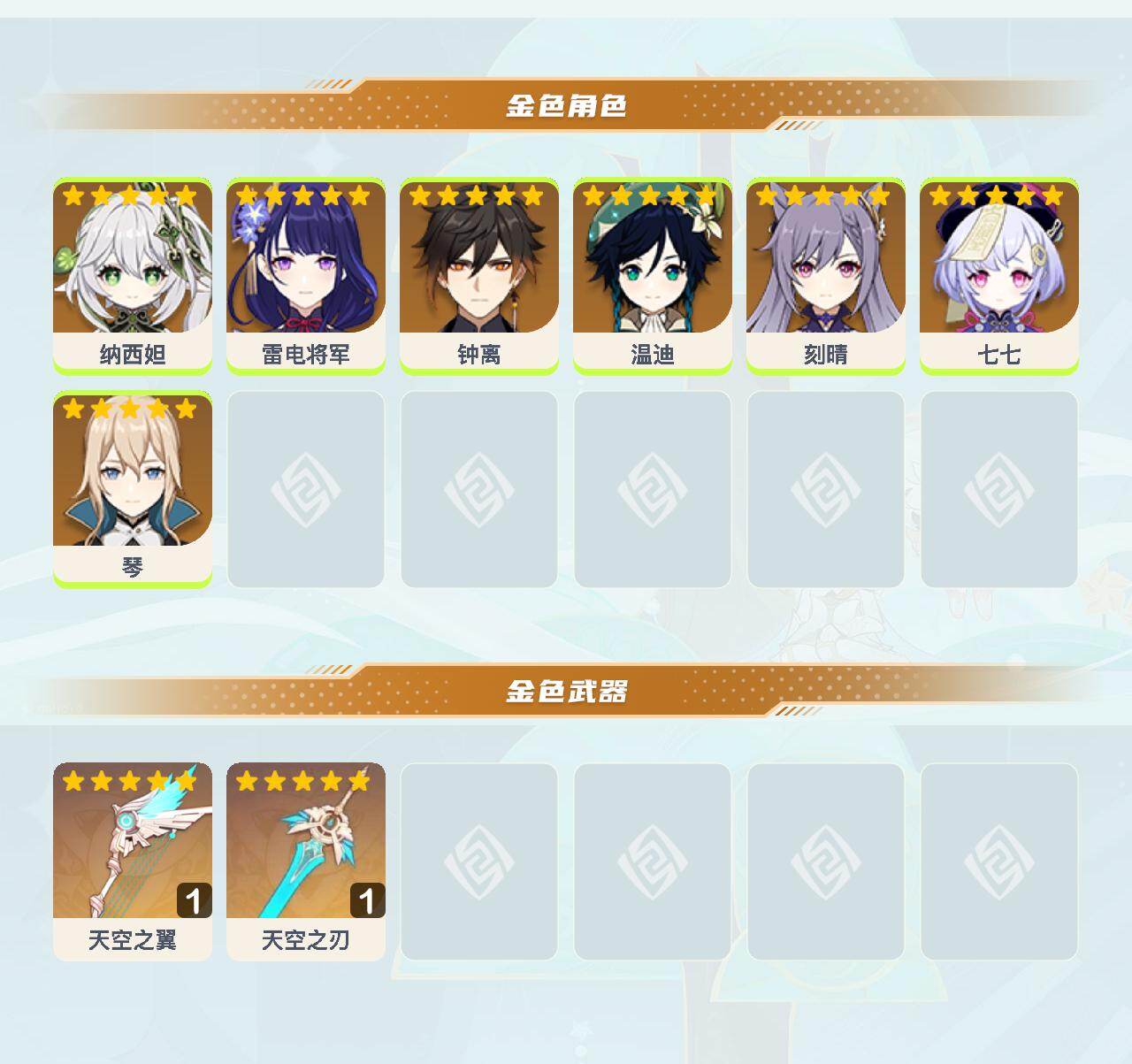 【YSZ3146】53级/9黄/女主/7个五星角色/2个五星武器/雷电将军/钟离/纳西妲/温迪/琴/七七/刻晴/天空之刃/天空之翼
