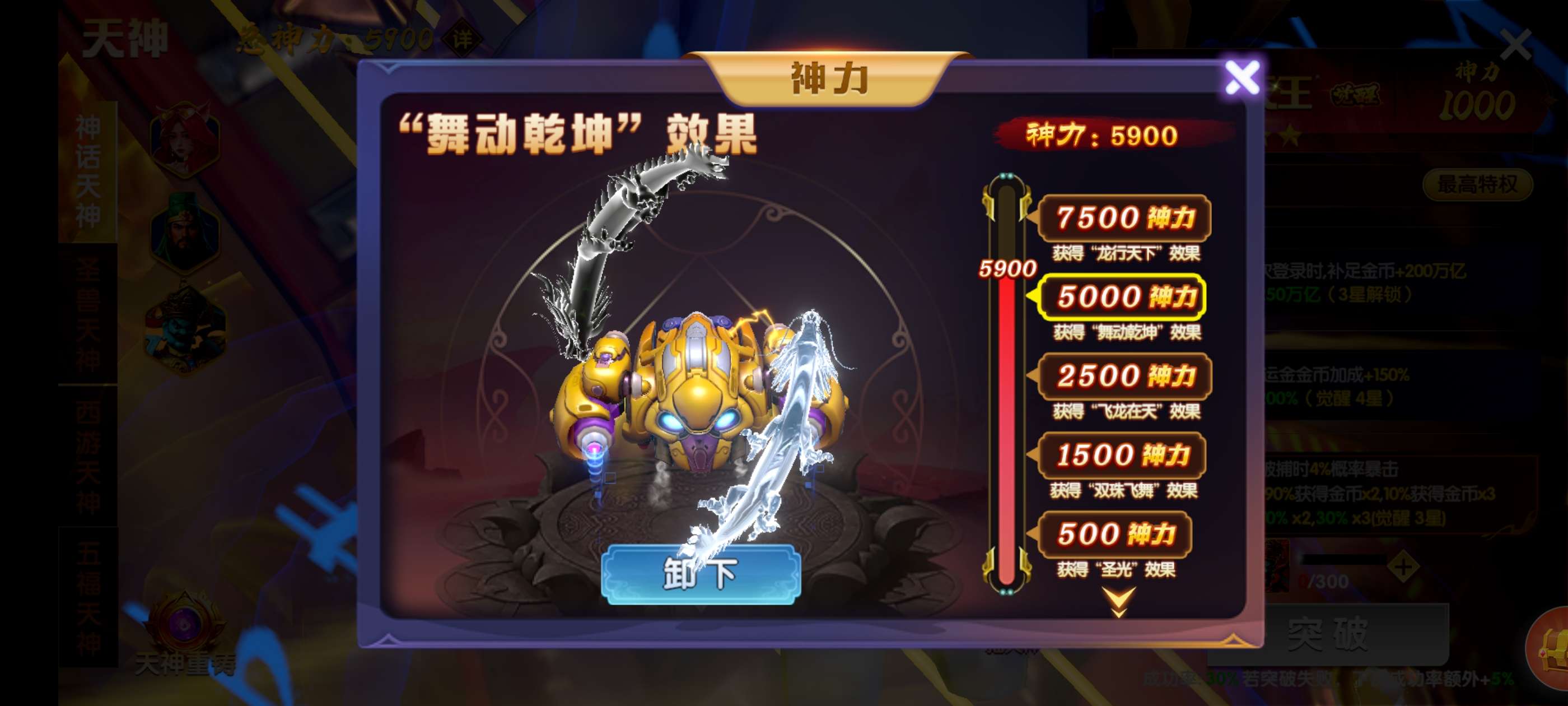575兆,2.5万炮神装30连击,天神全觉醒双龙,洪荒三级西游羁绊,15武神连击2400代羁绊,5座