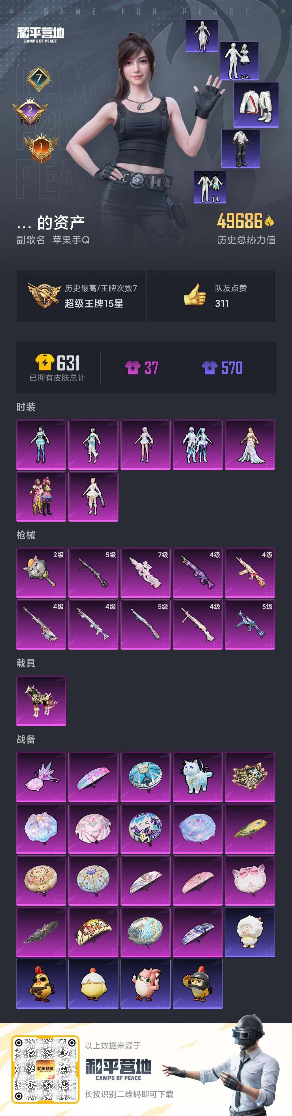 【公主妹妹号·猪妹·千金淑猫·荧海星豚·10特效枪·黑曜夜骑】苹果 手Q-7粉装-10特效枪-1载具-2粉色飞行器-49686热力值-7王牌印记-94套装-161枪皮