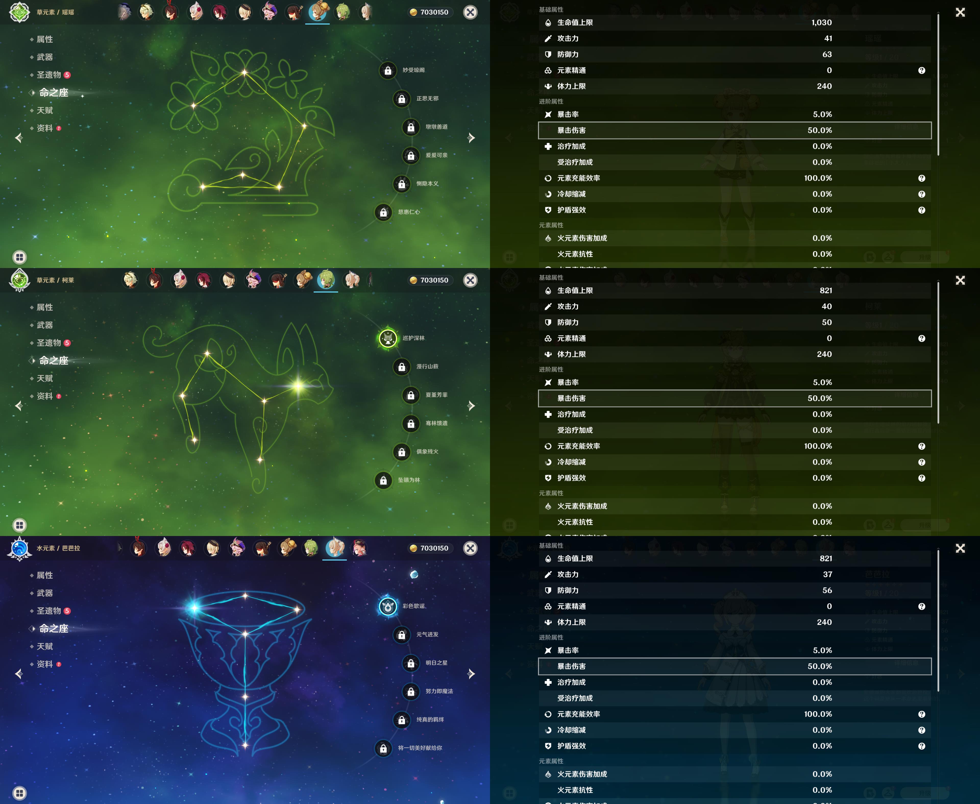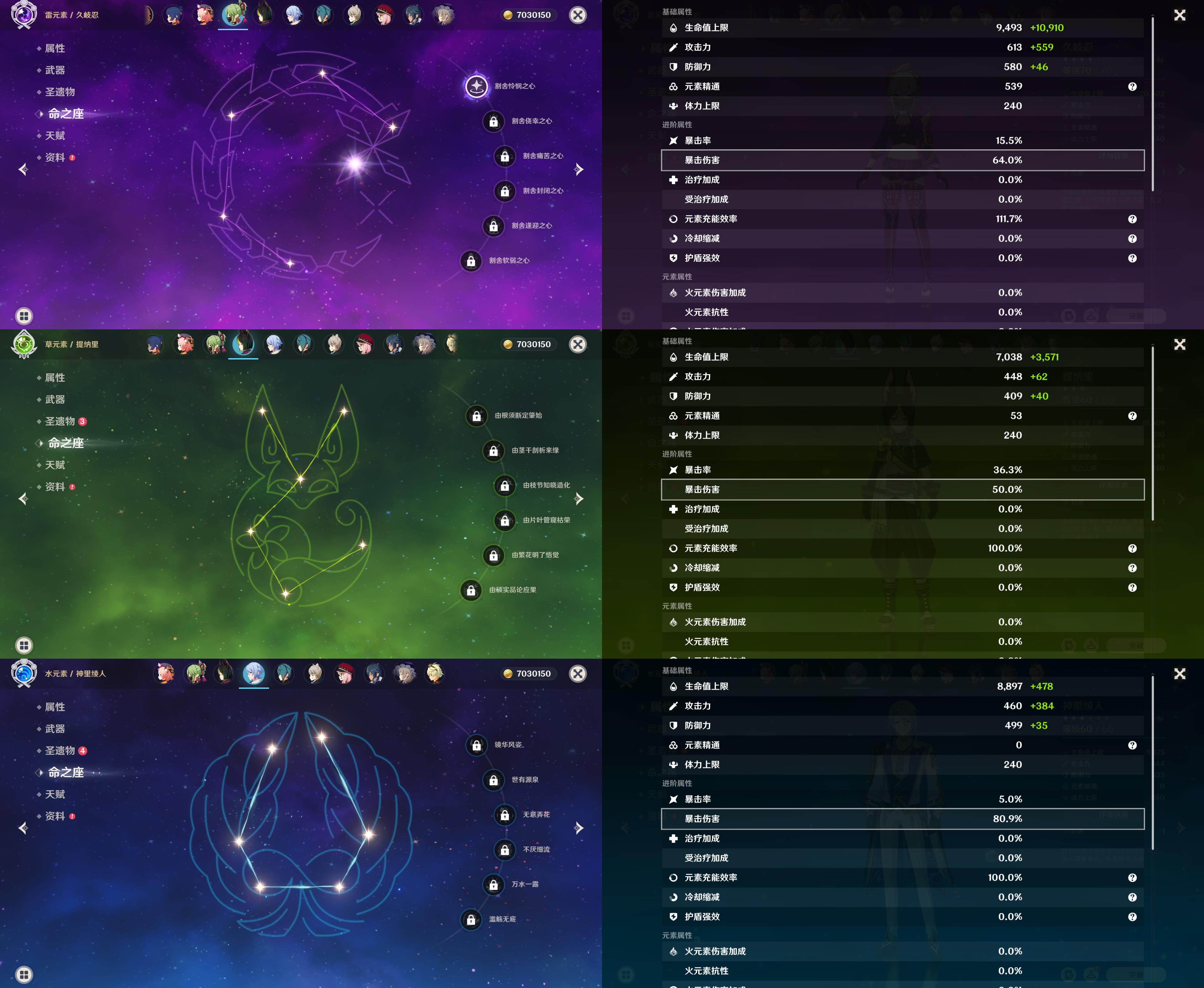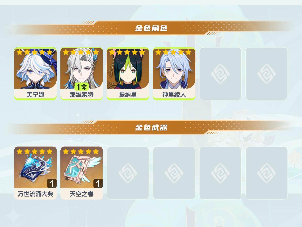 【YSZ3140】54级/7黄/女主/4个五星角色/2个五星武器/1命那维莱特/芙宁娜/提纳里/神里绫人/万世流涌大典/天空之卷