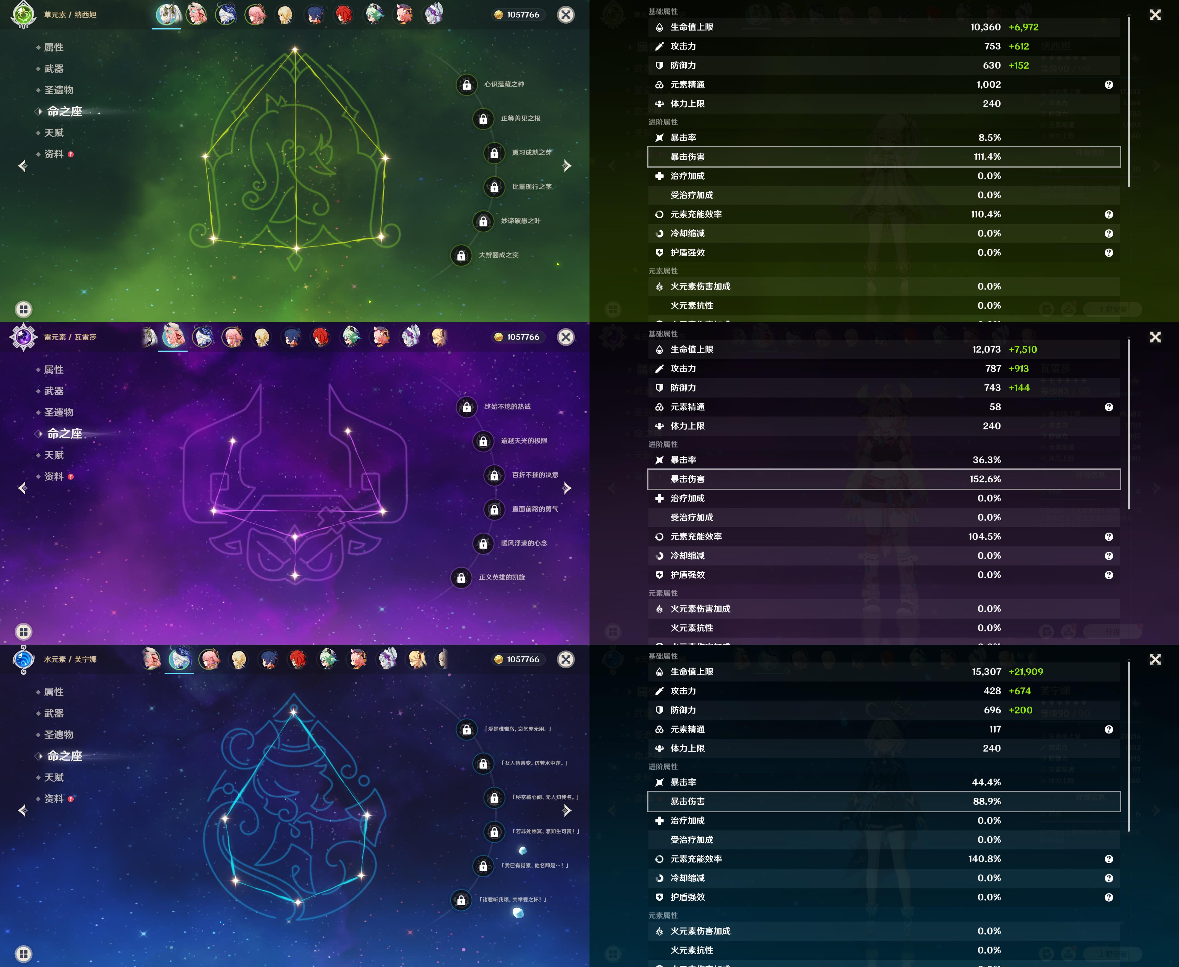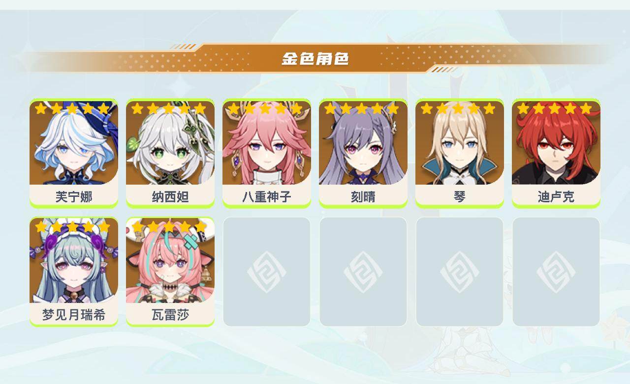 【YSZ3141】55级/8黄/女主/8个五星角色/纳西妲/0命瓦雷莎/芙宁娜/八重神子/迪卢克/梦见月瑞希/琴/刻晴